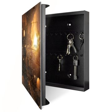 Bringe Ordnung und Eleganz in deinen Eingangsbereich mit dem banjado Schlüsselkasten Motiv Motiv Outer Space. Die moderne Schlüsselbox kombiniert funktionales Design mit hochwertiger Verarbeitung und wird so zu einem echten Hingucker in Flur, Büro oder Ferienwohnung. ✅ Stilvolle Schlüsselaufbewahrung mit Glasfront im Motiv Motiv Outer Space Der Design-Schlüsselkasten Motiv Motiv Outer Space bietet Platz für bis zu 50 Schlüssel, die auf 5 stabilen Reihen mit je 10 Haken übersichtlich verstaut werden. Mit seinen kompakten Maßen von 30 x 30 x 5 cm passt die Schlüsselbox perfekt auch in kleinere Räume. Der schwarz lackierte Stahlkorpus mit rechts angeschlagenem Türscharnier harmoniert mit der Glasfront und fügt sich nahtlos in jedes Wohnambiente ein. Ob als Schlüsselorganizer für Zuhause oder als praktische Lösung für Büros, Praxen und Gewerbe, der banjado Schlüsselkasten sorgt für Ordnung und Übersicht. Dank der magnetischen, mit Kreidestiften beschreibbaren Glasfront kannst du Notizen anheften oder Termine direkt auf der Oberfläche festhalten. Die Schlüsselbox Motiv Motiv Outer Space zur Wandmontage wird inklusive Befestigungsmaterial geliefert und ist schnell angebracht. So hast du deine Schlüssel jederzeit griffbereit und zugleich stilvoll verstaut. Mit diesem banjado Schlüsselkasten Motiv Motiv Outer Space kombinierst du praktische Aufbewahrung mit stilvollem Wohndesign. Ob privat oder geschäftlich, die Schlüsselbox sorgt für mehr Ordnung, Übersicht und ein wohnliches Ambiente.Vorteile im Überblick