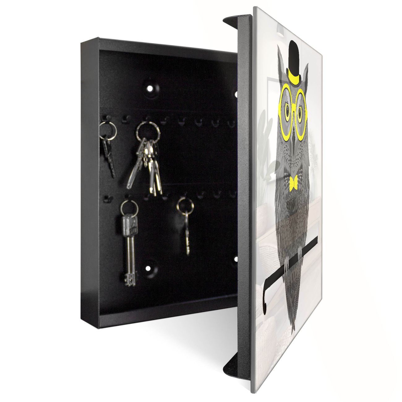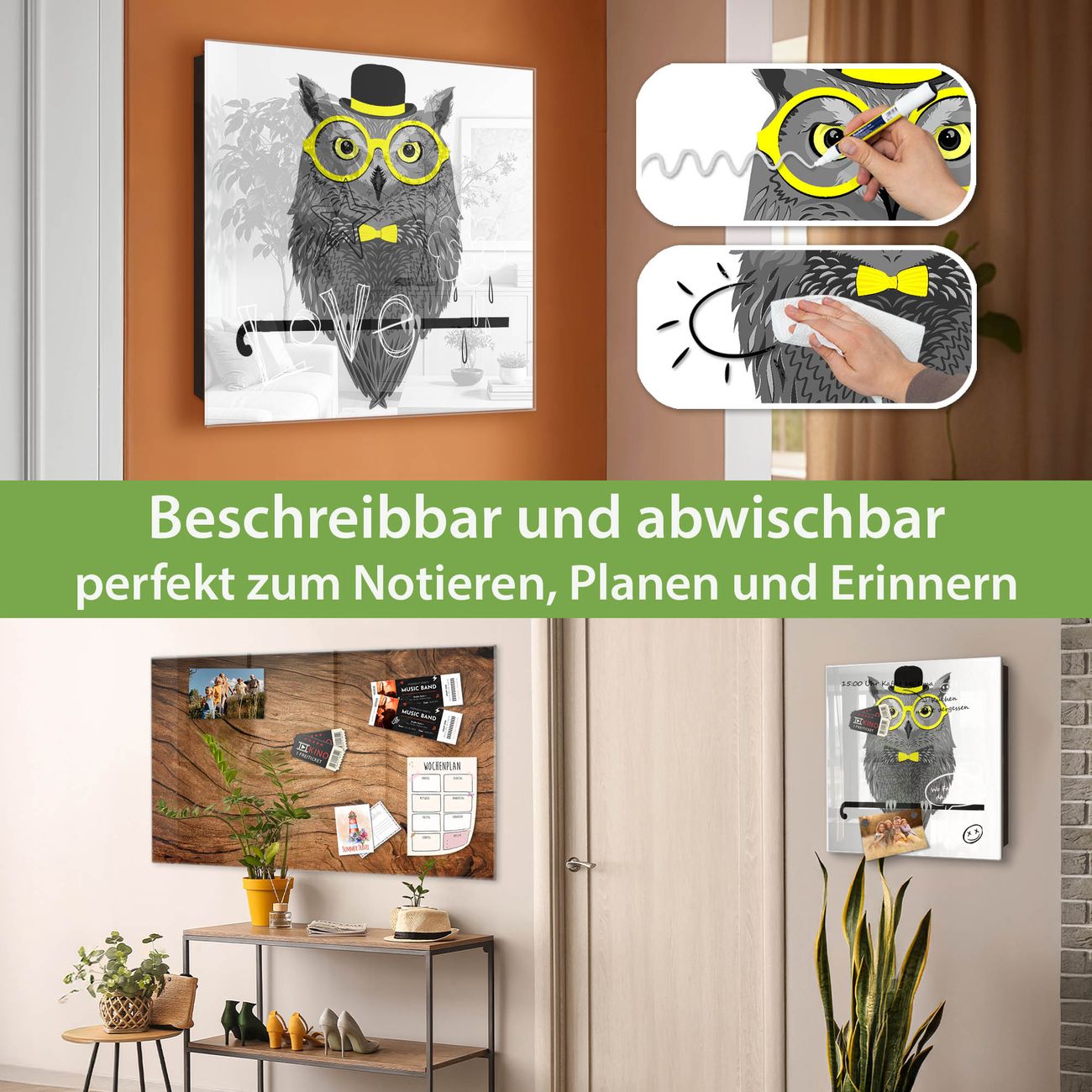 Bringe Ordnung und Eleganz in deinen Eingangsbereich mit dem banjado Schlüsselkasten Motiv Motiv Owling. Die moderne Schlüsselbox kombiniert funktionales Design mit hochwertiger Verarbeitung und wird so zu einem echten Hingucker in Flur, Büro oder Ferienwohnung. ✅ Stilvolle Schlüsselaufbewahrung mit Glasfront im Motiv Motiv Owling Der Design-Schlüsselkasten Motiv Motiv Owling bietet Platz für bis zu 50 Schlüssel, die auf 5 stabilen Reihen mit je 10 Haken übersichtlich verstaut werden. Mit seinen kompakten Maßen von 30 x 30 x 5 cm passt die Schlüsselbox perfekt auch in kleinere Räume. Der schwarz lackierte Stahlkorpus mit rechts angeschlagenem Türscharnier harmoniert mit der Glasfront und fügt sich nahtlos in jedes Wohnambiente ein. Ob als Schlüsselorganizer für Zuhause oder als praktische Lösung für Büros, Praxen und Gewerbe, der banjado Schlüsselkasten sorgt für Ordnung und Übersicht. Dank der magnetischen, mit Kreidestiften beschreibbaren Glasfront kannst du Notizen anheften oder Termine direkt auf der Oberfläche festhalten. Die Schlüsselbox Motiv Motiv Owling zur Wandmontage wird inklusive Befestigungsmaterial geliefert und ist schnell angebracht. So hast du deine Schlüssel jederzeit griffbereit und zugleich stilvoll verstaut. Mit diesem banjado Schlüsselkasten Motiv Motiv Owling kombinierst du praktische Aufbewahrung mit stilvollem Wohndesign. Ob privat oder geschäftlich, die Schlüsselbox sorgt für mehr Ordnung, Übersicht und ein wohnliches Ambiente.Vorteile im Überblick