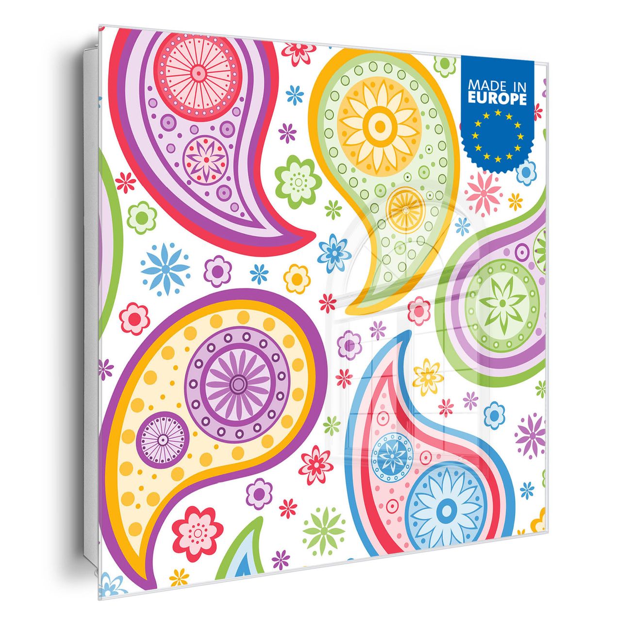 Bringe Ordnung und Eleganz in deinen Eingangsbereich mit dem banjado Schlüsselkasten Motiv Motiv Paisley bunt. Die moderne Schlüsselbox kombiniert funktionales Design mit hochwertiger Verarbeitung und wird so zu einem echten Hingucker in Flur, Büro oder Ferienwohnung. ✅ Stilvolle Schlüsselaufbewahrung mit Glasfront im Motiv Motiv Paisley bunt Der Design-Schlüsselkasten Motiv Motiv Paisley bunt bietet Platz für bis zu 50 Schlüssel, die auf 5 stabilen Reihen mit je 10 Haken übersichtlich verstaut werden. Mit seinen kompakten Maßen von 30 x 30 x 5 cm passt die Schlüsselbox perfekt auch in kleinere Räume. Der weiß lackierte Stahlkorpus mit rechts angeschlagenem Türscharnier harmoniert mit der Glasfront und fügt sich nahtlos in jedes Wohnambiente ein. Ob als Schlüsselorganizer für Zuhause oder als praktische Lösung für Büros, Praxen und Gewerbe, der banjado Schlüsselkasten sorgt für Ordnung und Übersicht. Dank der magnetischen, mit Kreidestiften beschreibbaren Glasfront kannst du Notizen anheften oder Termine direkt auf der Oberfläche festhalten. Die Schlüsselbox Motiv Motiv Paisley bunt zur Wandmontage wird inklusive Befestigungsmaterial geliefert und ist schnell angebracht. So hast du deine Schlüssel jederzeit griffbereit und zugleich stilvoll verstaut. Mit diesem banjado Schlüsselkasten Motiv Motiv Paisley bunt kombinierst du praktische Aufbewahrung mit stilvollem Wohndesign. Ob privat oder geschäftlich, die Schlüsselbox sorgt für mehr Ordnung, Übersicht und ein wohnliches Ambiente.Vorteile im Überblick