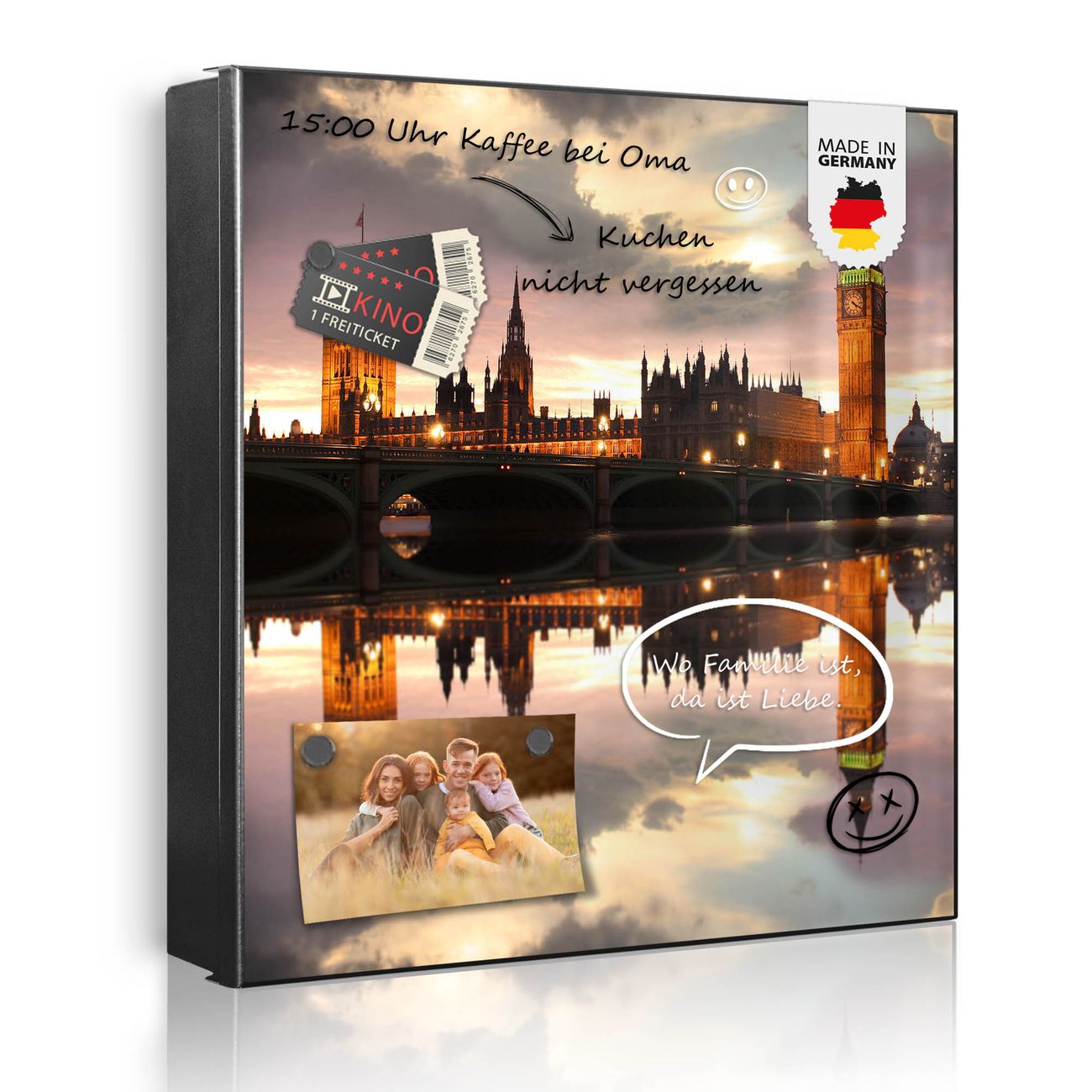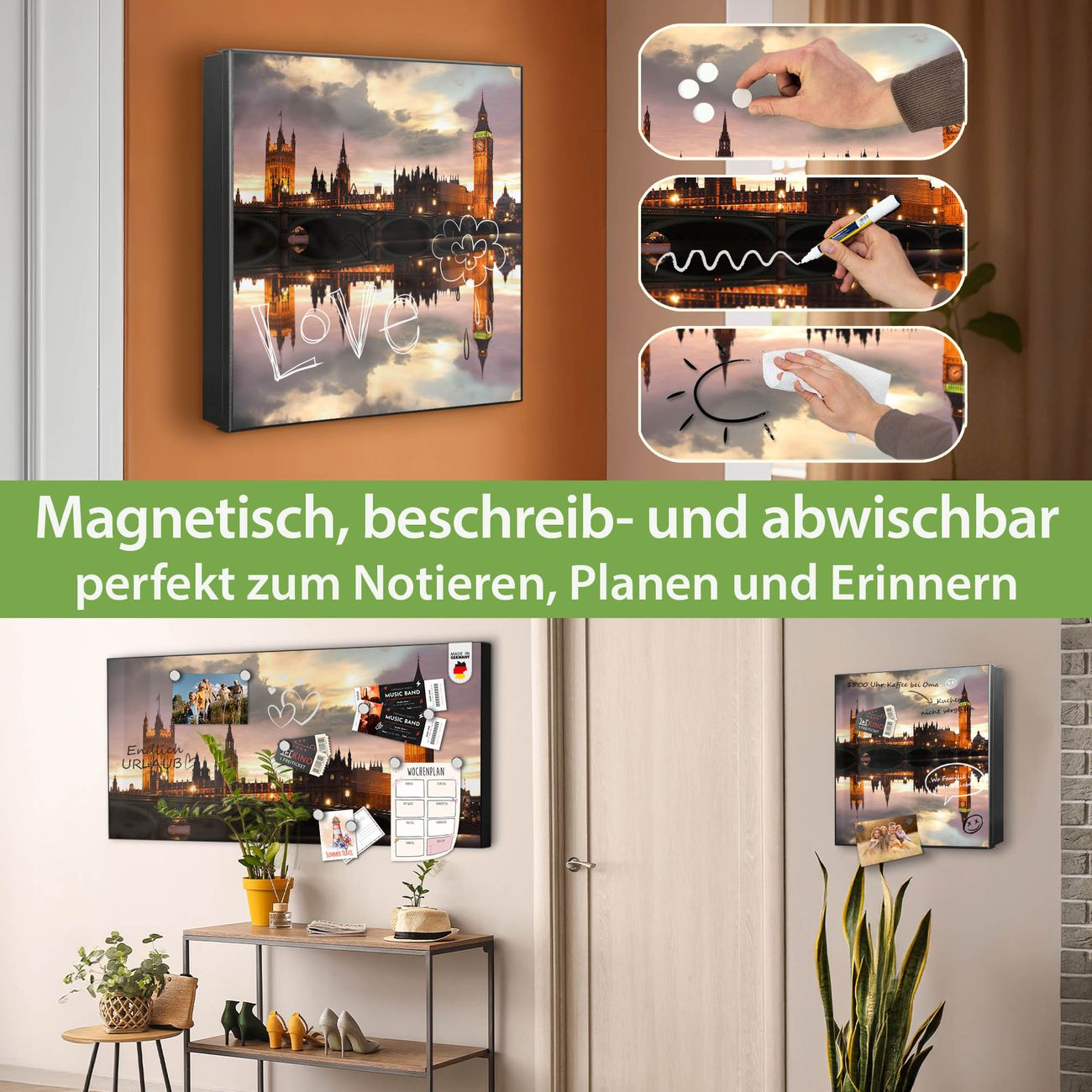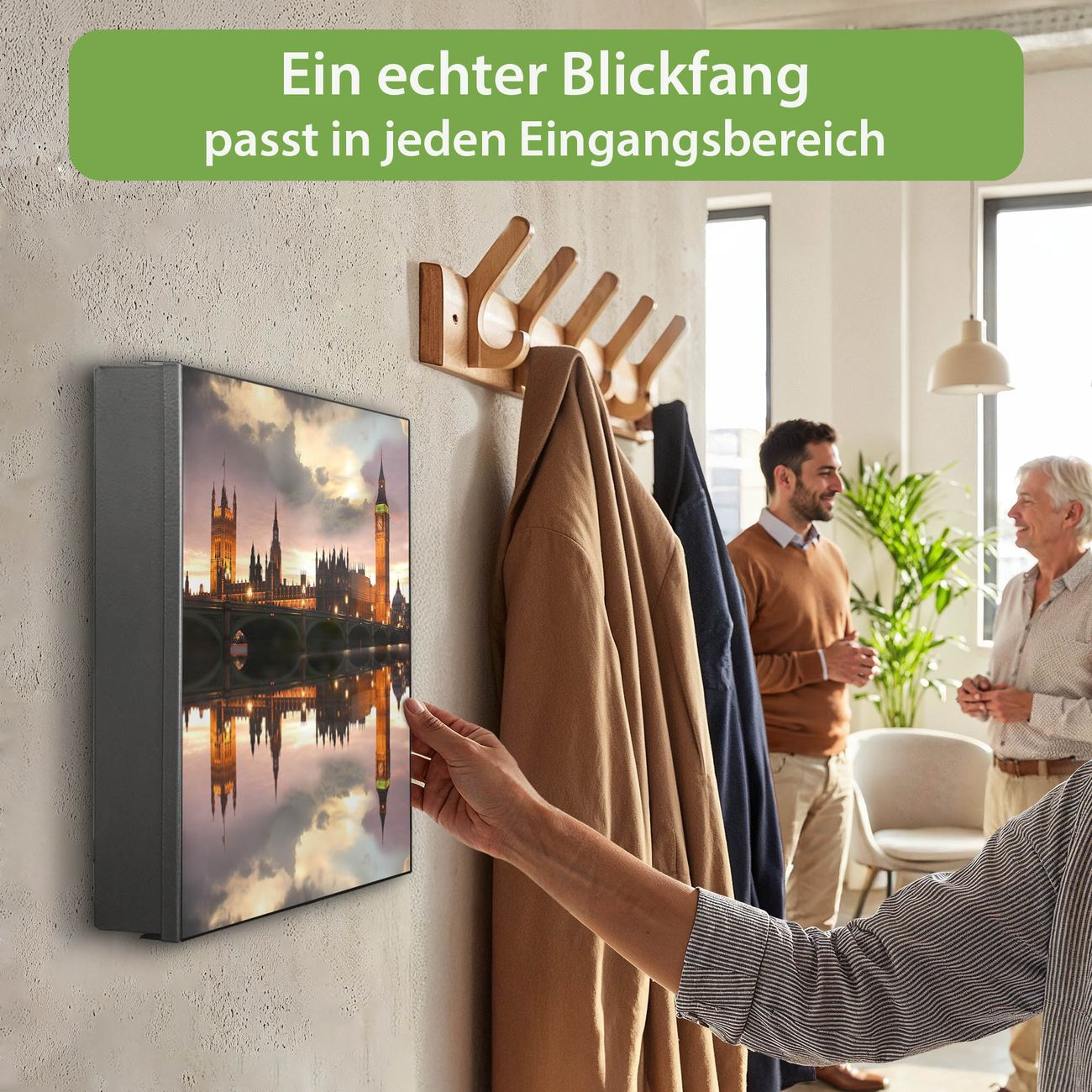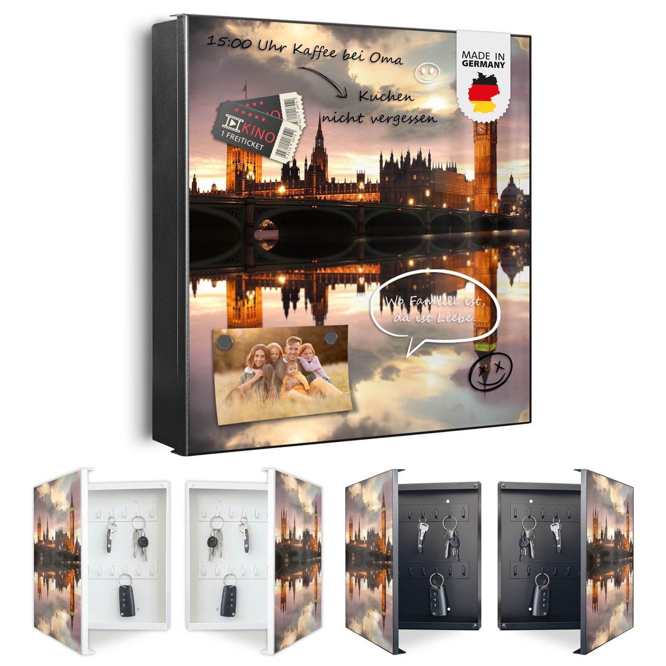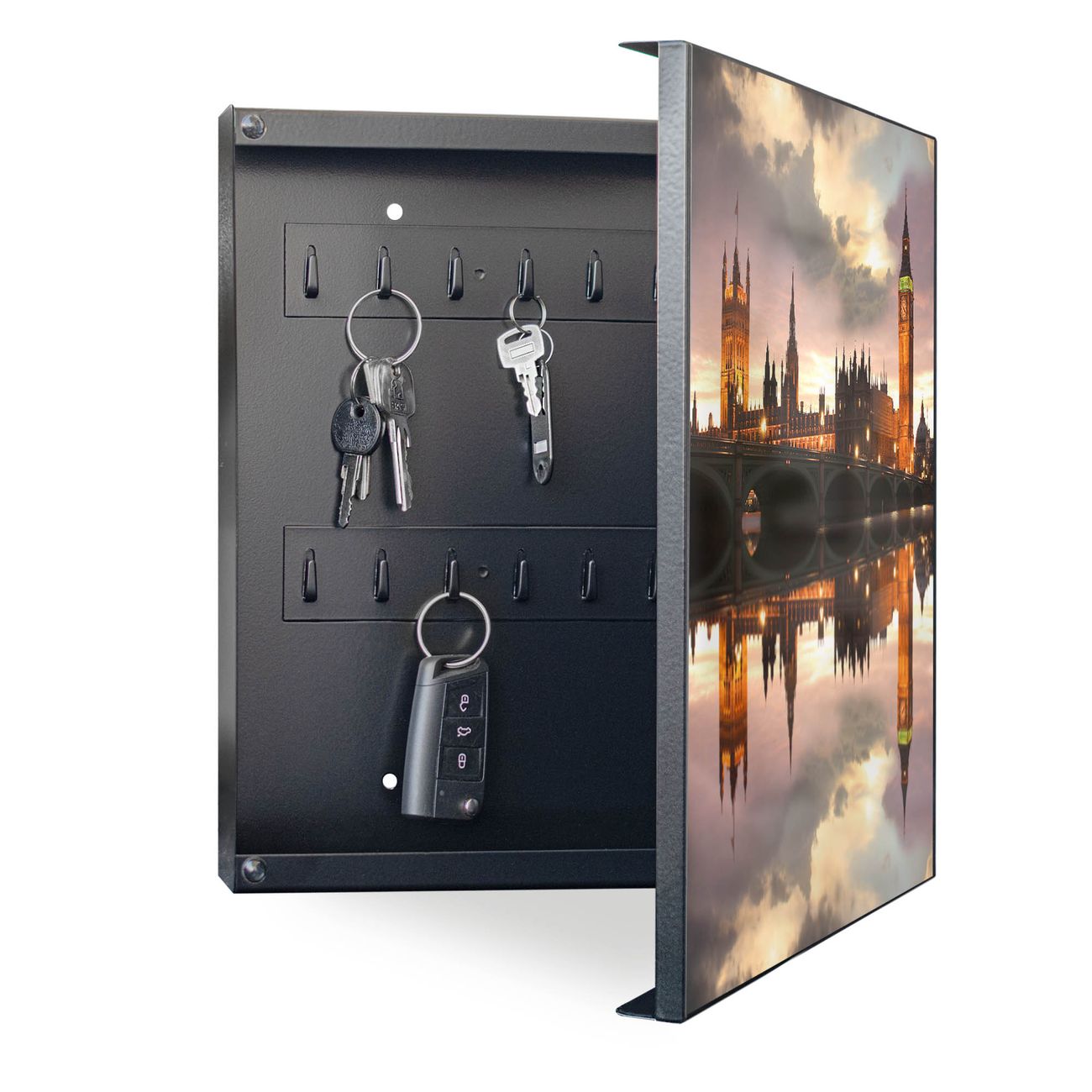 Bringe Ordnung und Eleganz in deinen Eingangsbereich mit dem banjado Schlüsselkasten Motiv Motiv Palace of Westminster. Die moderne Schlüsselbox kombiniert funktionales Design mit hochwertiger Verarbeitung und wird so zu einem echten Hingucker in Flur, Büro oder Ferienwohnung. ✅ Stilvolle Schlüsselaufbewahrung mit Motiv Motiv Palace of Westminster Der Design-Schlüsselkasten Motiv Motiv Palace of Westminster bietet Platz für bis zu 32 Schlüssel, die auf 4 stabilen Reihen mit je 8 Haken übersichtlich verstaut werden. Mit seinen kompakten Maßen von 30 x 30 x 5 cm passt die Schlüsselbox perfekt auch in kleinere Räume. Der schwarz lackierte Stahlkorpus mit rechts angeschlagenem Türscharnier harmoniert mit gedruckten Folie auf der Front und fügt sich nahtlos in jedes Wohnambiente ein. Ob als Schlüsselorganizer für Zuhause oder als praktische Lösung für Büros, Praxen und Gewerbe, der banjado Schlüsselkasten sorgt für Ordnung und Übersicht. Dank der magnetischen, mit Kreidestiften beschreibbaren Folie auf der Front kannst du Notizen anheften oder Termine direkt auf der Oberfläche festhalten. Die Schlüsselbox Motiv Motiv Palace of Westminster zur Wandmontage wird inklusive Befestigungsmaterial geliefert und ist schnell angebracht. So hast du deine Schlüssel jederzeit griffbereit und zugleich stilvoll verstaut. Mit diesem banjado Schlüsselkasten Motiv Motiv Palace of Westminster kombinierst du praktische Aufbewahrung mit stilvollem Wohndesign. Ob privat oder geschäftlich, die Schlüsselbox sorgt für mehr Ordnung, Übersicht und ein wohnliches Ambiente.Vorteile im Überblick