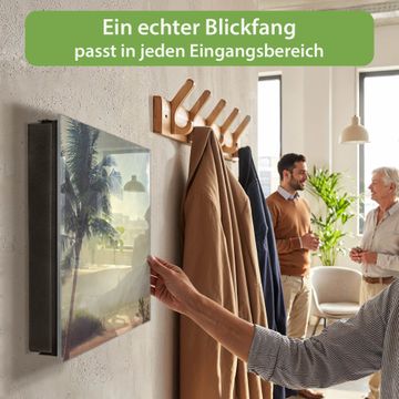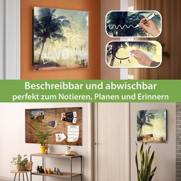Bringe Ordnung und Eleganz in deinen Eingangsbereich mit dem banjado Schlüsselkasten Motiv Motiv Palme am Strand. Die moderne Schlüsselbox kombiniert funktionales Design mit hochwertiger Verarbeitung und wird so zu einem echten Hingucker in Flur, Büro oder Ferienwohnung. ✅ Stilvolle Schlüsselaufbewahrung mit Glasfront im Motiv Motiv Palme am Strand Der Design-Schlüsselkasten Motiv Motiv Palme am Strand bietet Platz für bis zu 50 Schlüssel, die auf 5 stabilen Reihen mit je 10 Haken übersichtlich verstaut werden. Mit seinen kompakten Maßen von 30 x 30 x 5 cm passt die Schlüsselbox perfekt auch in kleinere Räume. Der schwarz lackierte Stahlkorpus mit rechts angeschlagenem Türscharnier harmoniert mit der Glasfront und fügt sich nahtlos in jedes Wohnambiente ein. Ob als Schlüsselorganizer für Zuhause oder als praktische Lösung für Büros, Praxen und Gewerbe, der banjado Schlüsselkasten sorgt für Ordnung und Übersicht. Dank der magnetischen, mit Kreidestiften beschreibbaren Glasfront kannst du Notizen anheften oder Termine direkt auf der Oberfläche festhalten. Die Schlüsselbox Motiv Motiv Palme am Strand zur Wandmontage wird inklusive Befestigungsmaterial geliefert und ist schnell angebracht. So hast du deine Schlüssel jederzeit griffbereit und zugleich stilvoll verstaut. Mit diesem banjado Schlüsselkasten Motiv Motiv Palme am Strand kombinierst du praktische Aufbewahrung mit stilvollem Wohndesign. Ob privat oder geschäftlich, die Schlüsselbox sorgt für mehr Ordnung, Übersicht und ein wohnliches Ambiente.Vorteile im Überblick