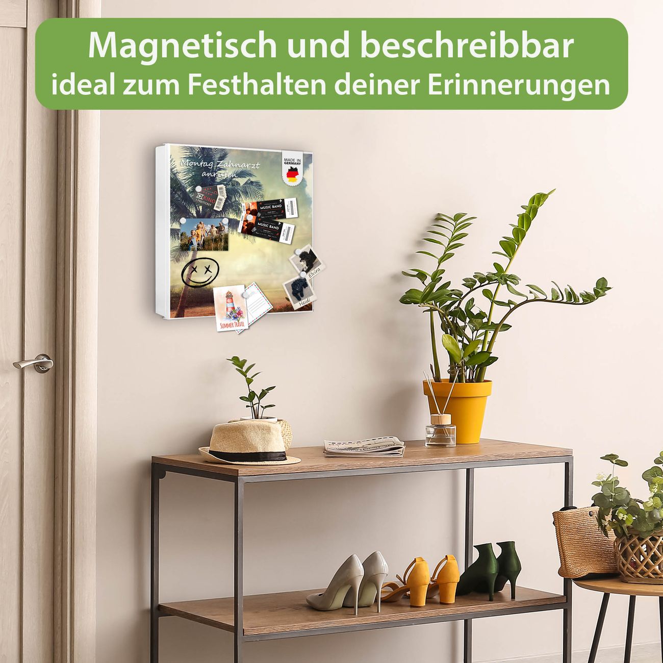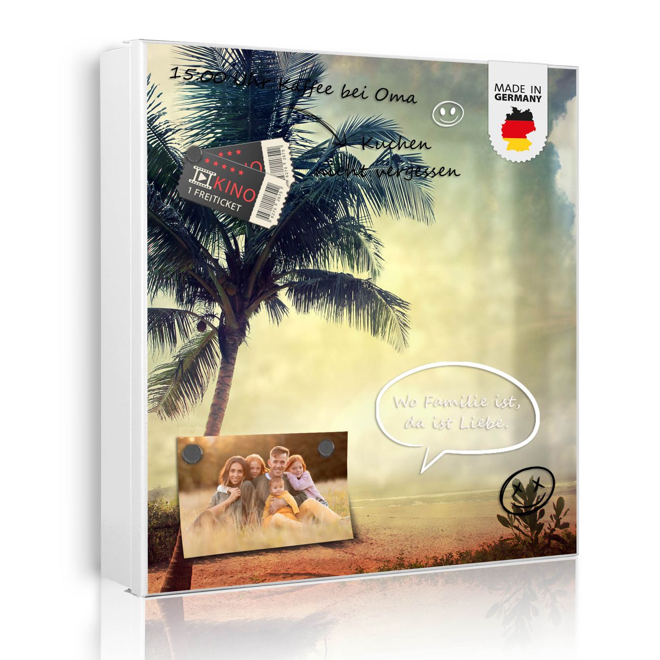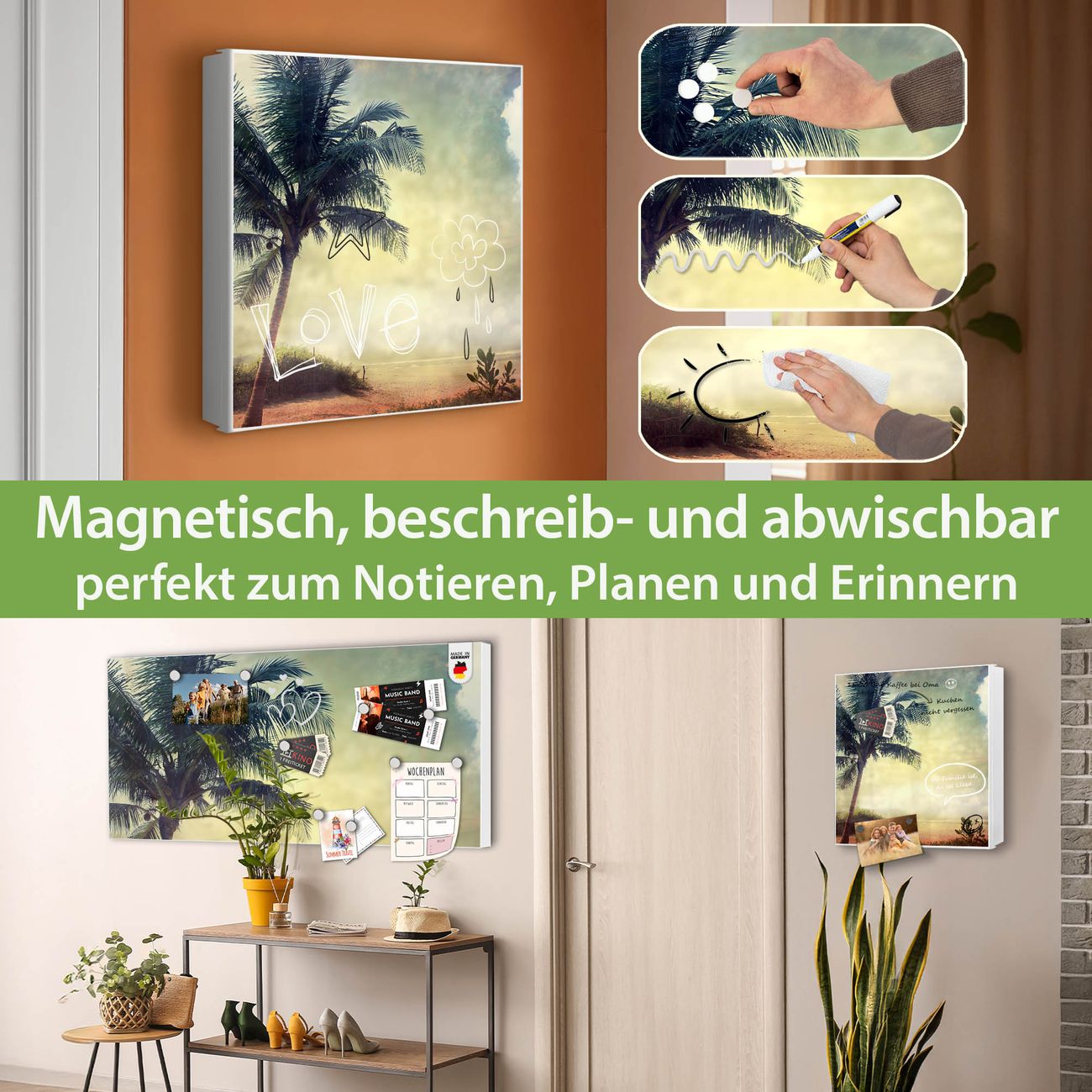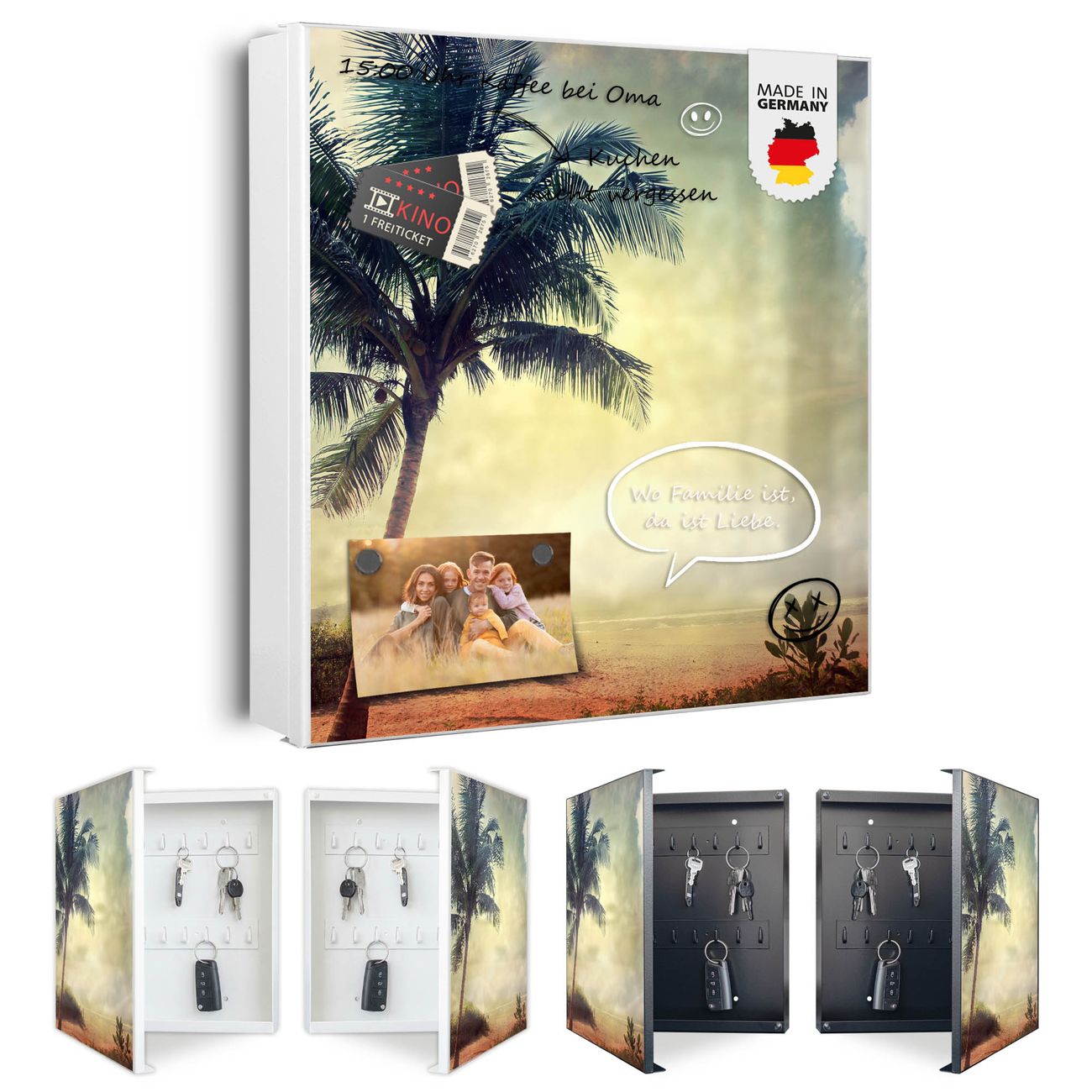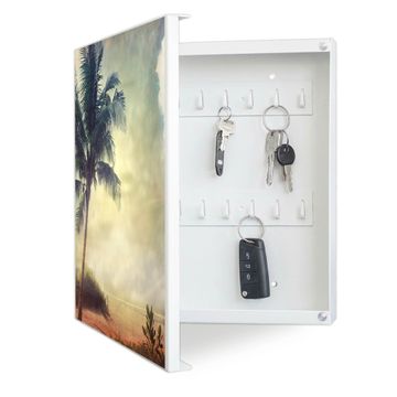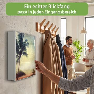 Bringe Ordnung und Eleganz in deinen Eingangsbereich mit dem banjado Schlüsselkasten Motiv Motiv Palme am Strand. Die moderne Schlüsselbox kombiniert funktionales Design mit hochwertiger Verarbeitung und wird so zu einem echten Hingucker in Flur, Büro oder Ferienwohnung. ✅ Stilvolle Schlüsselaufbewahrung mit Motiv Motiv Palme am Strand Der Design-Schlüsselkasten Motiv Motiv Palme am Strand bietet Platz für bis zu 32 Schlüssel, die auf 4 stabilen Reihen mit je 8 Haken übersichtlich verstaut werden. Mit seinen kompakten Maßen von 30 x 30 x 5 cm passt die Schlüsselbox perfekt auch in kleinere Räume. Der weiß lackierte Stahlkorpus mit links angeschlagenem Türscharnier harmoniert mit gedruckten Folie auf der Front und fügt sich nahtlos in jedes Wohnambiente ein. Ob als Schlüsselorganizer für Zuhause oder als praktische Lösung für Büros, Praxen und Gewerbe, der banjado Schlüsselkasten sorgt für Ordnung und Übersicht. Dank der magnetischen, mit Kreidestiften beschreibbaren Folie auf der Front kannst du Notizen anheften oder Termine direkt auf der Oberfläche festhalten. Die Schlüsselbox Motiv Motiv Palme am Strand zur Wandmontage wird inklusive Befestigungsmaterial geliefert und ist schnell angebracht. So hast du deine Schlüssel jederzeit griffbereit und zugleich stilvoll verstaut. Mit diesem banjado Schlüsselkasten Motiv Motiv Palme am Strand kombinierst du praktische Aufbewahrung mit stilvollem Wohndesign. Ob privat oder geschäftlich, die Schlüsselbox sorgt für mehr Ordnung, Übersicht und ein wohnliches Ambiente.Vorteile im Überblick