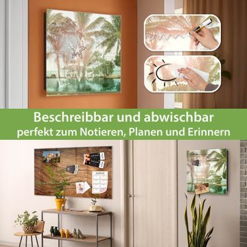 Bringe Ordnung und Eleganz in deinen Eingangsbereich mit dem banjado Schlüsselkasten Motiv Motiv Palmen. Die moderne Schlüsselbox kombiniert funktionales Design mit hochwertiger Verarbeitung und wird so zu einem echten Hingucker in Flur, Büro oder Ferienwohnung. ✅ Stilvolle Schlüsselaufbewahrung mit Glasfront im Motiv Motiv Palmen Der Design-Schlüsselkasten Motiv Motiv Palmen bietet Platz für bis zu 50 Schlüssel, die auf 5 stabilen Reihen mit je 10 Haken übersichtlich verstaut werden. Mit seinen kompakten Maßen von 30 x 30 x 5 cm passt die Schlüsselbox perfekt auch in kleinere Räume. Der schwarz lackierte Stahlkorpus mit rechts angeschlagenem Türscharnier harmoniert mit der Glasfront und fügt sich nahtlos in jedes Wohnambiente ein. Ob als Schlüsselorganizer für Zuhause oder als praktische Lösung für Büros, Praxen und Gewerbe, der banjado Schlüsselkasten sorgt für Ordnung und Übersicht. Dank der magnetischen, mit Kreidestiften beschreibbaren Glasfront kannst du Notizen anheften oder Termine direkt auf der Oberfläche festhalten. Die Schlüsselbox Motiv Motiv Palmen zur Wandmontage wird inklusive Befestigungsmaterial geliefert und ist schnell angebracht. So hast du deine Schlüssel jederzeit griffbereit und zugleich stilvoll verstaut. Mit diesem banjado Schlüsselkasten Motiv Motiv Palmen kombinierst du praktische Aufbewahrung mit stilvollem Wohndesign. Ob privat oder geschäftlich, die Schlüsselbox sorgt für mehr Ordnung, Übersicht und ein wohnliches Ambiente.Vorteile im Überblick