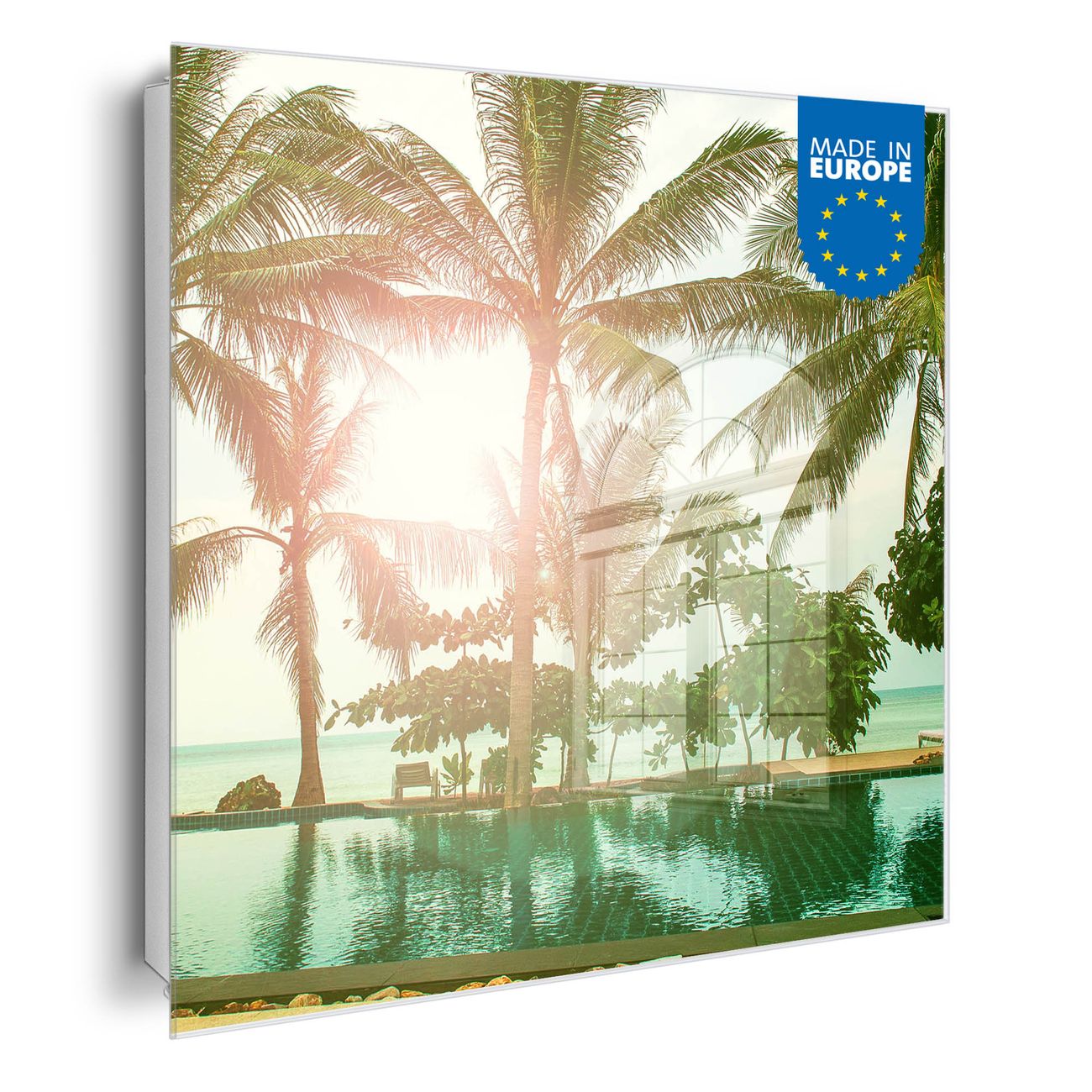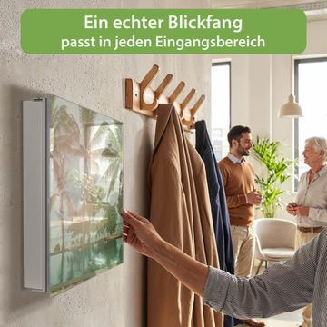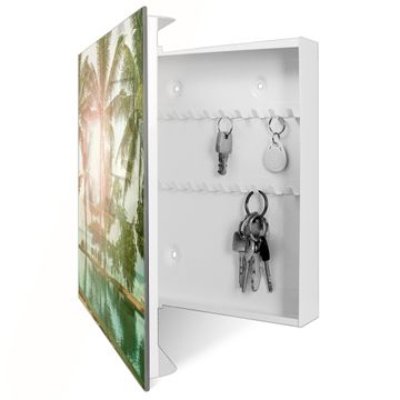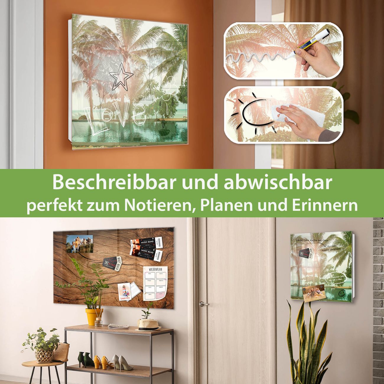 Bringe Ordnung und Eleganz in deinen Eingangsbereich mit dem banjado Schlüsselkasten Motiv Motiv Palmen. Die moderne Schlüsselbox kombiniert funktionales Design mit hochwertiger Verarbeitung und wird so zu einem echten Hingucker in Flur, Büro oder Ferienwohnung. ✅ Stilvolle Schlüsselaufbewahrung mit Glasfront im Motiv Motiv Palmen Der Design-Schlüsselkasten Motiv Motiv Palmen bietet Platz für bis zu 50 Schlüssel, die auf 5 stabilen Reihen mit je 10 Haken übersichtlich verstaut werden. Mit seinen kompakten Maßen von 30 x 30 x 5 cm passt die Schlüsselbox perfekt auch in kleinere Räume. Der weiß lackierte Stahlkorpus mit rechts angeschlagenem Türscharnier harmoniert mit der Glasfront und fügt sich nahtlos in jedes Wohnambiente ein. Ob als Schlüsselorganizer für Zuhause oder als praktische Lösung für Büros, Praxen und Gewerbe, der banjado Schlüsselkasten sorgt für Ordnung und Übersicht. Dank der magnetischen, mit Kreidestiften beschreibbaren Glasfront kannst du Notizen anheften oder Termine direkt auf der Oberfläche festhalten. Die Schlüsselbox Motiv Motiv Palmen zur Wandmontage wird inklusive Befestigungsmaterial geliefert und ist schnell angebracht. So hast du deine Schlüssel jederzeit griffbereit und zugleich stilvoll verstaut. Mit diesem banjado Schlüsselkasten Motiv Motiv Palmen kombinierst du praktische Aufbewahrung mit stilvollem Wohndesign. Ob privat oder geschäftlich, die Schlüsselbox sorgt für mehr Ordnung, Übersicht und ein wohnliches Ambiente.Vorteile im Überblick