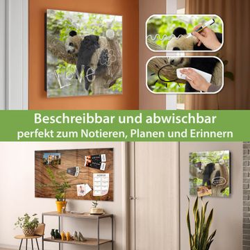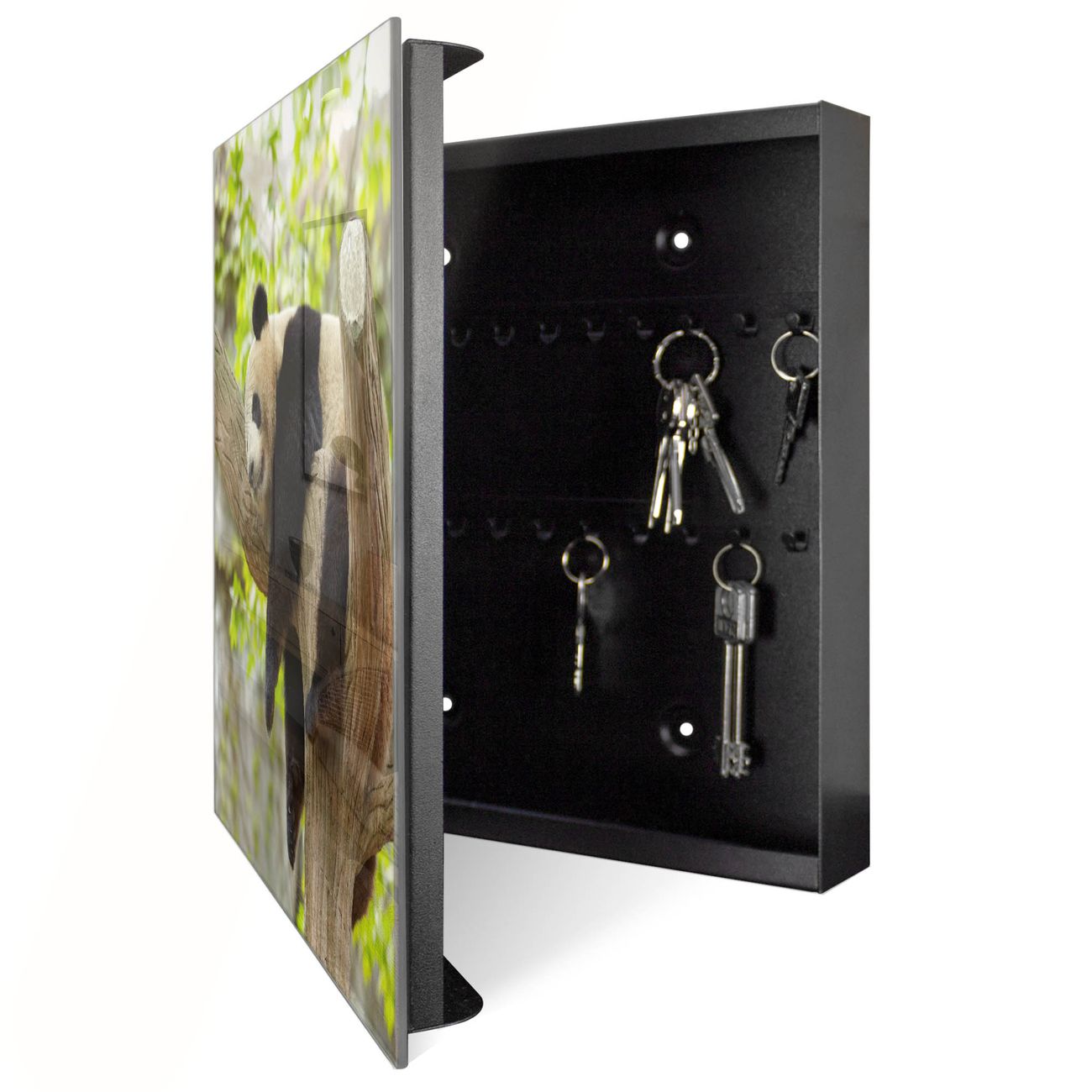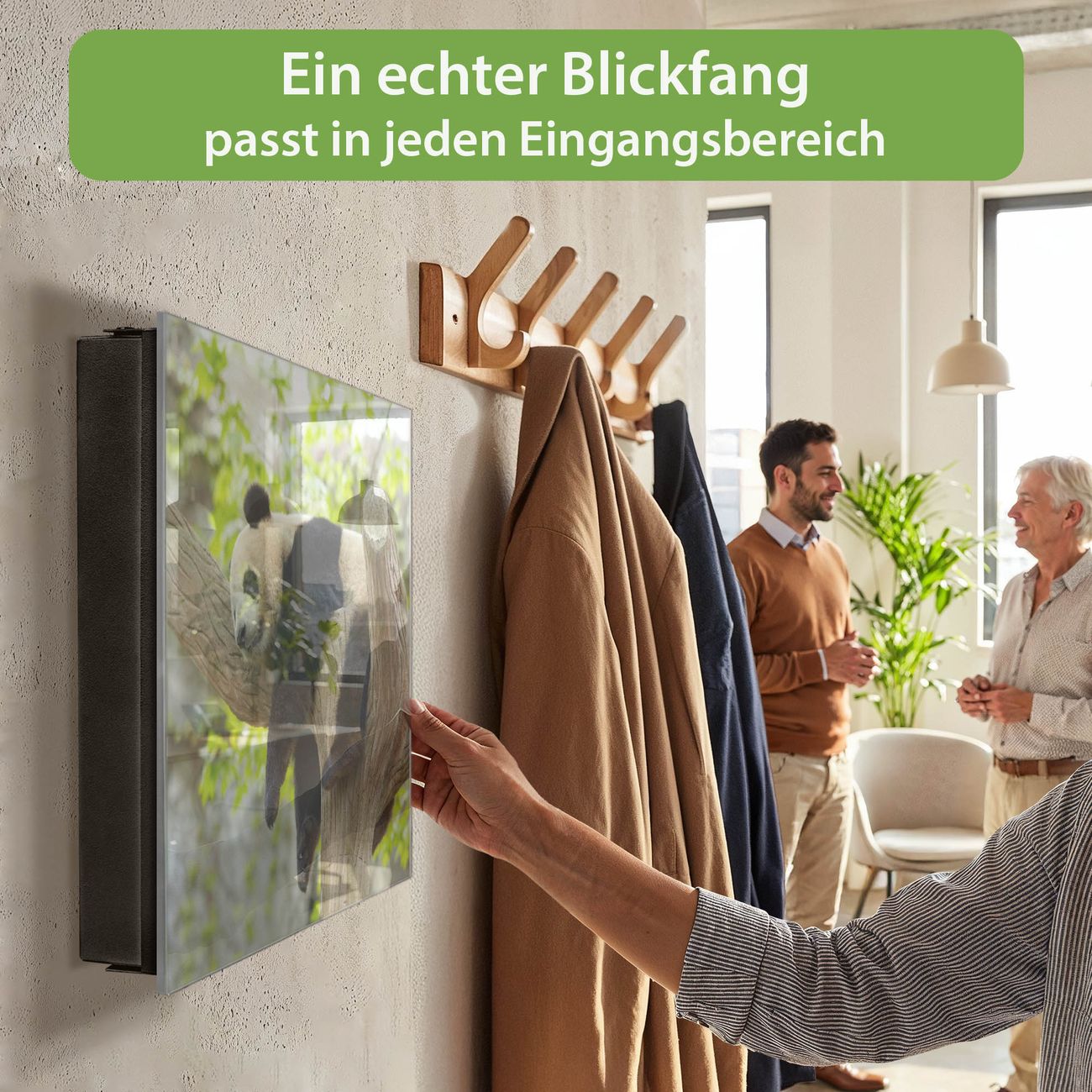 Bringe Ordnung und Eleganz in deinen Eingangsbereich mit dem banjado Schlüsselkasten Motiv Motiv Panda. Die moderne Schlüsselbox kombiniert funktionales Design mit hochwertiger Verarbeitung und wird so zu einem echten Hingucker in Flur, Büro oder Ferienwohnung. ✅ Stilvolle Schlüsselaufbewahrung mit Glasfront im Motiv Motiv Panda Der Design-Schlüsselkasten Motiv Motiv Panda bietet Platz für bis zu 50 Schlüssel, die auf 5 stabilen Reihen mit je 10 Haken übersichtlich verstaut werden. Mit seinen kompakten Maßen von 30 x 30 x 5 cm passt die Schlüsselbox perfekt auch in kleinere Räume. Der schwarz lackierte Stahlkorpus mit rechts angeschlagenem Türscharnier harmoniert mit der Glasfront und fügt sich nahtlos in jedes Wohnambiente ein. Ob als Schlüsselorganizer für Zuhause oder als praktische Lösung für Büros, Praxen und Gewerbe, der banjado Schlüsselkasten sorgt für Ordnung und Übersicht. Dank der magnetischen, mit Kreidestiften beschreibbaren Glasfront kannst du Notizen anheften oder Termine direkt auf der Oberfläche festhalten. Die Schlüsselbox Motiv Motiv Panda zur Wandmontage wird inklusive Befestigungsmaterial geliefert und ist schnell angebracht. So hast du deine Schlüssel jederzeit griffbereit und zugleich stilvoll verstaut. Mit diesem banjado Schlüsselkasten Motiv Motiv Panda kombinierst du praktische Aufbewahrung mit stilvollem Wohndesign. Ob privat oder geschäftlich, die Schlüsselbox sorgt für mehr Ordnung, Übersicht und ein wohnliches Ambiente.Vorteile im Überblick