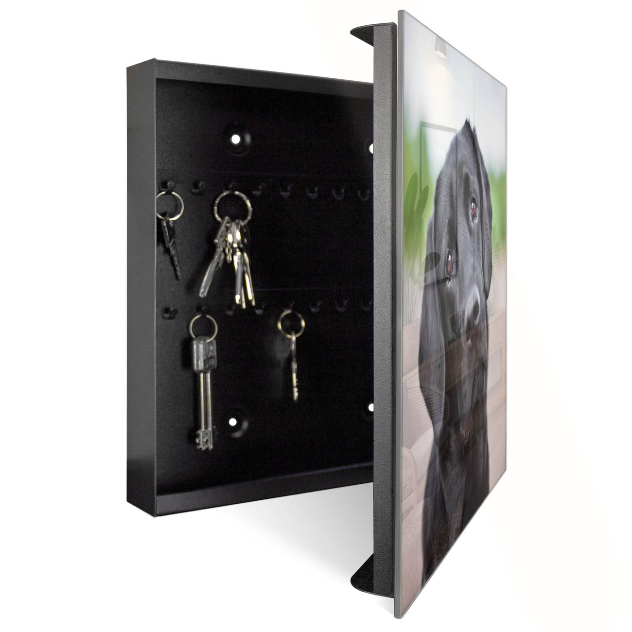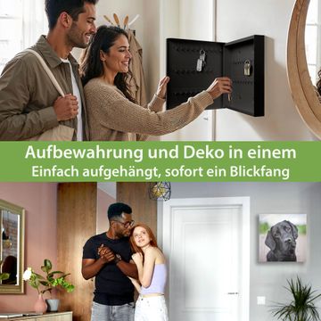 Bringe Ordnung und Eleganz in deinen Eingangsbereich mit dem banjado Schlüsselkasten Motiv Motiv Paolo. Die moderne Schlüsselbox kombiniert funktionales Design mit hochwertiger Verarbeitung und wird so zu einem echten Hingucker in Flur, Büro oder Ferienwohnung. ✅ Stilvolle Schlüsselaufbewahrung mit Glasfront im Motiv Motiv Paolo Der Design-Schlüsselkasten Motiv Motiv Paolo bietet Platz für bis zu 50 Schlüssel, die auf 5 stabilen Reihen mit je 10 Haken übersichtlich verstaut werden. Mit seinen kompakten Maßen von 30 x 30 x 5 cm passt die Schlüsselbox perfekt auch in kleinere Räume. Der schwarz lackierte Stahlkorpus mit rechts angeschlagenem Türscharnier harmoniert mit der Glasfront und fügt sich nahtlos in jedes Wohnambiente ein. Ob als Schlüsselorganizer für Zuhause oder als praktische Lösung für Büros, Praxen und Gewerbe, der banjado Schlüsselkasten sorgt für Ordnung und Übersicht. Dank der magnetischen, mit Kreidestiften beschreibbaren Glasfront kannst du Notizen anheften oder Termine direkt auf der Oberfläche festhalten. Die Schlüsselbox Motiv Motiv Paolo zur Wandmontage wird inklusive Befestigungsmaterial geliefert und ist schnell angebracht. So hast du deine Schlüssel jederzeit griffbereit und zugleich stilvoll verstaut. Mit diesem banjado Schlüsselkasten Motiv Motiv Paolo kombinierst du praktische Aufbewahrung mit stilvollem Wohndesign. Ob privat oder geschäftlich, die Schlüsselbox sorgt für mehr Ordnung, Übersicht und ein wohnliches Ambiente.Vorteile im Überblick