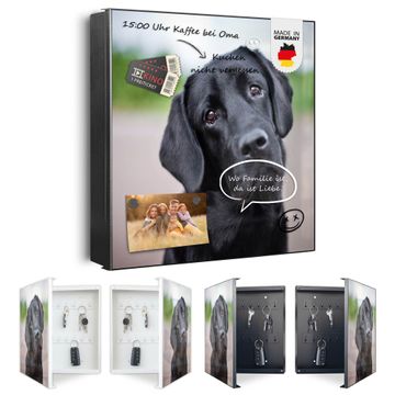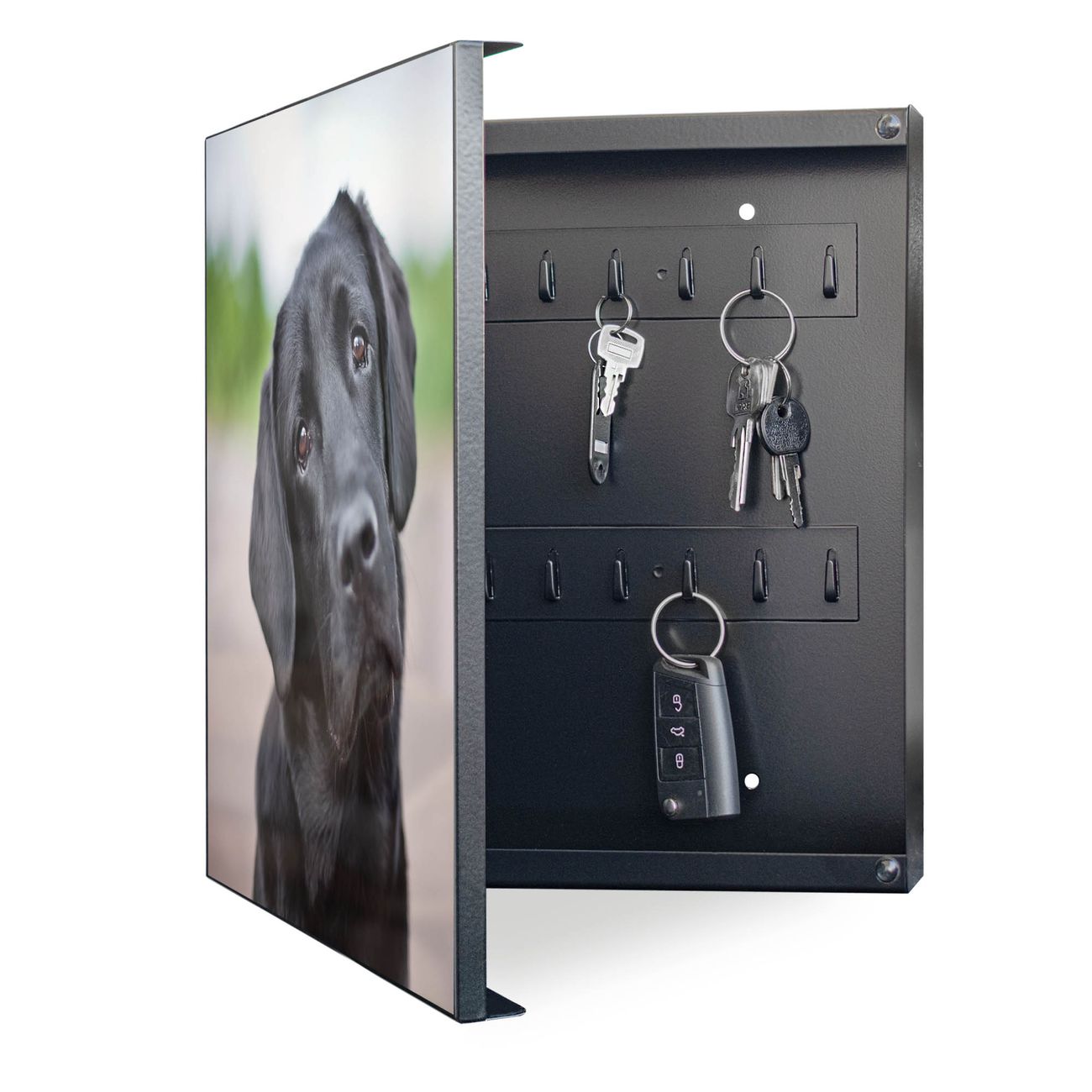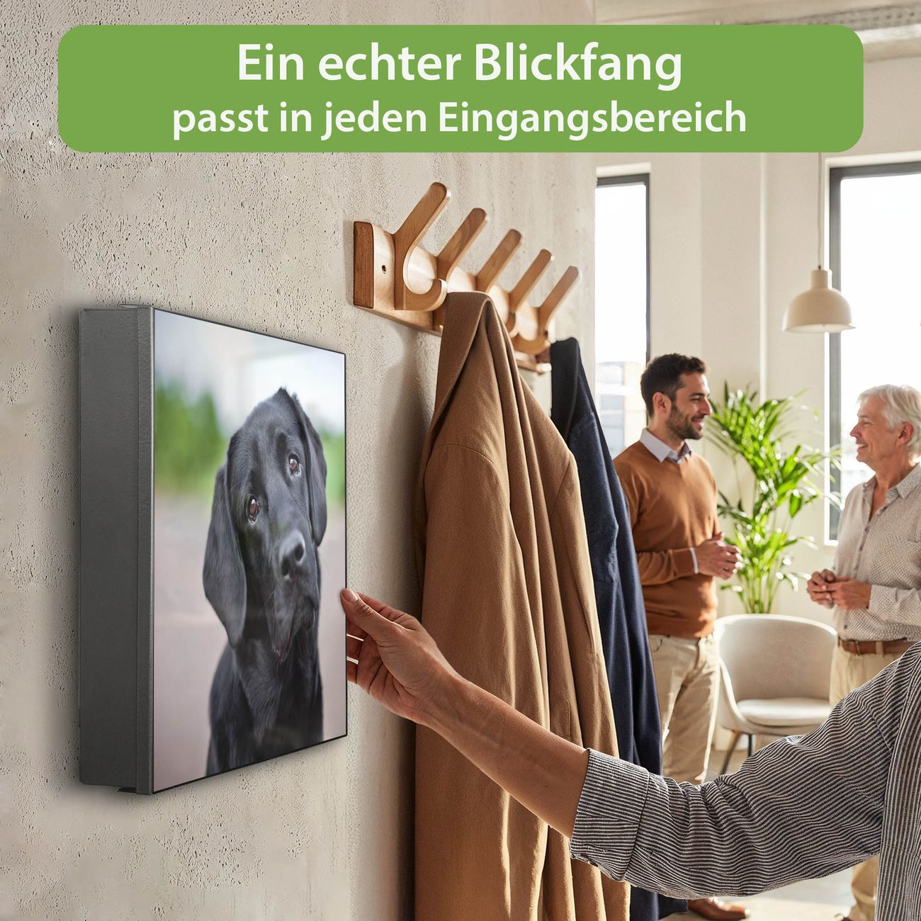 Bringe Ordnung und Eleganz in deinen Eingangsbereich mit dem banjado Schlüsselkasten Motiv Motiv Paolo. Die moderne Schlüsselbox kombiniert funktionales Design mit hochwertiger Verarbeitung und wird so zu einem echten Hingucker in Flur, Büro oder Ferienwohnung. ✅ Stilvolle Schlüsselaufbewahrung mit Motiv Motiv Paolo Der Design-Schlüsselkasten Motiv Motiv Paolo bietet Platz für bis zu 32 Schlüssel, die auf 4 stabilen Reihen mit je 8 Haken übersichtlich verstaut werden. Mit seinen kompakten Maßen von 30 x 30 x 5 cm passt die Schlüsselbox perfekt auch in kleinere Räume. Der schwarz lackierte Stahlkorpus mit links angeschlagenem Türscharnier harmoniert mit gedruckten Folie auf der Front und fügt sich nahtlos in jedes Wohnambiente ein. Ob als Schlüsselorganizer für Zuhause oder als praktische Lösung für Büros, Praxen und Gewerbe, der banjado Schlüsselkasten sorgt für Ordnung und Übersicht. Dank der magnetischen, mit Kreidestiften beschreibbaren Folie auf der Front kannst du Notizen anheften oder Termine direkt auf der Oberfläche festhalten. Die Schlüsselbox Motiv Motiv Paolo zur Wandmontage wird inklusive Befestigungsmaterial geliefert und ist schnell angebracht. So hast du deine Schlüssel jederzeit griffbereit und zugleich stilvoll verstaut. Mit diesem banjado Schlüsselkasten Motiv Motiv Paolo kombinierst du praktische Aufbewahrung mit stilvollem Wohndesign. Ob privat oder geschäftlich, die Schlüsselbox sorgt für mehr Ordnung, Übersicht und ein wohnliches Ambiente.Vorteile im Überblick