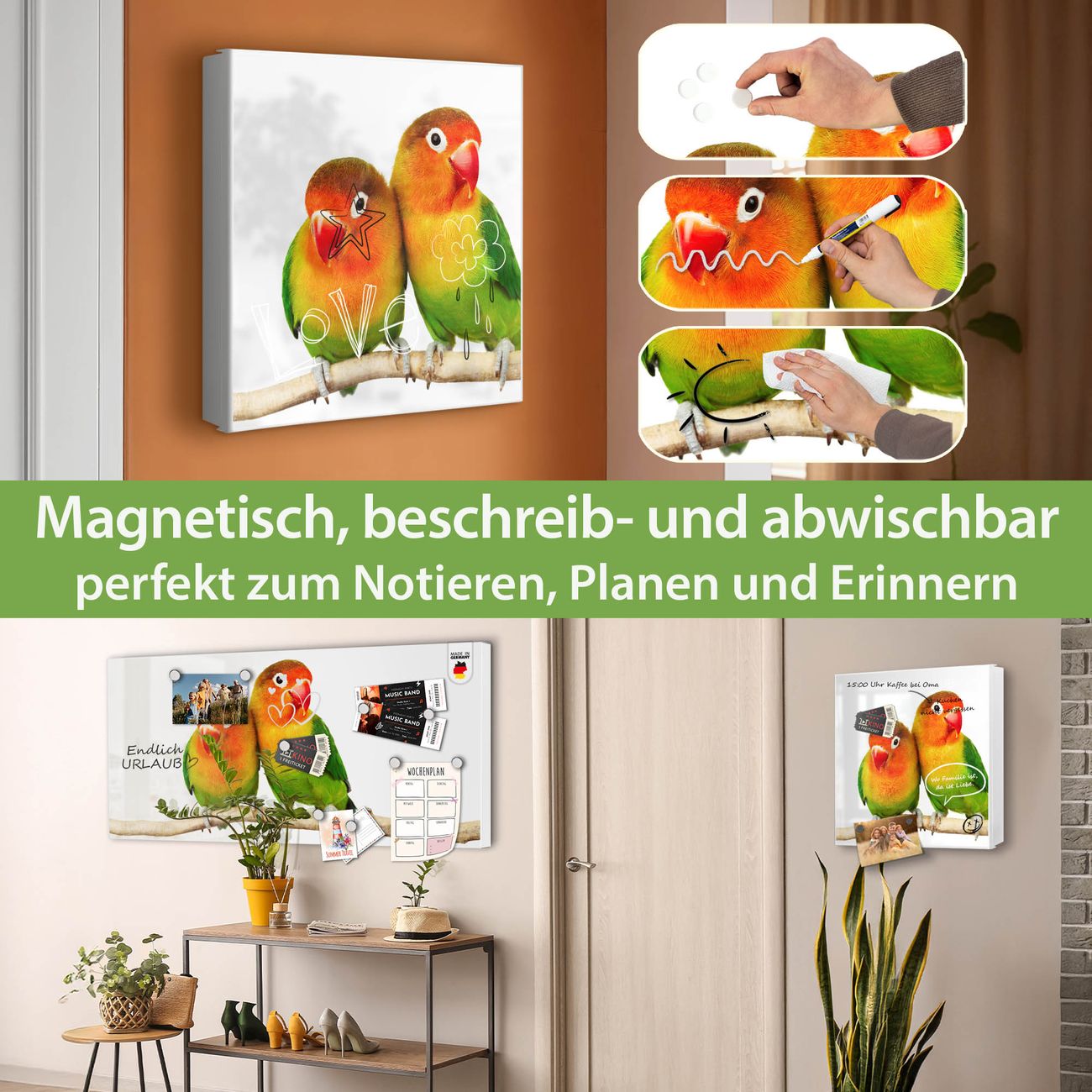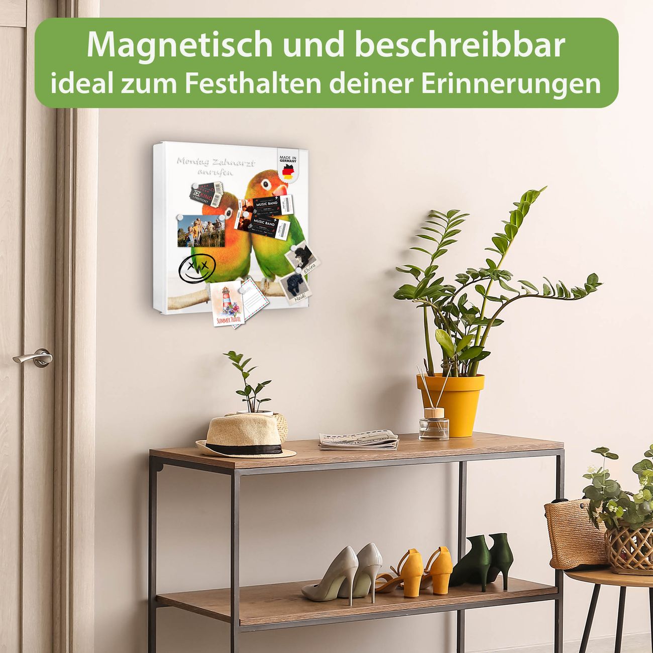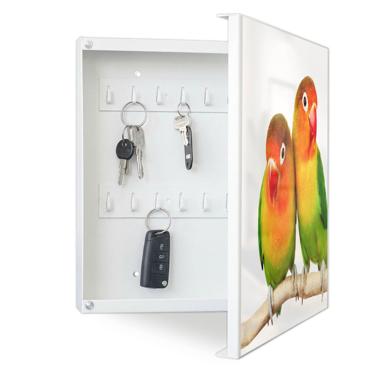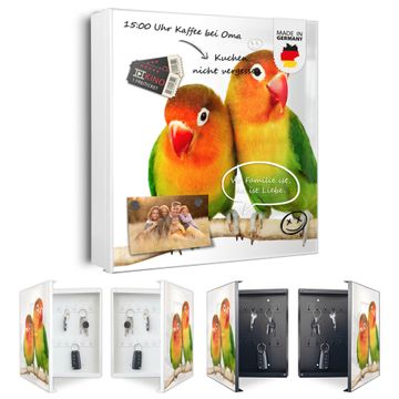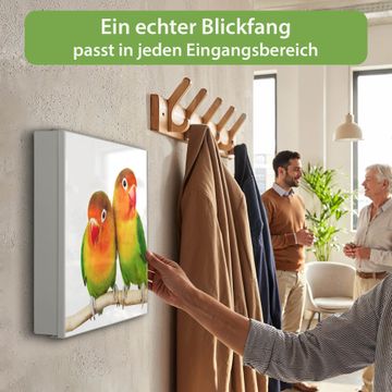 Bringe Ordnung und Eleganz in deinen Eingangsbereich mit dem banjado Schlüsselkasten Motiv Motiv Papageien. Die moderne Schlüsselbox kombiniert funktionales Design mit hochwertiger Verarbeitung und wird so zu einem echten Hingucker in Flur, Büro oder Ferienwohnung. ✅ Stilvolle Schlüsselaufbewahrung mit Motiv Motiv Papageien Der Design-Schlüsselkasten Motiv Motiv Papageien bietet Platz für bis zu 32 Schlüssel, die auf 4 stabilen Reihen mit je 8 Haken übersichtlich verstaut werden. Mit seinen kompakten Maßen von 30 x 30 x 5 cm passt die Schlüsselbox perfekt auch in kleinere Räume. Der weiß lackierte Stahlkorpus mit rechts angeschlagenem Türscharnier harmoniert mit gedruckten Folie auf der Front und fügt sich nahtlos in jedes Wohnambiente ein. Ob als Schlüsselorganizer für Zuhause oder als praktische Lösung für Büros, Praxen und Gewerbe, der banjado Schlüsselkasten sorgt für Ordnung und Übersicht. Dank der magnetischen, mit Kreidestiften beschreibbaren Folie auf der Front kannst du Notizen anheften oder Termine direkt auf der Oberfläche festhalten. Die Schlüsselbox Motiv Motiv Papageien zur Wandmontage wird inklusive Befestigungsmaterial geliefert und ist schnell angebracht. So hast du deine Schlüssel jederzeit griffbereit und zugleich stilvoll verstaut. Mit diesem banjado Schlüsselkasten Motiv Motiv Papageien kombinierst du praktische Aufbewahrung mit stilvollem Wohndesign. Ob privat oder geschäftlich, die Schlüsselbox sorgt für mehr Ordnung, Übersicht und ein wohnliches Ambiente.Vorteile im Überblick