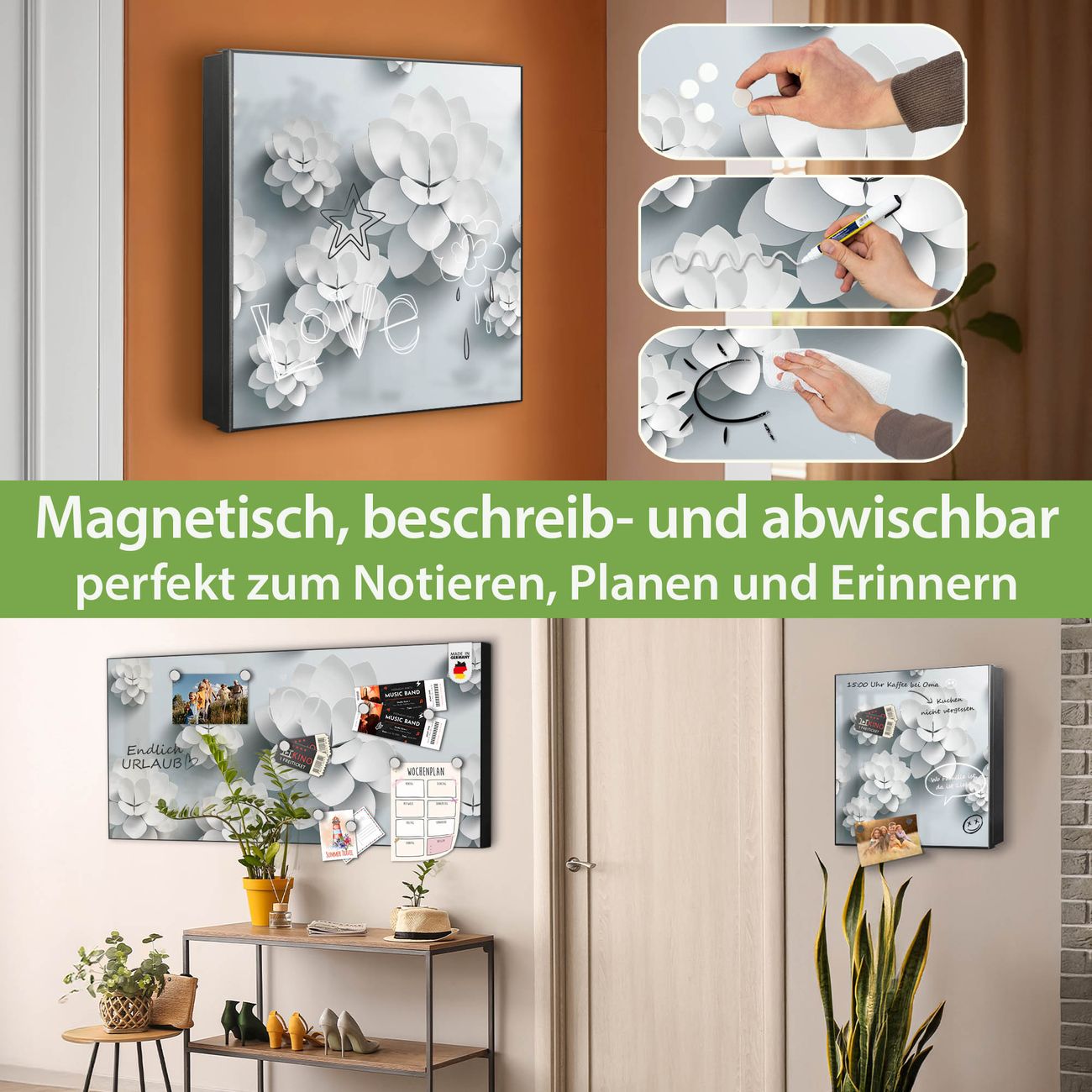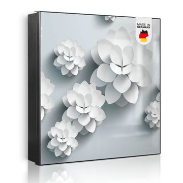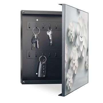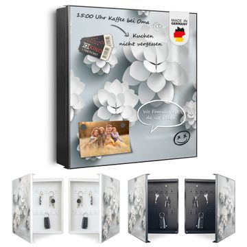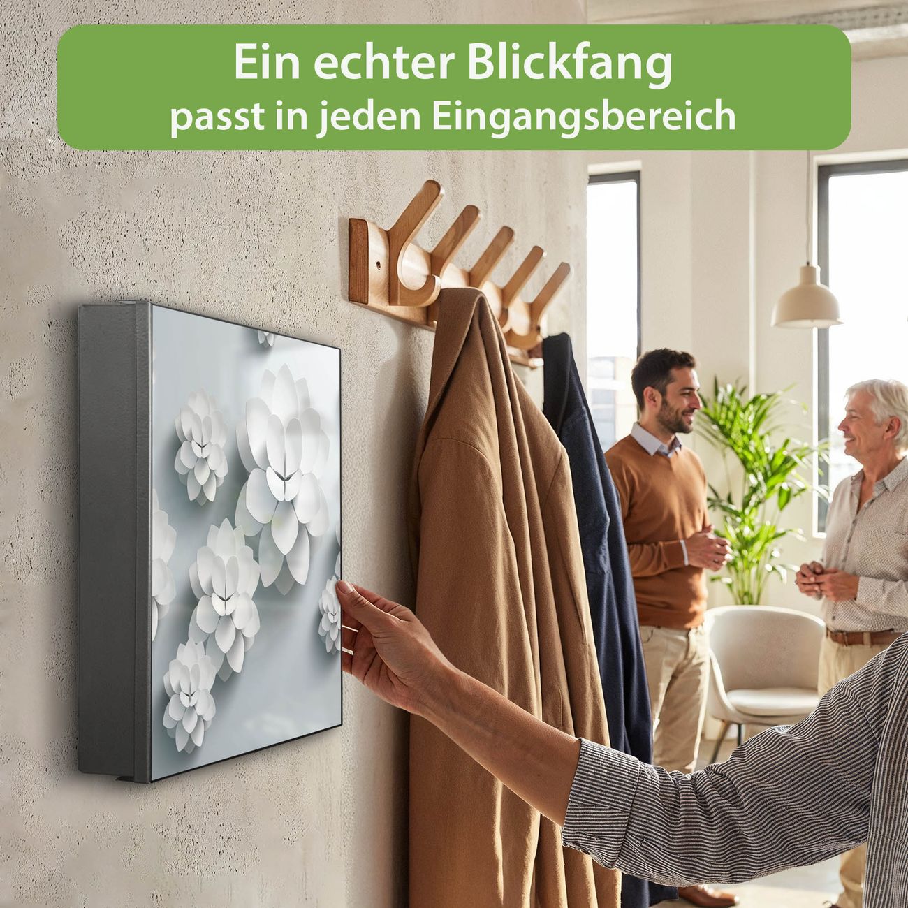Bringe Ordnung und Eleganz in deinen Eingangsbereich mit dem banjado Schlüsselkasten Motiv Motiv Papier Lotus. Die moderne Schlüsselbox kombiniert funktionales Design mit hochwertiger Verarbeitung und wird so zu einem echten Hingucker in Flur, Büro oder Ferienwohnung. ✅ Stilvolle Schlüsselaufbewahrung mit Motiv Motiv Papier Lotus Der Design-Schlüsselkasten Motiv Motiv Papier Lotus bietet Platz für bis zu 32 Schlüssel, die auf 4 stabilen Reihen mit je 8 Haken übersichtlich verstaut werden. Mit seinen kompakten Maßen von 30 x 30 x 5 cm passt die Schlüsselbox perfekt auch in kleinere Räume. Der schwarz lackierte Stahlkorpus mit rechts angeschlagenem Türscharnier harmoniert mit gedruckten Folie auf der Front und fügt sich nahtlos in jedes Wohnambiente ein. Ob als Schlüsselorganizer für Zuhause oder als praktische Lösung für Büros, Praxen und Gewerbe, der banjado Schlüsselkasten sorgt für Ordnung und Übersicht. Dank der magnetischen, mit Kreidestiften beschreibbaren Folie auf der Front kannst du Notizen anheften oder Termine direkt auf der Oberfläche festhalten. Die Schlüsselbox Motiv Motiv Papier Lotus zur Wandmontage wird inklusive Befestigungsmaterial geliefert und ist schnell angebracht. So hast du deine Schlüssel jederzeit griffbereit und zugleich stilvoll verstaut. Mit diesem banjado Schlüsselkasten Motiv Motiv Papier Lotus kombinierst du praktische Aufbewahrung mit stilvollem Wohndesign. Ob privat oder geschäftlich, die Schlüsselbox sorgt für mehr Ordnung, Übersicht und ein wohnliches Ambiente.Vorteile im Überblick