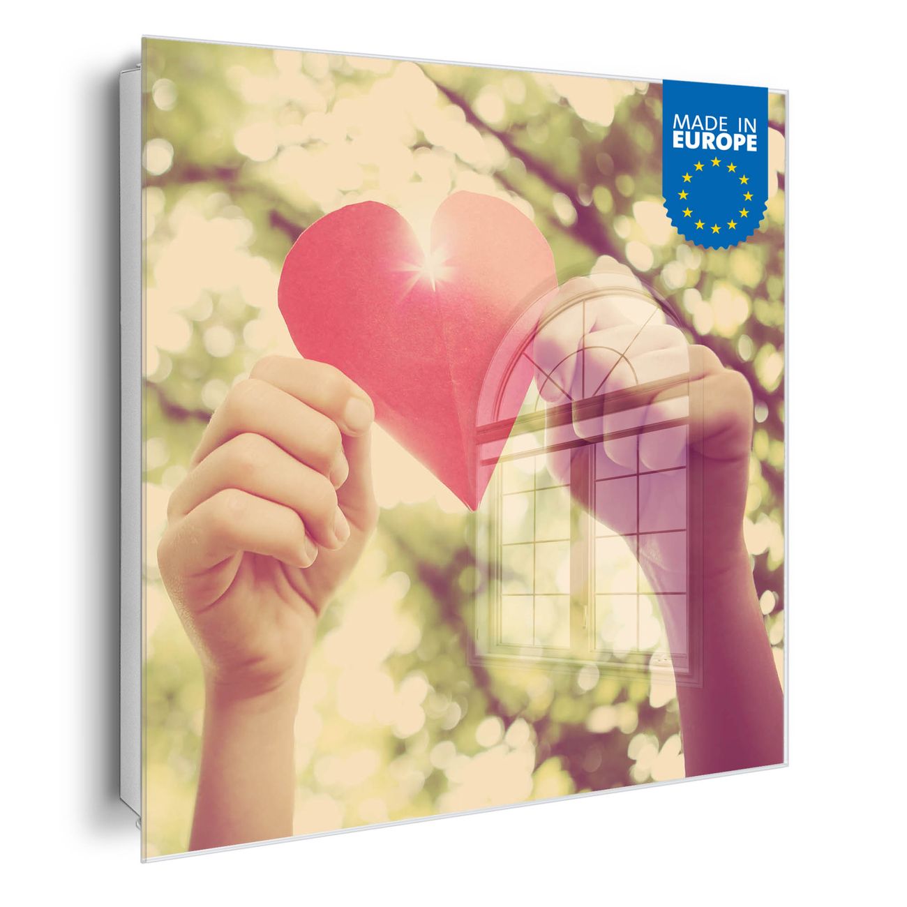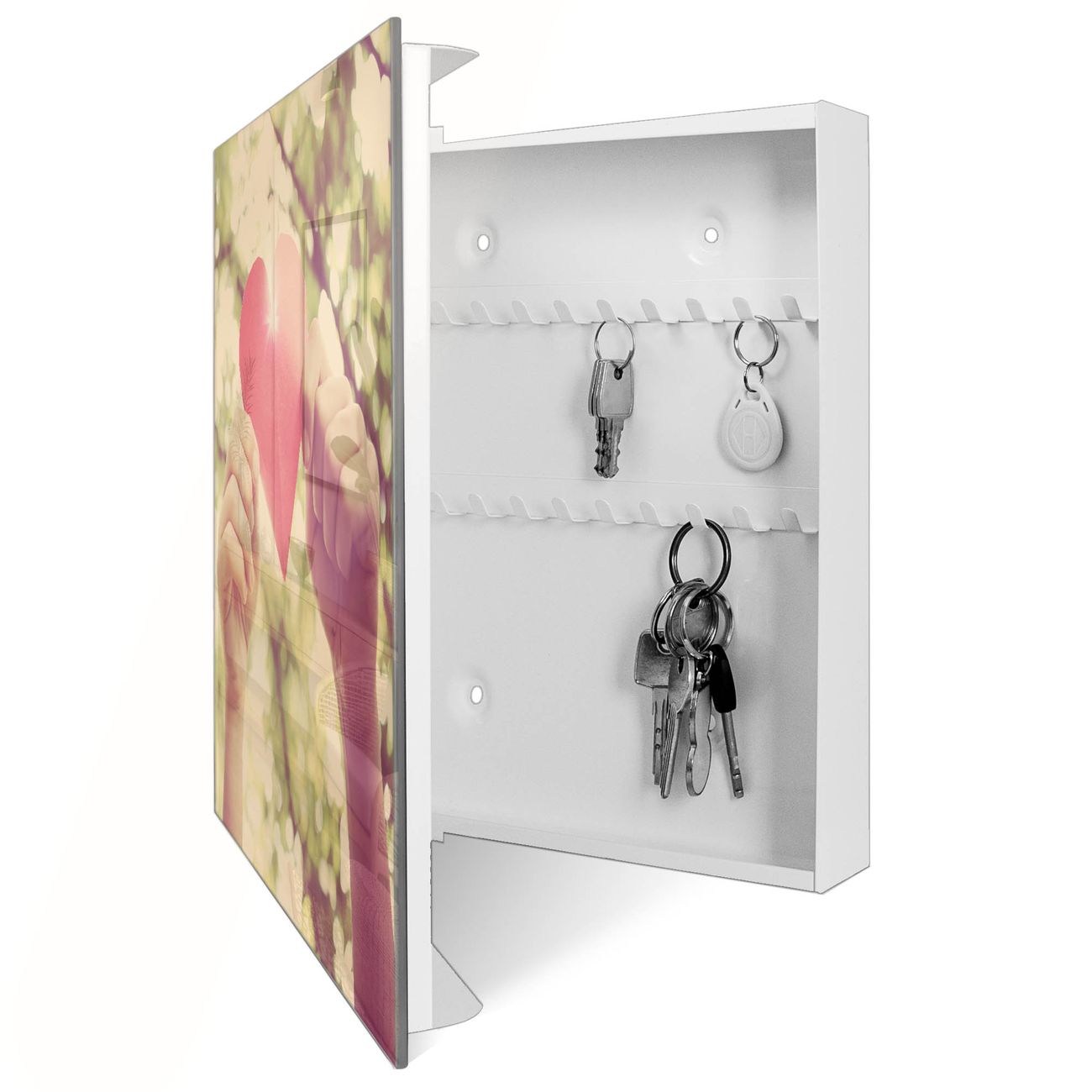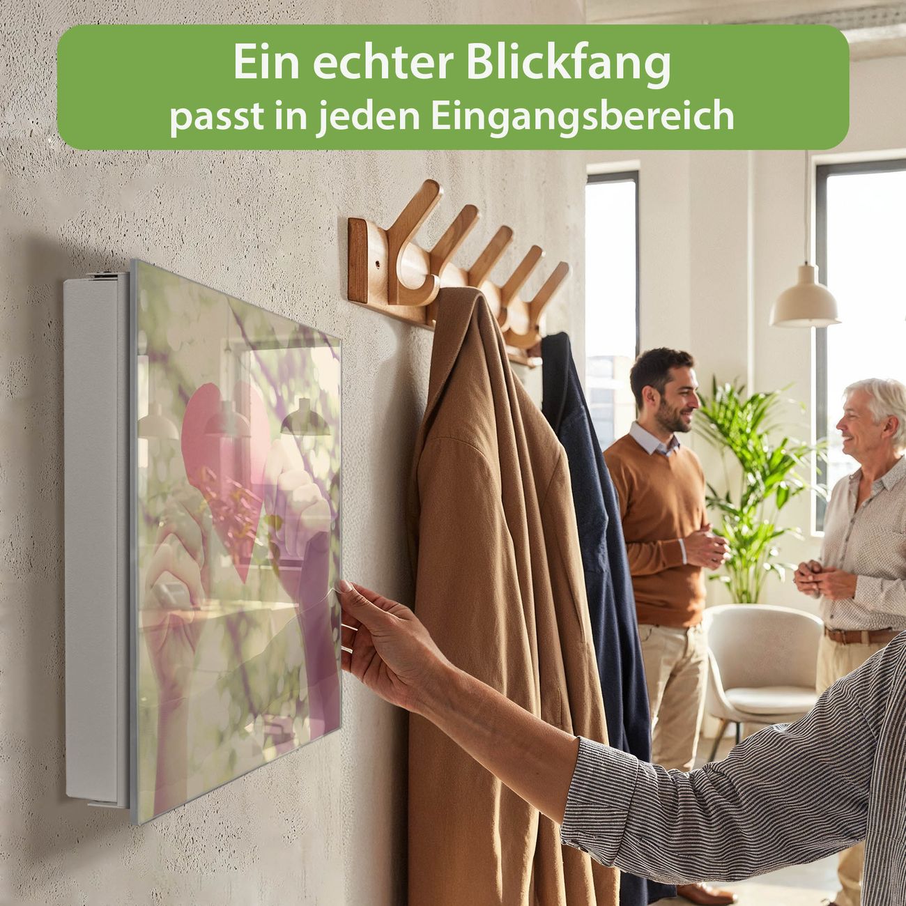 Bringe Ordnung und Eleganz in deinen Eingangsbereich mit dem banjado Schlüsselkasten Motiv Motiv Papierherz. Die moderne Schlüsselbox kombiniert funktionales Design mit hochwertiger Verarbeitung und wird so zu einem echten Hingucker in Flur, Büro oder Ferienwohnung. ✅ Stilvolle Schlüsselaufbewahrung mit Glasfront im Motiv Motiv Papierherz Der Design-Schlüsselkasten Motiv Motiv Papierherz bietet Platz für bis zu 50 Schlüssel, die auf 5 stabilen Reihen mit je 10 Haken übersichtlich verstaut werden. Mit seinen kompakten Maßen von 30 x 30 x 5 cm passt die Schlüsselbox perfekt auch in kleinere Räume. Der weiß lackierte Stahlkorpus mit rechts angeschlagenem Türscharnier harmoniert mit der Glasfront und fügt sich nahtlos in jedes Wohnambiente ein. Ob als Schlüsselorganizer für Zuhause oder als praktische Lösung für Büros, Praxen und Gewerbe, der banjado Schlüsselkasten sorgt für Ordnung und Übersicht. Dank der magnetischen, mit Kreidestiften beschreibbaren Glasfront kannst du Notizen anheften oder Termine direkt auf der Oberfläche festhalten. Die Schlüsselbox Motiv Motiv Papierherz zur Wandmontage wird inklusive Befestigungsmaterial geliefert und ist schnell angebracht. So hast du deine Schlüssel jederzeit griffbereit und zugleich stilvoll verstaut. Mit diesem banjado Schlüsselkasten Motiv Motiv Papierherz kombinierst du praktische Aufbewahrung mit stilvollem Wohndesign. Ob privat oder geschäftlich, die Schlüsselbox sorgt für mehr Ordnung, Übersicht und ein wohnliches Ambiente.Vorteile im Überblick