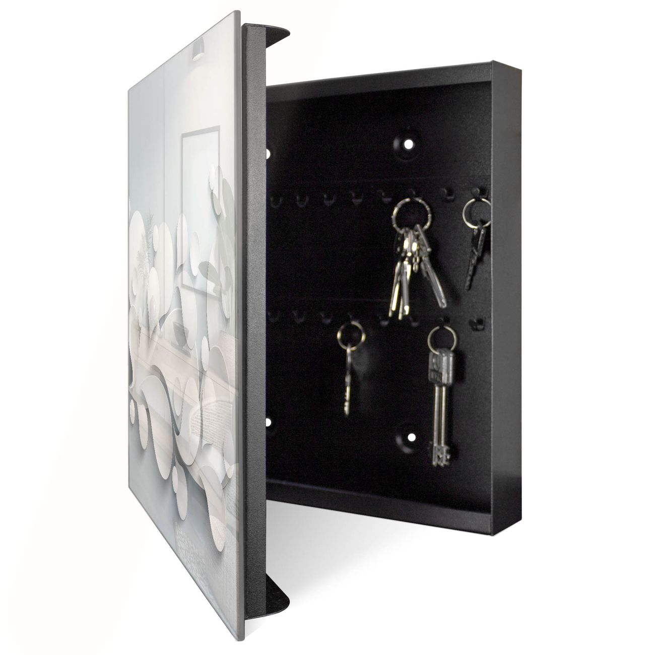 Bringe Ordnung und Eleganz in deinen Eingangsbereich mit dem banjado Schlüsselkasten Motiv Motiv Papiertropfen. Die moderne Schlüsselbox kombiniert funktionales Design mit hochwertiger Verarbeitung und wird so zu einem echten Hingucker in Flur, Büro oder Ferienwohnung. ✅ Stilvolle Schlüsselaufbewahrung mit Glasfront im Motiv Motiv Papiertropfen Der Design-Schlüsselkasten Motiv Motiv Papiertropfen bietet Platz für bis zu 50 Schlüssel, die auf 5 stabilen Reihen mit je 10 Haken übersichtlich verstaut werden. Mit seinen kompakten Maßen von 30 x 30 x 5 cm passt die Schlüsselbox perfekt auch in kleinere Räume. Der schwarz lackierte Stahlkorpus mit rechts angeschlagenem Türscharnier harmoniert mit der Glasfront und fügt sich nahtlos in jedes Wohnambiente ein. Ob als Schlüsselorganizer für Zuhause oder als praktische Lösung für Büros, Praxen und Gewerbe, der banjado Schlüsselkasten sorgt für Ordnung und Übersicht. Dank der magnetischen, mit Kreidestiften beschreibbaren Glasfront kannst du Notizen anheften oder Termine direkt auf der Oberfläche festhalten. Die Schlüsselbox Motiv Motiv Papiertropfen zur Wandmontage wird inklusive Befestigungsmaterial geliefert und ist schnell angebracht. So hast du deine Schlüssel jederzeit griffbereit und zugleich stilvoll verstaut. Mit diesem banjado Schlüsselkasten Motiv Motiv Papiertropfen kombinierst du praktische Aufbewahrung mit stilvollem Wohndesign. Ob privat oder geschäftlich, die Schlüsselbox sorgt für mehr Ordnung, Übersicht und ein wohnliches Ambiente.Vorteile im Überblick