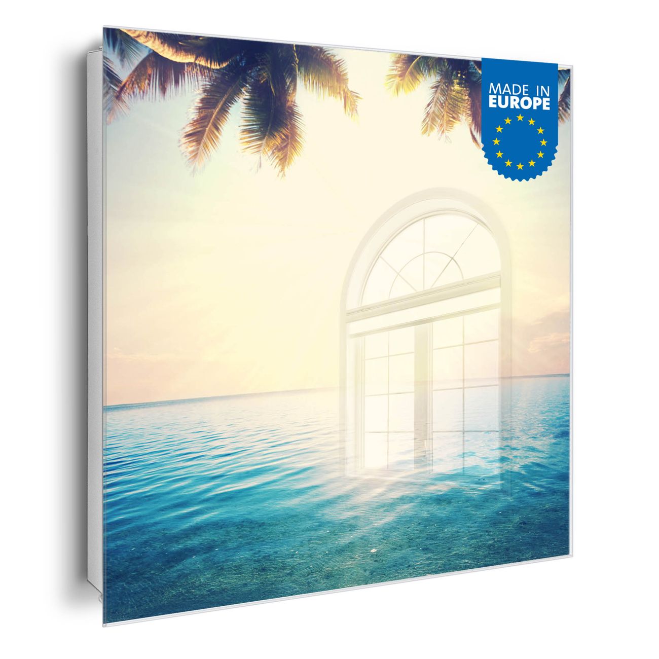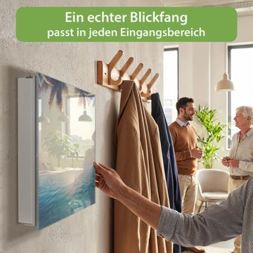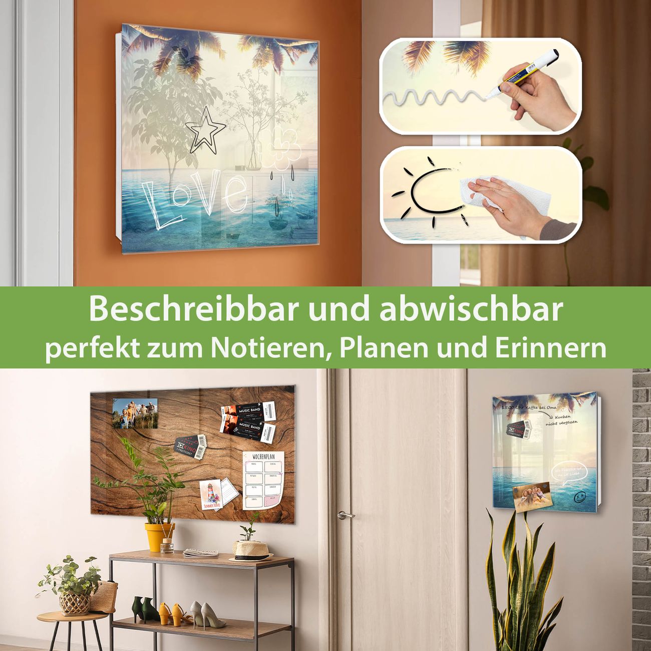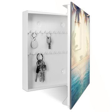 Bringe Ordnung und Eleganz in deinen Eingangsbereich mit dem banjado Schlüsselkasten Motiv Motiv Paradis. Die moderne Schlüsselbox kombiniert funktionales Design mit hochwertiger Verarbeitung und wird so zu einem echten Hingucker in Flur, Büro oder Ferienwohnung. ✅ Stilvolle Schlüsselaufbewahrung mit Glasfront im Motiv Motiv Paradis Der Design-Schlüsselkasten Motiv Motiv Paradis bietet Platz für bis zu 50 Schlüssel, die auf 5 stabilen Reihen mit je 10 Haken übersichtlich verstaut werden. Mit seinen kompakten Maßen von 30 x 30 x 5 cm passt die Schlüsselbox perfekt auch in kleinere Räume. Der weiß lackierte Stahlkorpus mit rechts angeschlagenem Türscharnier harmoniert mit der Glasfront und fügt sich nahtlos in jedes Wohnambiente ein. Ob als Schlüsselorganizer für Zuhause oder als praktische Lösung für Büros, Praxen und Gewerbe, der banjado Schlüsselkasten sorgt für Ordnung und Übersicht. Dank der magnetischen, mit Kreidestiften beschreibbaren Glasfront kannst du Notizen anheften oder Termine direkt auf der Oberfläche festhalten. Die Schlüsselbox Motiv Motiv Paradis zur Wandmontage wird inklusive Befestigungsmaterial geliefert und ist schnell angebracht. So hast du deine Schlüssel jederzeit griffbereit und zugleich stilvoll verstaut. Mit diesem banjado Schlüsselkasten Motiv Motiv Paradis kombinierst du praktische Aufbewahrung mit stilvollem Wohndesign. Ob privat oder geschäftlich, die Schlüsselbox sorgt für mehr Ordnung, Übersicht und ein wohnliches Ambiente.Vorteile im Überblick