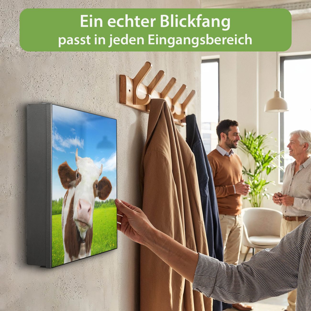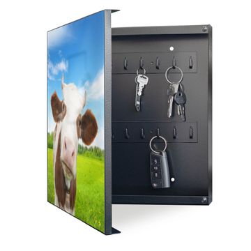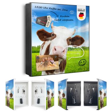 Bringe Ordnung und Eleganz in deinen Eingangsbereich mit dem banjado Schlüsselkasten Motiv Motiv Pardon. Die moderne Schlüsselbox kombiniert funktionales Design mit hochwertiger Verarbeitung und wird so zu einem echten Hingucker in Flur, Büro oder Ferienwohnung. ✅ Stilvolle Schlüsselaufbewahrung mit Motiv Motiv Pardon Der Design-Schlüsselkasten Motiv Motiv Pardon bietet Platz für bis zu 32 Schlüssel, die auf 4 stabilen Reihen mit je 8 Haken übersichtlich verstaut werden. Mit seinen kompakten Maßen von 30 x 30 x 5 cm passt die Schlüsselbox perfekt auch in kleinere Räume. Der schwarz lackierte Stahlkorpus mit links angeschlagenem Türscharnier harmoniert mit gedruckten Folie auf der Front und fügt sich nahtlos in jedes Wohnambiente ein. Ob als Schlüsselorganizer für Zuhause oder als praktische Lösung für Büros, Praxen und Gewerbe, der banjado Schlüsselkasten sorgt für Ordnung und Übersicht. Dank der magnetischen, mit Kreidestiften beschreibbaren Folie auf der Front kannst du Notizen anheften oder Termine direkt auf der Oberfläche festhalten. Die Schlüsselbox Motiv Motiv Pardon zur Wandmontage wird inklusive Befestigungsmaterial geliefert und ist schnell angebracht. So hast du deine Schlüssel jederzeit griffbereit und zugleich stilvoll verstaut. Mit diesem banjado Schlüsselkasten Motiv Motiv Pardon kombinierst du praktische Aufbewahrung mit stilvollem Wohndesign. Ob privat oder geschäftlich, die Schlüsselbox sorgt für mehr Ordnung, Übersicht und ein wohnliches Ambiente.Vorteile im Überblick