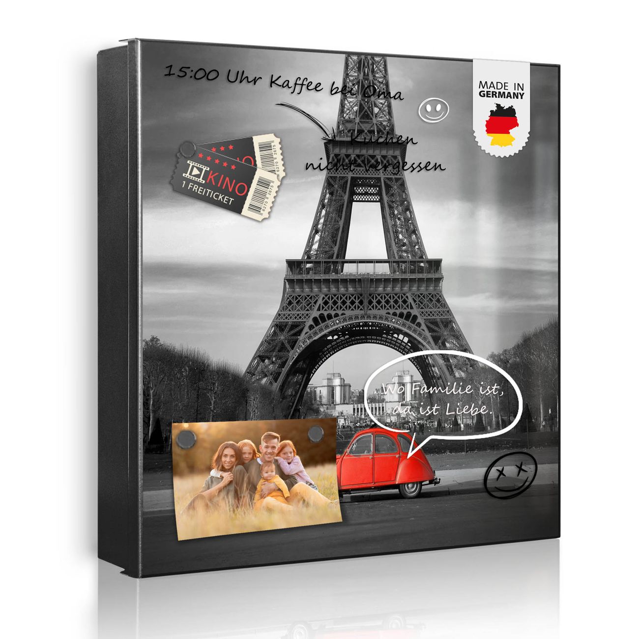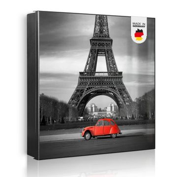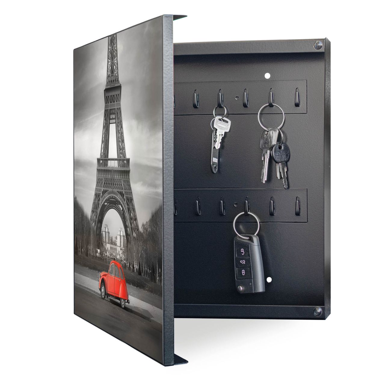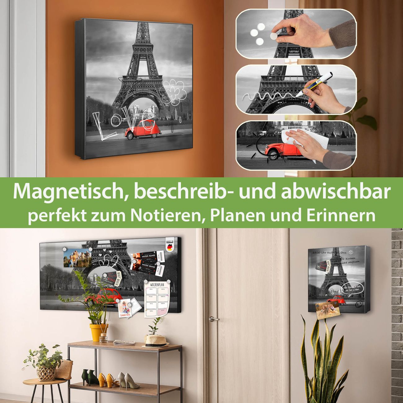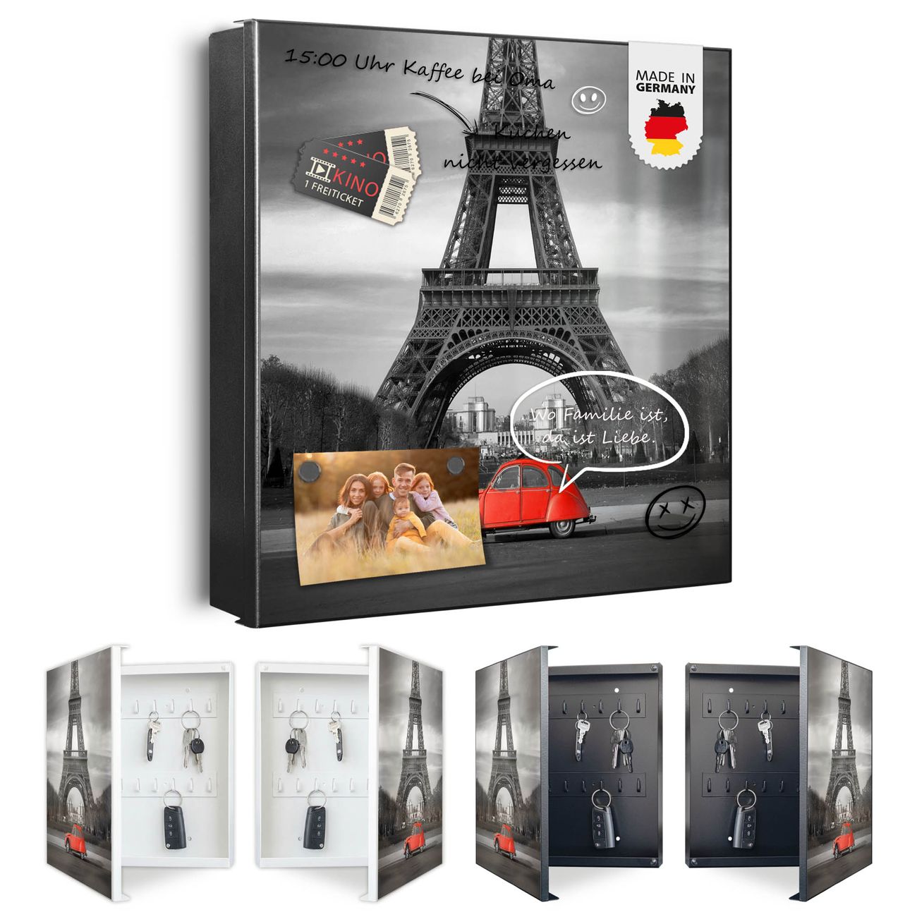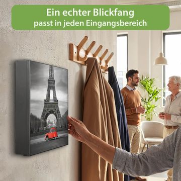 Bringe Ordnung und Eleganz in deinen Eingangsbereich mit dem banjado Schlüsselkasten Motiv Motiv Paris. Die moderne Schlüsselbox kombiniert funktionales Design mit hochwertiger Verarbeitung und wird so zu einem echten Hingucker in Flur, Büro oder Ferienwohnung. ✅ Stilvolle Schlüsselaufbewahrung mit Motiv Motiv Paris Der Design-Schlüsselkasten Motiv Motiv Paris bietet Platz für bis zu 32 Schlüssel, die auf 4 stabilen Reihen mit je 8 Haken übersichtlich verstaut werden. Mit seinen kompakten Maßen von 30 x 30 x 5 cm passt die Schlüsselbox perfekt auch in kleinere Räume. Der schwarz lackierte Stahlkorpus mit links angeschlagenem Türscharnier harmoniert mit gedruckten Folie auf der Front und fügt sich nahtlos in jedes Wohnambiente ein. Ob als Schlüsselorganizer für Zuhause oder als praktische Lösung für Büros, Praxen und Gewerbe, der banjado Schlüsselkasten sorgt für Ordnung und Übersicht. Dank der magnetischen, mit Kreidestiften beschreibbaren Folie auf der Front kannst du Notizen anheften oder Termine direkt auf der Oberfläche festhalten. Die Schlüsselbox Motiv Motiv Paris zur Wandmontage wird inklusive Befestigungsmaterial geliefert und ist schnell angebracht. So hast du deine Schlüssel jederzeit griffbereit und zugleich stilvoll verstaut. Mit diesem banjado Schlüsselkasten Motiv Motiv Paris kombinierst du praktische Aufbewahrung mit stilvollem Wohndesign. Ob privat oder geschäftlich, die Schlüsselbox sorgt für mehr Ordnung, Übersicht und ein wohnliches Ambiente.Vorteile im Überblick