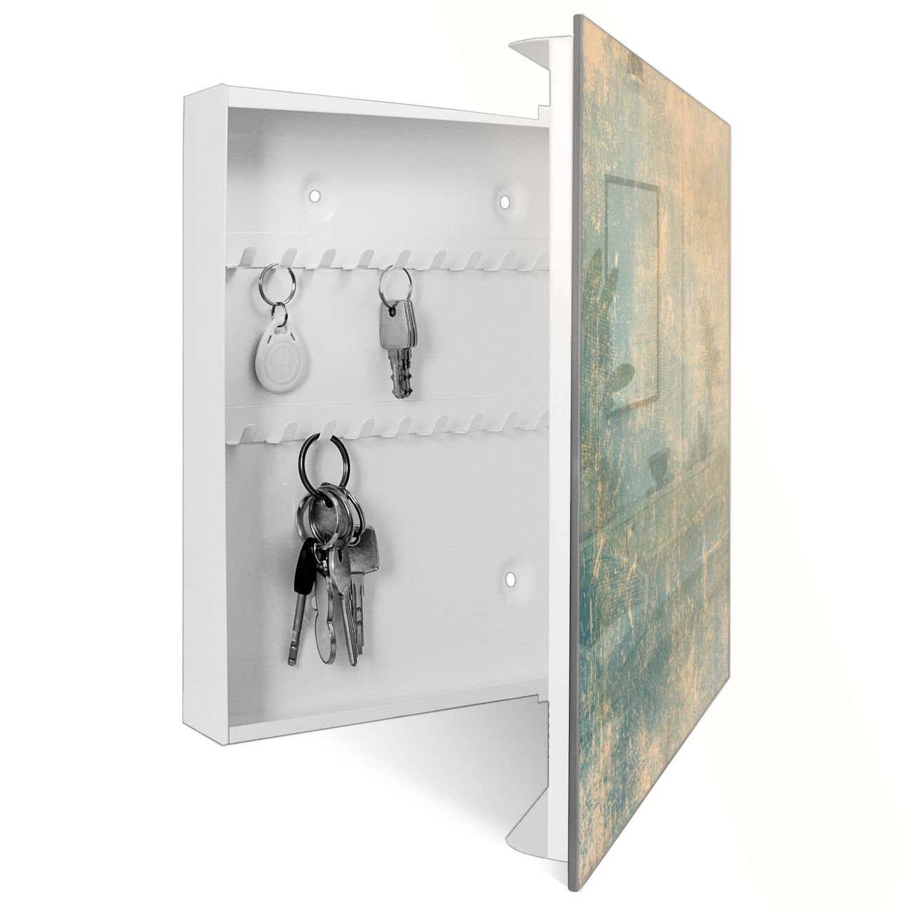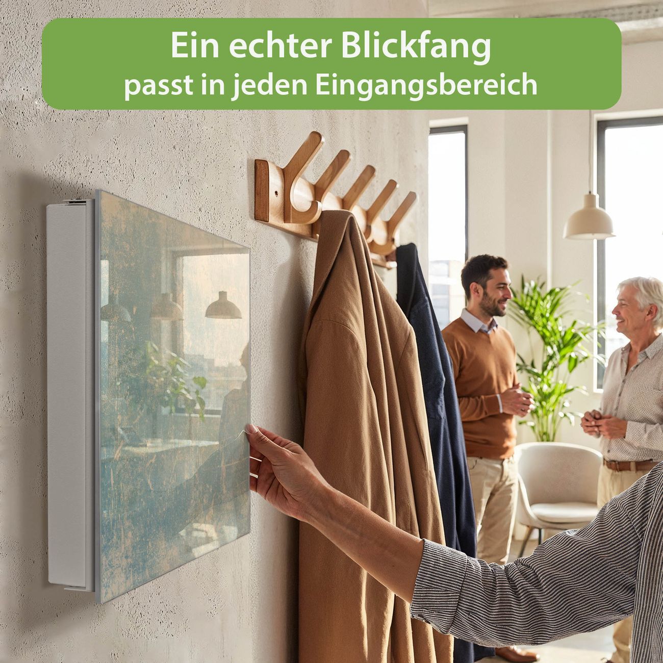 Bringe Ordnung und Eleganz in deinen Eingangsbereich mit dem banjado Schlüsselkasten Motiv Motiv Patina Grün. Die moderne Schlüsselbox kombiniert funktionales Design mit hochwertiger Verarbeitung und wird so zu einem echten Hingucker in Flur, Büro oder Ferienwohnung. ✅ Stilvolle Schlüsselaufbewahrung mit Glasfront im Motiv Motiv Patina Grün Der Design-Schlüsselkasten Motiv Motiv Patina Grün bietet Platz für bis zu 50 Schlüssel, die auf 5 stabilen Reihen mit je 10 Haken übersichtlich verstaut werden. Mit seinen kompakten Maßen von 30 x 30 x 5 cm passt die Schlüsselbox perfekt auch in kleinere Räume. Der weiß lackierte Stahlkorpus mit rechts angeschlagenem Türscharnier harmoniert mit der Glasfront und fügt sich nahtlos in jedes Wohnambiente ein. Ob als Schlüsselorganizer für Zuhause oder als praktische Lösung für Büros, Praxen und Gewerbe, der banjado Schlüsselkasten sorgt für Ordnung und Übersicht. Dank der magnetischen, mit Kreidestiften beschreibbaren Glasfront kannst du Notizen anheften oder Termine direkt auf der Oberfläche festhalten. Die Schlüsselbox Motiv Motiv Patina Grün zur Wandmontage wird inklusive Befestigungsmaterial geliefert und ist schnell angebracht. So hast du deine Schlüssel jederzeit griffbereit und zugleich stilvoll verstaut. Mit diesem banjado Schlüsselkasten Motiv Motiv Patina Grün kombinierst du praktische Aufbewahrung mit stilvollem Wohndesign. Ob privat oder geschäftlich, die Schlüsselbox sorgt für mehr Ordnung, Übersicht und ein wohnliches Ambiente.Vorteile im Überblick