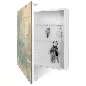 Bringe Ordnung und Eleganz in deinen Eingangsbereich mit dem banjado Schlüsselkasten Motiv Motiv Patina Grün. Die moderne Schlüsselbox kombiniert funktionales Design mit hochwertiger Verarbeitung und wird so zu einem echten Hingucker in Flur, Büro oder Ferienwohnung. ✅ Stilvolle Schlüsselaufbewahrung mit Glasfront im Motiv Motiv Patina Grün Der Design-Schlüsselkasten Motiv Motiv Patina Grün bietet Platz für bis zu 50 Schlüssel, die auf 5 stabilen Reihen mit je 10 Haken übersichtlich verstaut werden. Mit seinen kompakten Maßen von 30 x 30 x 5 cm passt die Schlüsselbox perfekt auch in kleinere Räume. Der weiß lackierte Stahlkorpus mit rechts angeschlagenem Türscharnier harmoniert mit der Glasfront und fügt sich nahtlos in jedes Wohnambiente ein. Ob als Schlüsselorganizer für Zuhause oder als praktische Lösung für Büros, Praxen und Gewerbe, der banjado Schlüsselkasten sorgt für Ordnung und Übersicht. Dank der magnetischen, mit Kreidestiften beschreibbaren Glasfront kannst du Notizen anheften oder Termine direkt auf der Oberfläche festhalten. Die Schlüsselbox Motiv Motiv Patina Grün zur Wandmontage wird inklusive Befestigungsmaterial geliefert und ist schnell angebracht. So hast du deine Schlüssel jederzeit griffbereit und zugleich stilvoll verstaut. Mit diesem banjado Schlüsselkasten Motiv Motiv Patina Grün kombinierst du praktische Aufbewahrung mit stilvollem Wohndesign. Ob privat oder geschäftlich, die Schlüsselbox sorgt für mehr Ordnung, Übersicht und ein wohnliches Ambiente.Vorteile im Überblick