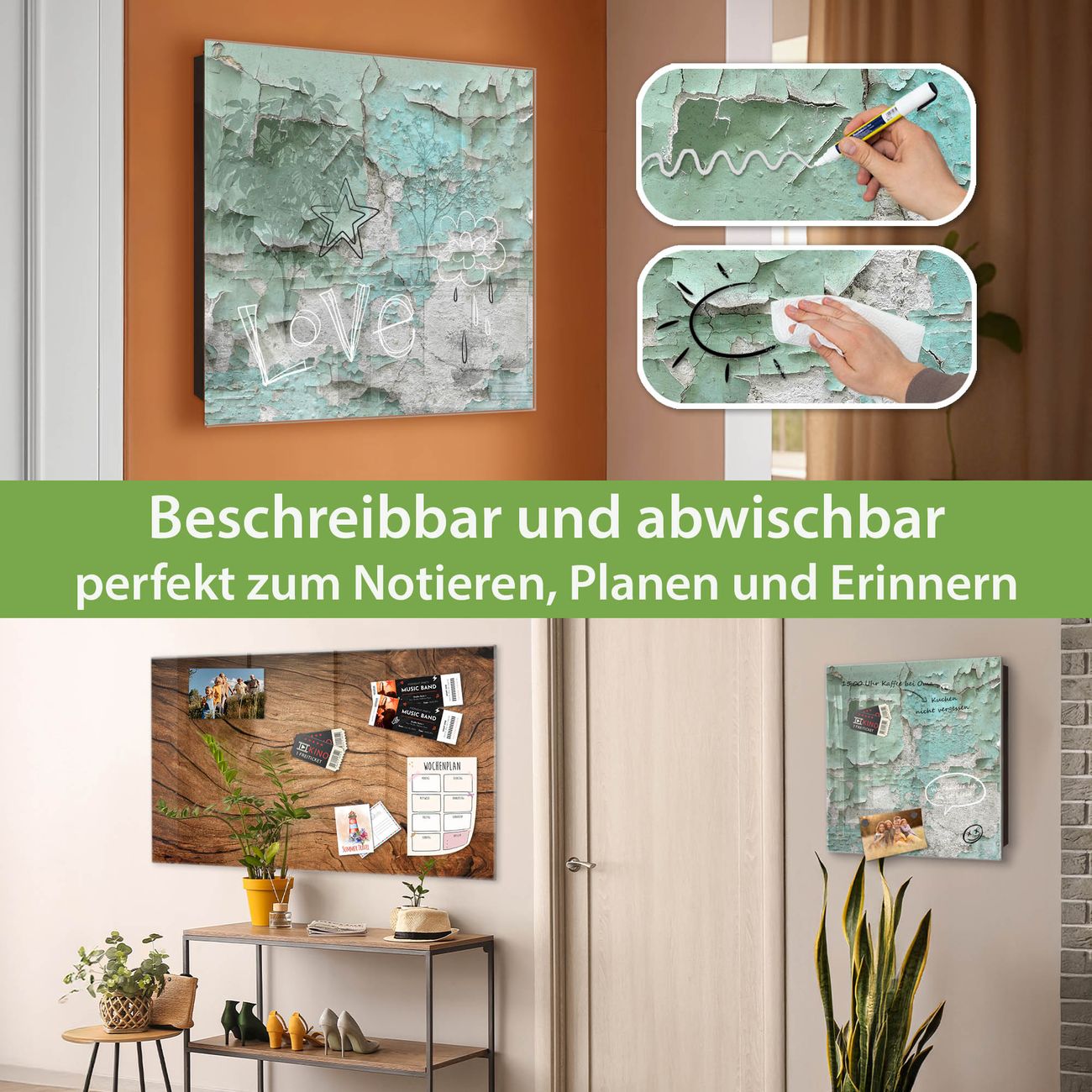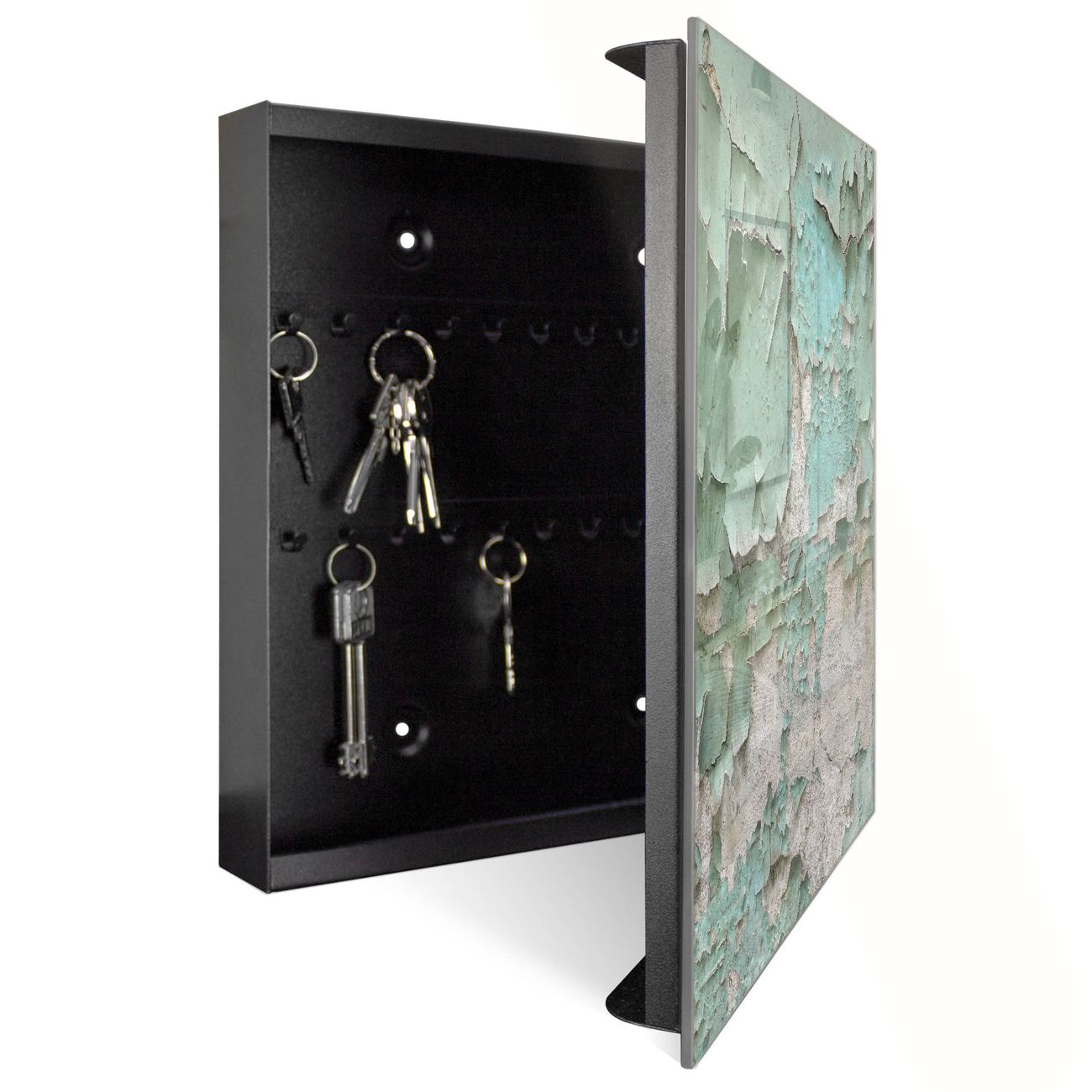 Bringe Ordnung und Eleganz in deinen Eingangsbereich mit dem banjado Schlüsselkasten Motiv Motiv Patina Mint. Die moderne Schlüsselbox kombiniert funktionales Design mit hochwertiger Verarbeitung und wird so zu einem echten Hingucker in Flur, Büro oder Ferienwohnung. ✅ Stilvolle Schlüsselaufbewahrung mit Glasfront im Motiv Motiv Patina Mint Der Design-Schlüsselkasten Motiv Motiv Patina Mint bietet Platz für bis zu 50 Schlüssel, die auf 5 stabilen Reihen mit je 10 Haken übersichtlich verstaut werden. Mit seinen kompakten Maßen von 30 x 30 x 5 cm passt die Schlüsselbox perfekt auch in kleinere Räume. Der schwarz lackierte Stahlkorpus mit rechts angeschlagenem Türscharnier harmoniert mit der Glasfront und fügt sich nahtlos in jedes Wohnambiente ein. Ob als Schlüsselorganizer für Zuhause oder als praktische Lösung für Büros, Praxen und Gewerbe, der banjado Schlüsselkasten sorgt für Ordnung und Übersicht. Dank der magnetischen, mit Kreidestiften beschreibbaren Glasfront kannst du Notizen anheften oder Termine direkt auf der Oberfläche festhalten. Die Schlüsselbox Motiv Motiv Patina Mint zur Wandmontage wird inklusive Befestigungsmaterial geliefert und ist schnell angebracht. So hast du deine Schlüssel jederzeit griffbereit und zugleich stilvoll verstaut. Mit diesem banjado Schlüsselkasten Motiv Motiv Patina Mint kombinierst du praktische Aufbewahrung mit stilvollem Wohndesign. Ob privat oder geschäftlich, die Schlüsselbox sorgt für mehr Ordnung, Übersicht und ein wohnliches Ambiente.Vorteile im Überblick