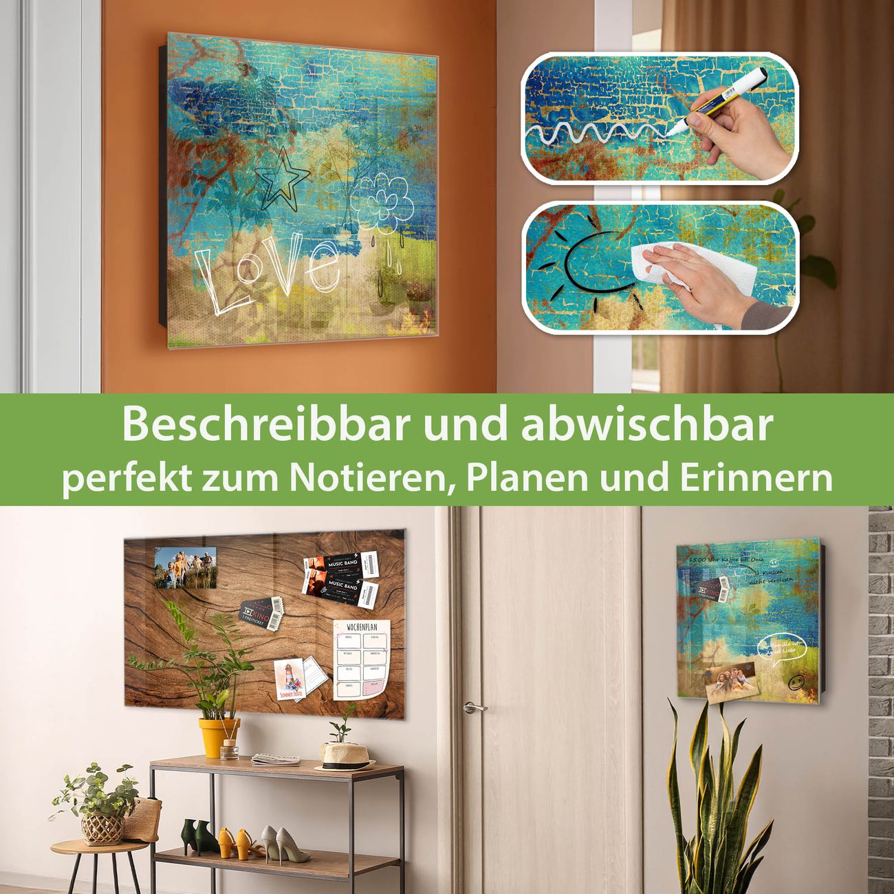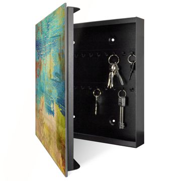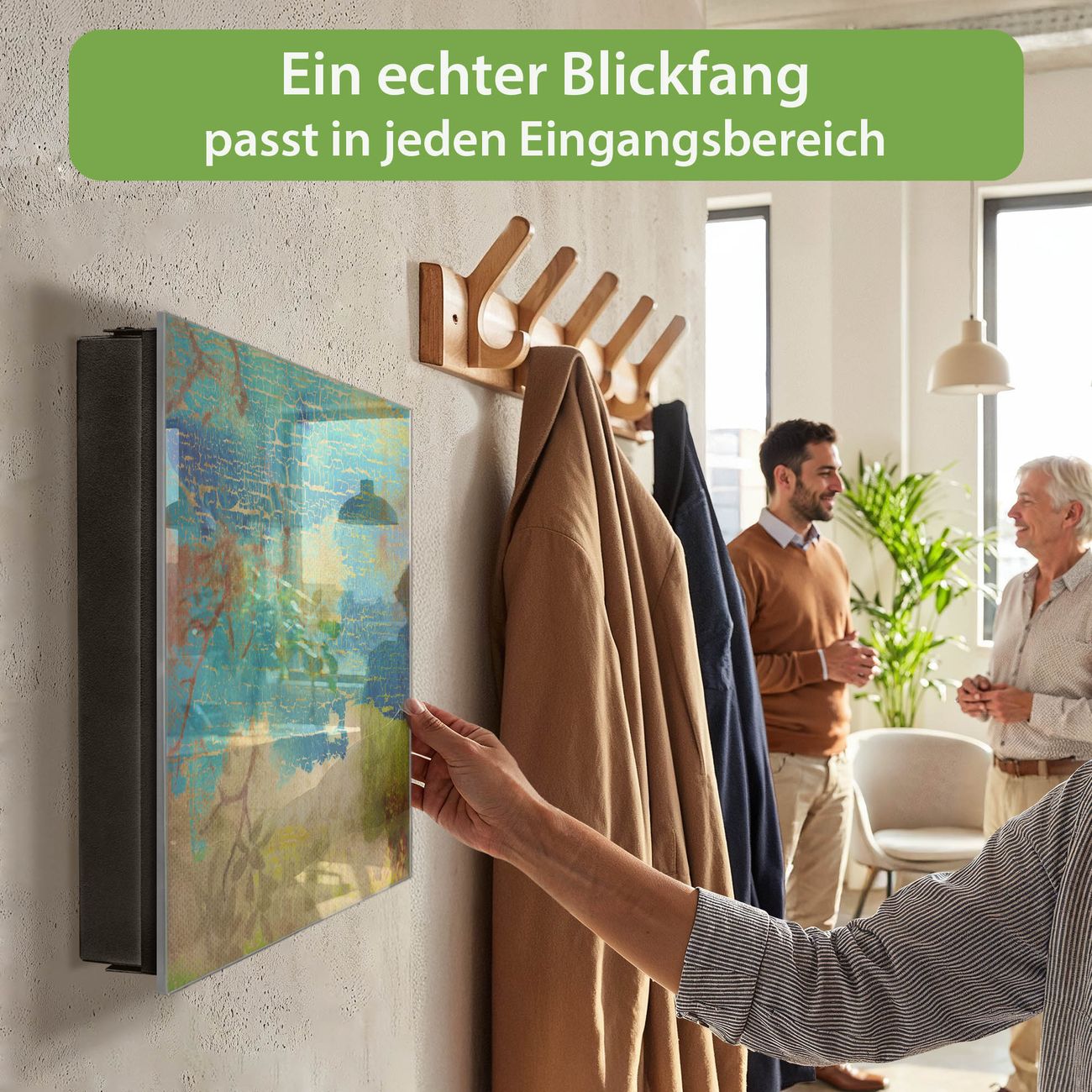 Bringe Ordnung und Eleganz in deinen Eingangsbereich mit dem banjado Schlüsselkasten Motiv Motiv Patina. Die moderne Schlüsselbox kombiniert funktionales Design mit hochwertiger Verarbeitung und wird so zu einem echten Hingucker in Flur, Büro oder Ferienwohnung. ✅ Stilvolle Schlüsselaufbewahrung mit Glasfront im Motiv Motiv Patina Der Design-Schlüsselkasten Motiv Motiv Patina bietet Platz für bis zu 50 Schlüssel, die auf 5 stabilen Reihen mit je 10 Haken übersichtlich verstaut werden. Mit seinen kompakten Maßen von 30 x 30 x 5 cm passt die Schlüsselbox perfekt auch in kleinere Räume. Der schwarz lackierte Stahlkorpus mit rechts angeschlagenem Türscharnier harmoniert mit der Glasfront und fügt sich nahtlos in jedes Wohnambiente ein. Ob als Schlüsselorganizer für Zuhause oder als praktische Lösung für Büros, Praxen und Gewerbe, der banjado Schlüsselkasten sorgt für Ordnung und Übersicht. Dank der magnetischen, mit Kreidestiften beschreibbaren Glasfront kannst du Notizen anheften oder Termine direkt auf der Oberfläche festhalten. Die Schlüsselbox Motiv Motiv Patina zur Wandmontage wird inklusive Befestigungsmaterial geliefert und ist schnell angebracht. So hast du deine Schlüssel jederzeit griffbereit und zugleich stilvoll verstaut. Mit diesem banjado Schlüsselkasten Motiv Motiv Patina kombinierst du praktische Aufbewahrung mit stilvollem Wohndesign. Ob privat oder geschäftlich, die Schlüsselbox sorgt für mehr Ordnung, Übersicht und ein wohnliches Ambiente.Vorteile im Überblick