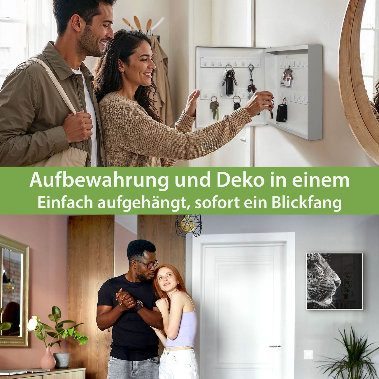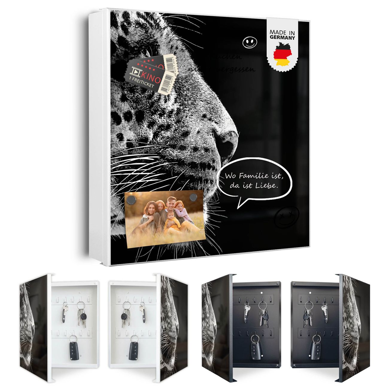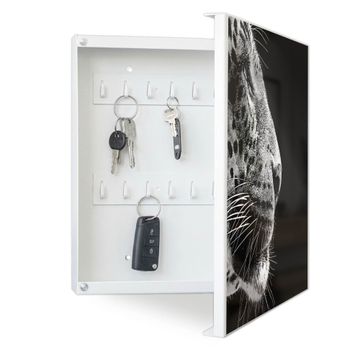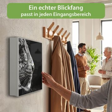 Bringe Ordnung und Eleganz in deinen Eingangsbereich mit dem banjado Schlüsselkasten Motiv Motiv Pauline. Die moderne Schlüsselbox kombiniert funktionales Design mit hochwertiger Verarbeitung und wird so zu einem echten Hingucker in Flur, Büro oder Ferienwohnung. ✅ Stilvolle Schlüsselaufbewahrung mit Motiv Motiv Pauline Der Design-Schlüsselkasten Motiv Motiv Pauline bietet Platz für bis zu 32 Schlüssel, die auf 4 stabilen Reihen mit je 8 Haken übersichtlich verstaut werden. Mit seinen kompakten Maßen von 30 x 30 x 5 cm passt die Schlüsselbox perfekt auch in kleinere Räume. Der weiß lackierte Stahlkorpus mit rechts angeschlagenem Türscharnier harmoniert mit gedruckten Folie auf der Front und fügt sich nahtlos in jedes Wohnambiente ein. Ob als Schlüsselorganizer für Zuhause oder als praktische Lösung für Büros, Praxen und Gewerbe, der banjado Schlüsselkasten sorgt für Ordnung und Übersicht. Dank der magnetischen, mit Kreidestiften beschreibbaren Folie auf der Front kannst du Notizen anheften oder Termine direkt auf der Oberfläche festhalten. Die Schlüsselbox Motiv Motiv Pauline zur Wandmontage wird inklusive Befestigungsmaterial geliefert und ist schnell angebracht. So hast du deine Schlüssel jederzeit griffbereit und zugleich stilvoll verstaut. Mit diesem banjado Schlüsselkasten Motiv Motiv Pauline kombinierst du praktische Aufbewahrung mit stilvollem Wohndesign. Ob privat oder geschäftlich, die Schlüsselbox sorgt für mehr Ordnung, Übersicht und ein wohnliches Ambiente.Vorteile im Überblick