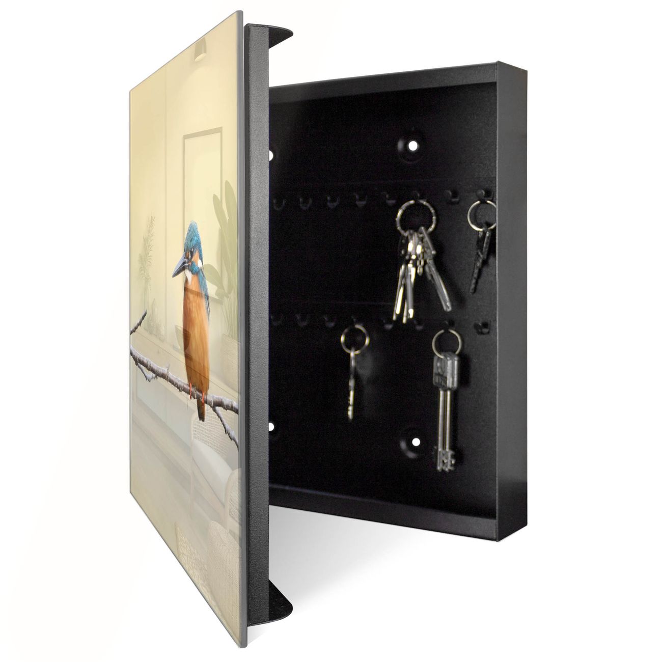 Bringe Ordnung und Eleganz in deinen Eingangsbereich mit dem banjado Schlüsselkasten Motiv Motiv Pause. Die moderne Schlüsselbox kombiniert funktionales Design mit hochwertiger Verarbeitung und wird so zu einem echten Hingucker in Flur, Büro oder Ferienwohnung. ✅ Stilvolle Schlüsselaufbewahrung mit Glasfront im Motiv Motiv Pause Der Design-Schlüsselkasten Motiv Motiv Pause bietet Platz für bis zu 50 Schlüssel, die auf 5 stabilen Reihen mit je 10 Haken übersichtlich verstaut werden. Mit seinen kompakten Maßen von 30 x 30 x 5 cm passt die Schlüsselbox perfekt auch in kleinere Räume. Der schwarz lackierte Stahlkorpus mit rechts angeschlagenem Türscharnier harmoniert mit der Glasfront und fügt sich nahtlos in jedes Wohnambiente ein. Ob als Schlüsselorganizer für Zuhause oder als praktische Lösung für Büros, Praxen und Gewerbe, der banjado Schlüsselkasten sorgt für Ordnung und Übersicht. Dank der magnetischen, mit Kreidestiften beschreibbaren Glasfront kannst du Notizen anheften oder Termine direkt auf der Oberfläche festhalten. Die Schlüsselbox Motiv Motiv Pause zur Wandmontage wird inklusive Befestigungsmaterial geliefert und ist schnell angebracht. So hast du deine Schlüssel jederzeit griffbereit und zugleich stilvoll verstaut. Mit diesem banjado Schlüsselkasten Motiv Motiv Pause kombinierst du praktische Aufbewahrung mit stilvollem Wohndesign. Ob privat oder geschäftlich, die Schlüsselbox sorgt für mehr Ordnung, Übersicht und ein wohnliches Ambiente.Vorteile im Überblick