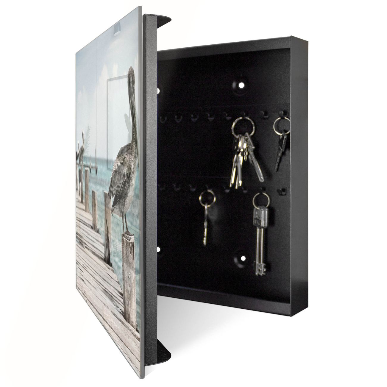 Bringe Ordnung und Eleganz in deinen Eingangsbereich mit dem banjado Schlüsselkasten Motiv Motiv Pelikane. Die moderne Schlüsselbox kombiniert funktionales Design mit hochwertiger Verarbeitung und wird so zu einem echten Hingucker in Flur, Büro oder Ferienwohnung. ✅ Stilvolle Schlüsselaufbewahrung mit Glasfront im Motiv Motiv Pelikane Der Design-Schlüsselkasten Motiv Motiv Pelikane bietet Platz für bis zu 50 Schlüssel, die auf 5 stabilen Reihen mit je 10 Haken übersichtlich verstaut werden. Mit seinen kompakten Maßen von 30 x 30 x 5 cm passt die Schlüsselbox perfekt auch in kleinere Räume. Der schwarz lackierte Stahlkorpus mit rechts angeschlagenem Türscharnier harmoniert mit der Glasfront und fügt sich nahtlos in jedes Wohnambiente ein. Ob als Schlüsselorganizer für Zuhause oder als praktische Lösung für Büros, Praxen und Gewerbe, der banjado Schlüsselkasten sorgt für Ordnung und Übersicht. Dank der magnetischen, mit Kreidestiften beschreibbaren Glasfront kannst du Notizen anheften oder Termine direkt auf der Oberfläche festhalten. Die Schlüsselbox Motiv Motiv Pelikane zur Wandmontage wird inklusive Befestigungsmaterial geliefert und ist schnell angebracht. So hast du deine Schlüssel jederzeit griffbereit und zugleich stilvoll verstaut. Mit diesem banjado Schlüsselkasten Motiv Motiv Pelikane kombinierst du praktische Aufbewahrung mit stilvollem Wohndesign. Ob privat oder geschäftlich, die Schlüsselbox sorgt für mehr Ordnung, Übersicht und ein wohnliches Ambiente.Vorteile im Überblick