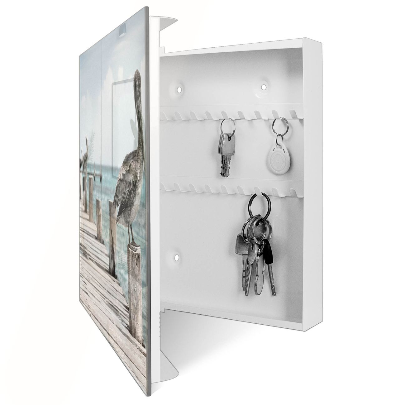 Bringe Ordnung und Eleganz in deinen Eingangsbereich mit dem banjado Schlüsselkasten Motiv Motiv Pelikane. Die moderne Schlüsselbox kombiniert funktionales Design mit hochwertiger Verarbeitung und wird so zu einem echten Hingucker in Flur, Büro oder Ferienwohnung. ✅ Stilvolle Schlüsselaufbewahrung mit Glasfront im Motiv Motiv Pelikane Der Design-Schlüsselkasten Motiv Motiv Pelikane bietet Platz für bis zu 50 Schlüssel, die auf 5 stabilen Reihen mit je 10 Haken übersichtlich verstaut werden. Mit seinen kompakten Maßen von 30 x 30 x 5 cm passt die Schlüsselbox perfekt auch in kleinere Räume. Der weiß lackierte Stahlkorpus mit rechts angeschlagenem Türscharnier harmoniert mit der Glasfront und fügt sich nahtlos in jedes Wohnambiente ein. Ob als Schlüsselorganizer für Zuhause oder als praktische Lösung für Büros, Praxen und Gewerbe, der banjado Schlüsselkasten sorgt für Ordnung und Übersicht. Dank der magnetischen, mit Kreidestiften beschreibbaren Glasfront kannst du Notizen anheften oder Termine direkt auf der Oberfläche festhalten. Die Schlüsselbox Motiv Motiv Pelikane zur Wandmontage wird inklusive Befestigungsmaterial geliefert und ist schnell angebracht. So hast du deine Schlüssel jederzeit griffbereit und zugleich stilvoll verstaut. Mit diesem banjado Schlüsselkasten Motiv Motiv Pelikane kombinierst du praktische Aufbewahrung mit stilvollem Wohndesign. Ob privat oder geschäftlich, die Schlüsselbox sorgt für mehr Ordnung, Übersicht und ein wohnliches Ambiente.Vorteile im Überblick
