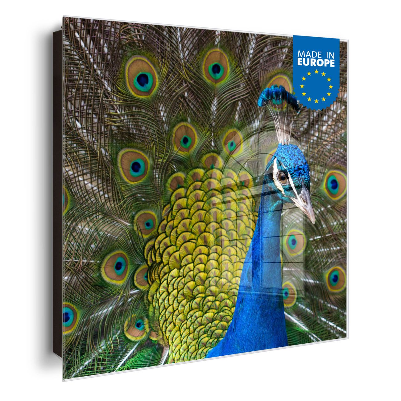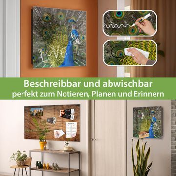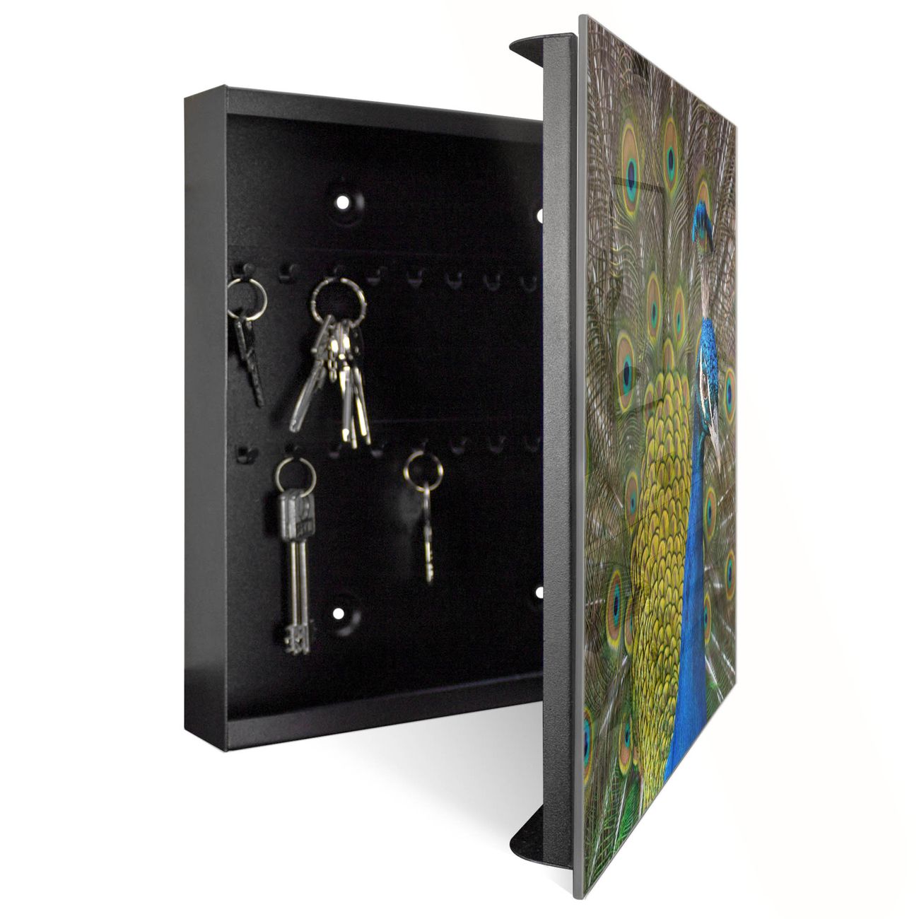 Bringe Ordnung und Eleganz in deinen Eingangsbereich mit dem banjado Schlüsselkasten Motiv Motiv Pfau. Die moderne Schlüsselbox kombiniert funktionales Design mit hochwertiger Verarbeitung und wird so zu einem echten Hingucker in Flur, Büro oder Ferienwohnung. ✅ Stilvolle Schlüsselaufbewahrung mit Glasfront im Motiv Motiv Pfau Der Design-Schlüsselkasten Motiv Motiv Pfau bietet Platz für bis zu 50 Schlüssel, die auf 5 stabilen Reihen mit je 10 Haken übersichtlich verstaut werden. Mit seinen kompakten Maßen von 30 x 30 x 5 cm passt die Schlüsselbox perfekt auch in kleinere Räume. Der schwarz lackierte Stahlkorpus mit rechts angeschlagenem Türscharnier harmoniert mit der Glasfront und fügt sich nahtlos in jedes Wohnambiente ein. Ob als Schlüsselorganizer für Zuhause oder als praktische Lösung für Büros, Praxen und Gewerbe, der banjado Schlüsselkasten sorgt für Ordnung und Übersicht. Dank der magnetischen, mit Kreidestiften beschreibbaren Glasfront kannst du Notizen anheften oder Termine direkt auf der Oberfläche festhalten. Die Schlüsselbox Motiv Motiv Pfau zur Wandmontage wird inklusive Befestigungsmaterial geliefert und ist schnell angebracht. So hast du deine Schlüssel jederzeit griffbereit und zugleich stilvoll verstaut. Mit diesem banjado Schlüsselkasten Motiv Motiv Pfau kombinierst du praktische Aufbewahrung mit stilvollem Wohndesign. Ob privat oder geschäftlich, die Schlüsselbox sorgt für mehr Ordnung, Übersicht und ein wohnliches Ambiente.Vorteile im Überblick