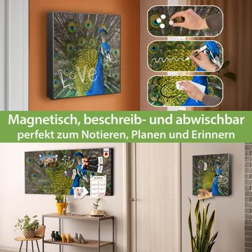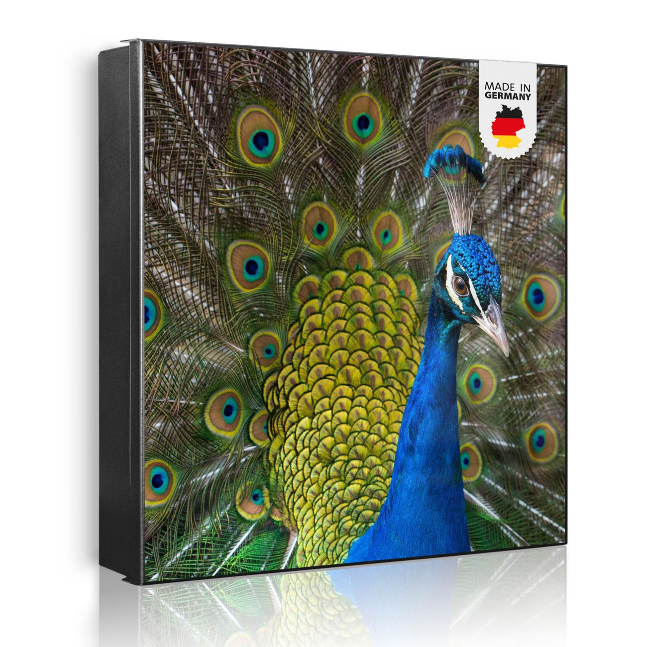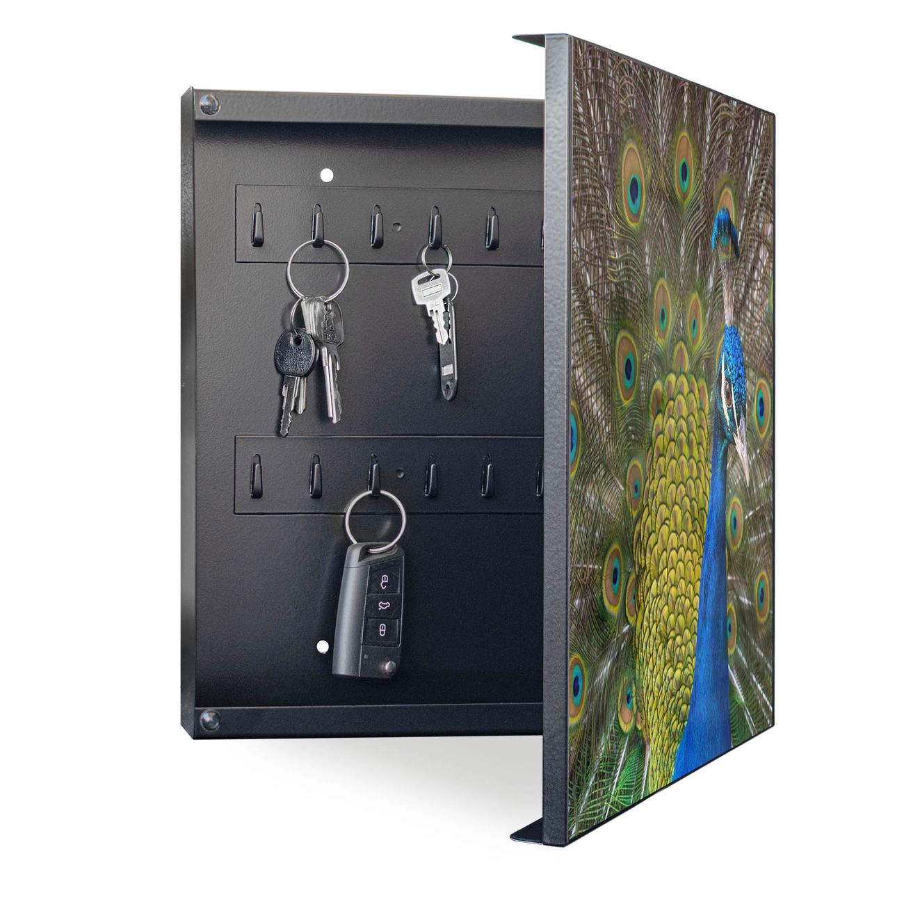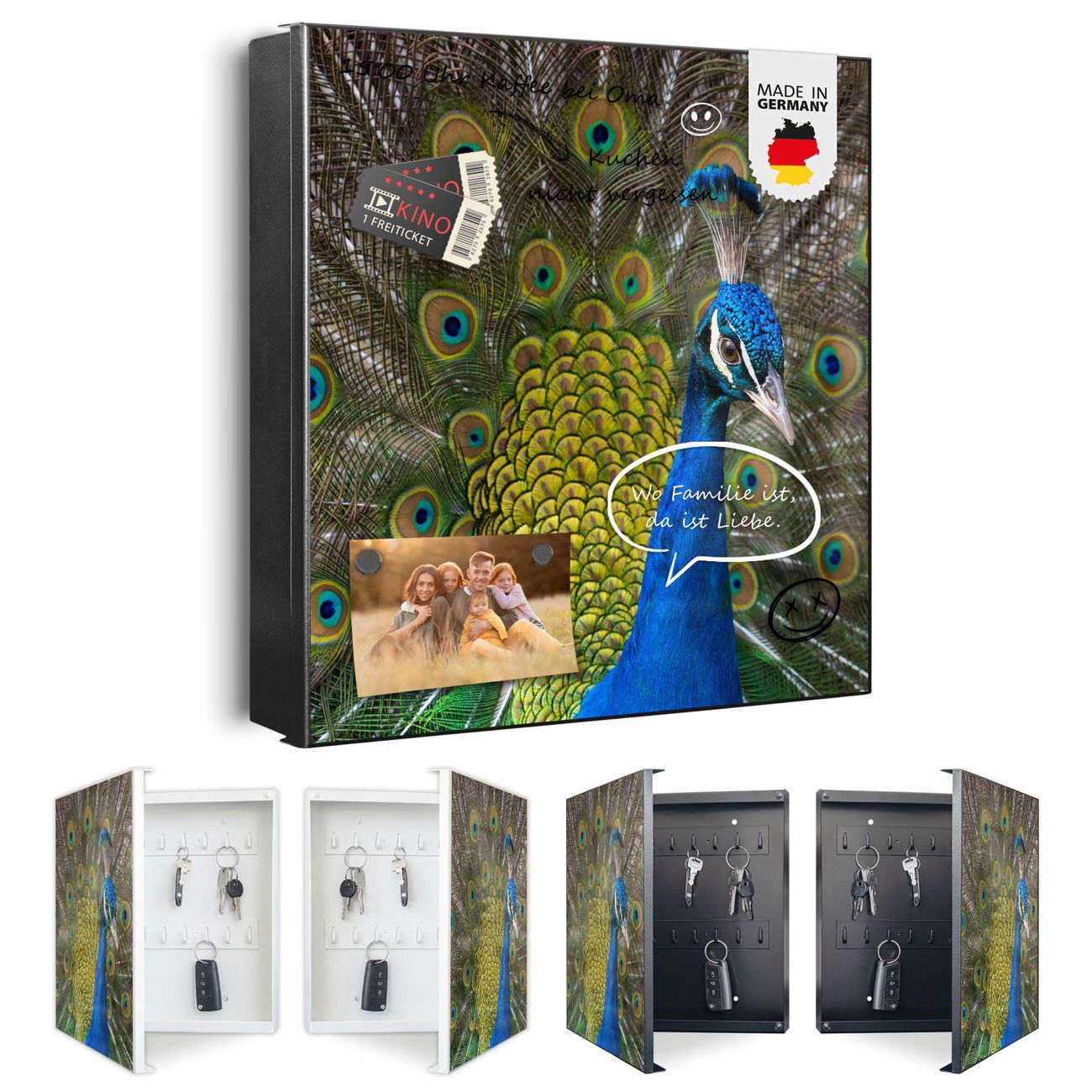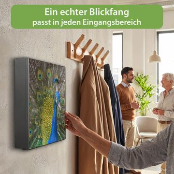 Bringe Ordnung und Eleganz in deinen Eingangsbereich mit dem banjado Schlüsselkasten Motiv Motiv Pfau. Die moderne Schlüsselbox kombiniert funktionales Design mit hochwertiger Verarbeitung und wird so zu einem echten Hingucker in Flur, Büro oder Ferienwohnung. ✅ Stilvolle Schlüsselaufbewahrung mit Motiv Motiv Pfau Der Design-Schlüsselkasten Motiv Motiv Pfau bietet Platz für bis zu 32 Schlüssel, die auf 4 stabilen Reihen mit je 8 Haken übersichtlich verstaut werden. Mit seinen kompakten Maßen von 30 x 30 x 5 cm passt die Schlüsselbox perfekt auch in kleinere Räume. Der schwarz lackierte Stahlkorpus mit rechts angeschlagenem Türscharnier harmoniert mit gedruckten Folie auf der Front und fügt sich nahtlos in jedes Wohnambiente ein. Ob als Schlüsselorganizer für Zuhause oder als praktische Lösung für Büros, Praxen und Gewerbe, der banjado Schlüsselkasten sorgt für Ordnung und Übersicht. Dank der magnetischen, mit Kreidestiften beschreibbaren Folie auf der Front kannst du Notizen anheften oder Termine direkt auf der Oberfläche festhalten. Die Schlüsselbox Motiv Motiv Pfau zur Wandmontage wird inklusive Befestigungsmaterial geliefert und ist schnell angebracht. So hast du deine Schlüssel jederzeit griffbereit und zugleich stilvoll verstaut. Mit diesem banjado Schlüsselkasten Motiv Motiv Pfau kombinierst du praktische Aufbewahrung mit stilvollem Wohndesign. Ob privat oder geschäftlich, die Schlüsselbox sorgt für mehr Ordnung, Übersicht und ein wohnliches Ambiente.Vorteile im Überblick