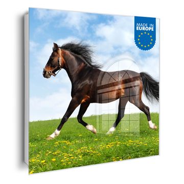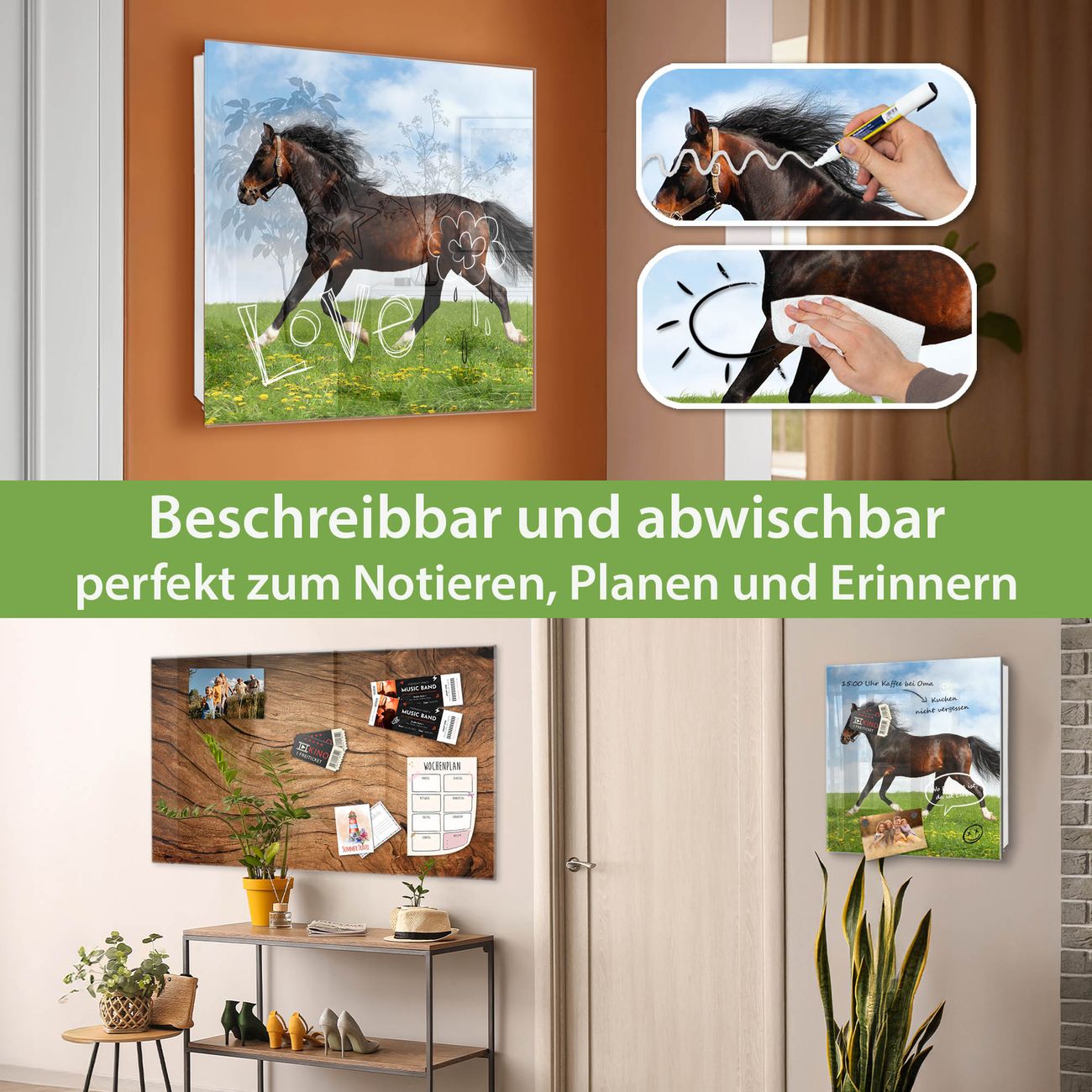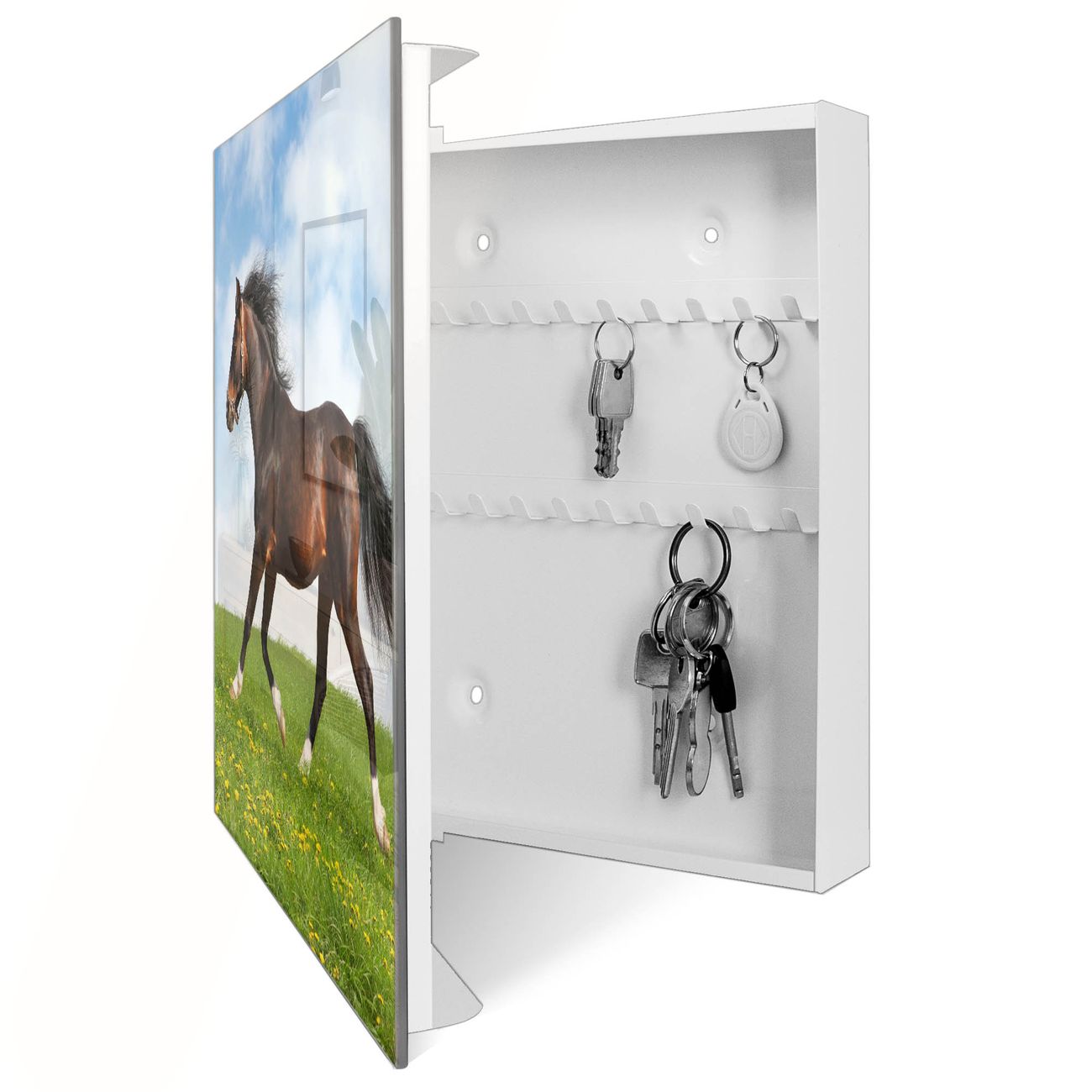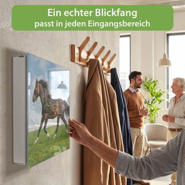 Bringe Ordnung und Eleganz in deinen Eingangsbereich mit dem banjado Schlüsselkasten Motiv Motiv Pferd. Die moderne Schlüsselbox kombiniert funktionales Design mit hochwertiger Verarbeitung und wird so zu einem echten Hingucker in Flur, Büro oder Ferienwohnung. ✅ Stilvolle Schlüsselaufbewahrung mit Glasfront im Motiv Motiv Pferd Der Design-Schlüsselkasten Motiv Motiv Pferd bietet Platz für bis zu 50 Schlüssel, die auf 5 stabilen Reihen mit je 10 Haken übersichtlich verstaut werden. Mit seinen kompakten Maßen von 30 x 30 x 5 cm passt die Schlüsselbox perfekt auch in kleinere Räume. Der weiß lackierte Stahlkorpus mit rechts angeschlagenem Türscharnier harmoniert mit der Glasfront und fügt sich nahtlos in jedes Wohnambiente ein. Ob als Schlüsselorganizer für Zuhause oder als praktische Lösung für Büros, Praxen und Gewerbe, der banjado Schlüsselkasten sorgt für Ordnung und Übersicht. Dank der magnetischen, mit Kreidestiften beschreibbaren Glasfront kannst du Notizen anheften oder Termine direkt auf der Oberfläche festhalten. Die Schlüsselbox Motiv Motiv Pferd zur Wandmontage wird inklusive Befestigungsmaterial geliefert und ist schnell angebracht. So hast du deine Schlüssel jederzeit griffbereit und zugleich stilvoll verstaut. Mit diesem banjado Schlüsselkasten Motiv Motiv Pferd kombinierst du praktische Aufbewahrung mit stilvollem Wohndesign. Ob privat oder geschäftlich, die Schlüsselbox sorgt für mehr Ordnung, Übersicht und ein wohnliches Ambiente.Vorteile im Überblick