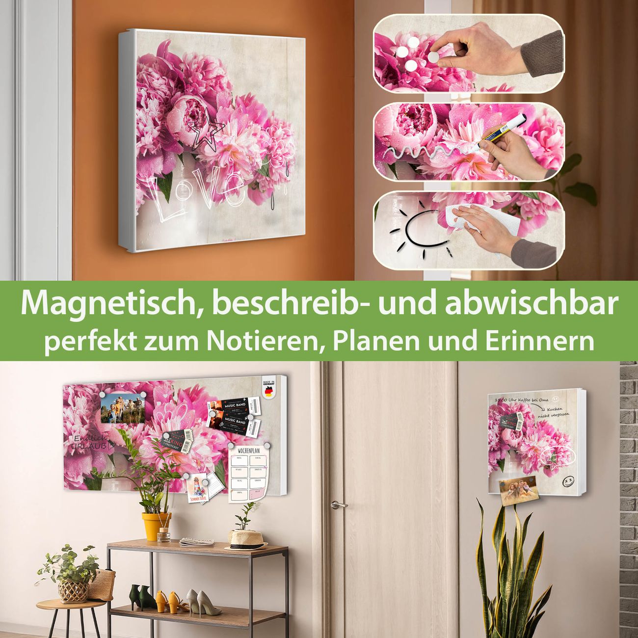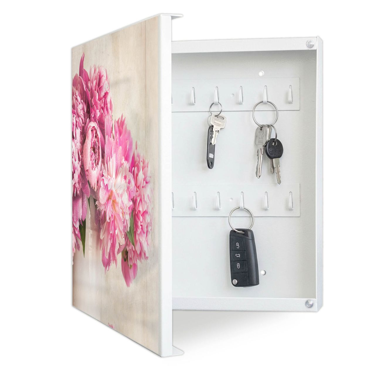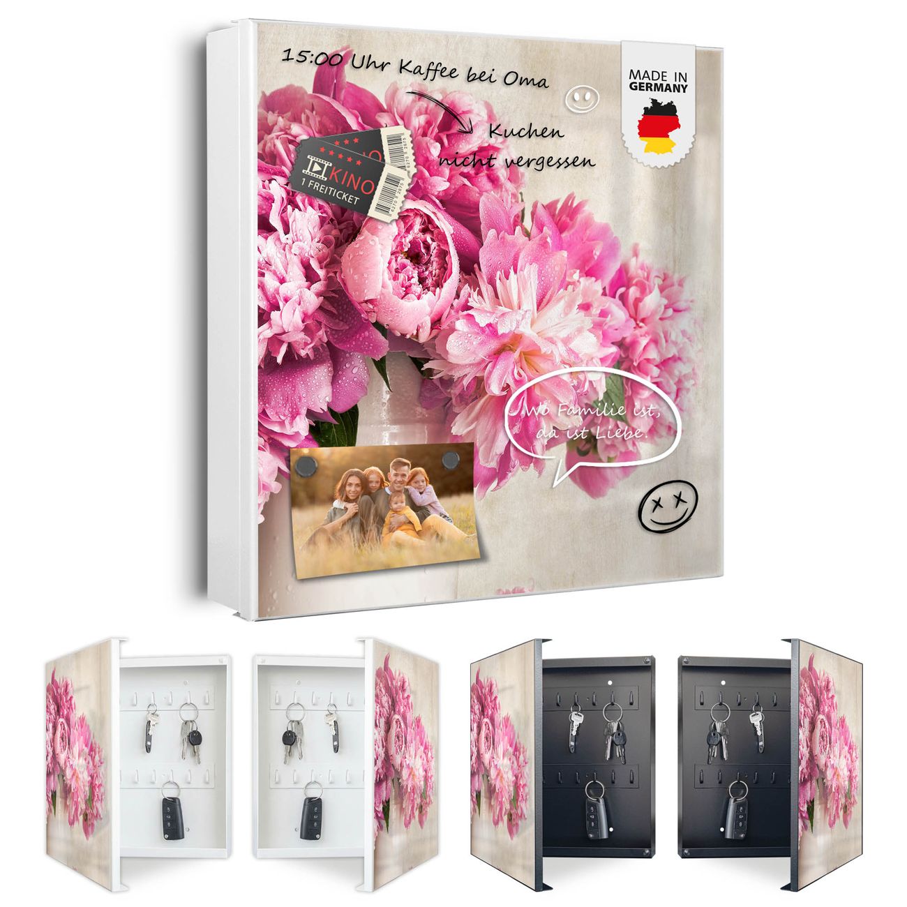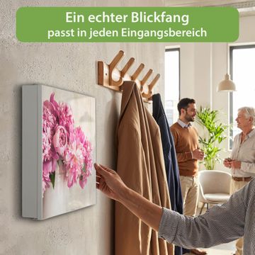 Bringe Ordnung und Eleganz in deinen Eingangsbereich mit dem banjado Schlüsselkasten Motiv Motiv Pfingstrose. Die moderne Schlüsselbox kombiniert funktionales Design mit hochwertiger Verarbeitung und wird so zu einem echten Hingucker in Flur, Büro oder Ferienwohnung. ✅ Stilvolle Schlüsselaufbewahrung mit Motiv Motiv Pfingstrose Der Design-Schlüsselkasten Motiv Motiv Pfingstrose bietet Platz für bis zu 32 Schlüssel, die auf 4 stabilen Reihen mit je 8 Haken übersichtlich verstaut werden. Mit seinen kompakten Maßen von 30 x 30 x 5 cm passt die Schlüsselbox perfekt auch in kleinere Räume. Der weiß lackierte Stahlkorpus mit links angeschlagenem Türscharnier harmoniert mit gedruckten Folie auf der Front und fügt sich nahtlos in jedes Wohnambiente ein. Ob als Schlüsselorganizer für Zuhause oder als praktische Lösung für Büros, Praxen und Gewerbe, der banjado Schlüsselkasten sorgt für Ordnung und Übersicht. Dank der magnetischen, mit Kreidestiften beschreibbaren Folie auf der Front kannst du Notizen anheften oder Termine direkt auf der Oberfläche festhalten. Die Schlüsselbox Motiv Motiv Pfingstrose zur Wandmontage wird inklusive Befestigungsmaterial geliefert und ist schnell angebracht. So hast du deine Schlüssel jederzeit griffbereit und zugleich stilvoll verstaut. Mit diesem banjado Schlüsselkasten Motiv Motiv Pfingstrose kombinierst du praktische Aufbewahrung mit stilvollem Wohndesign. Ob privat oder geschäftlich, die Schlüsselbox sorgt für mehr Ordnung, Übersicht und ein wohnliches Ambiente.Vorteile im Überblick