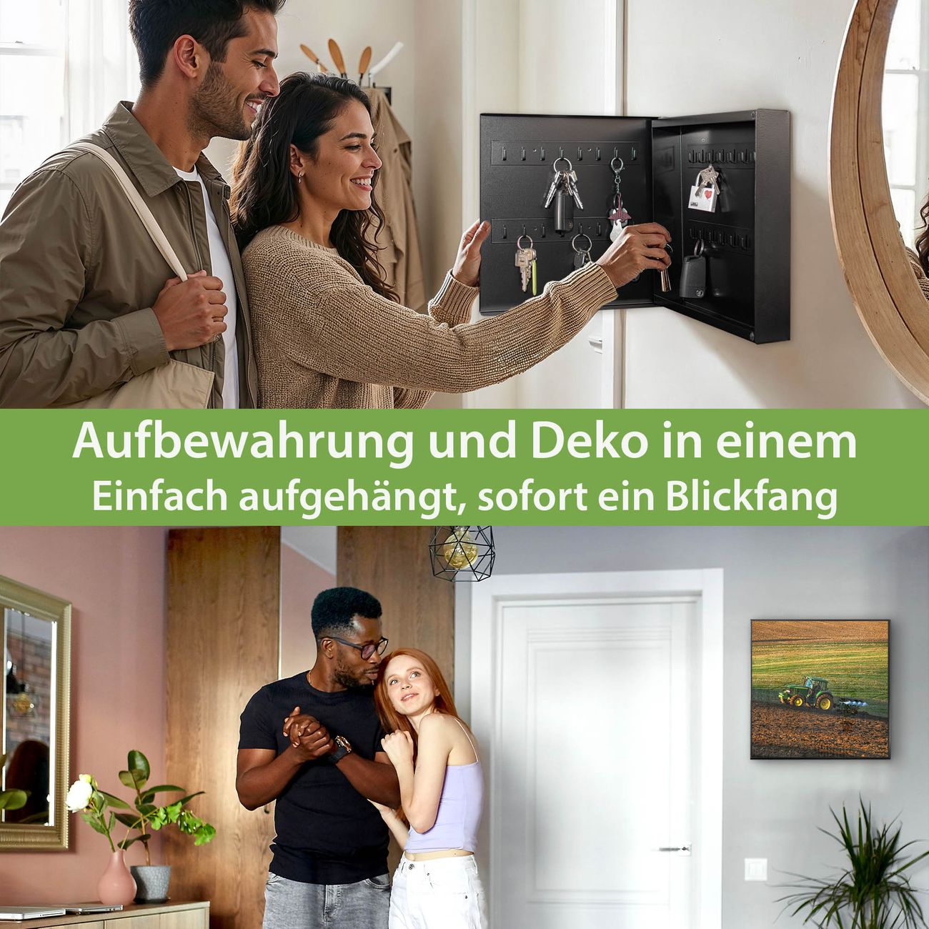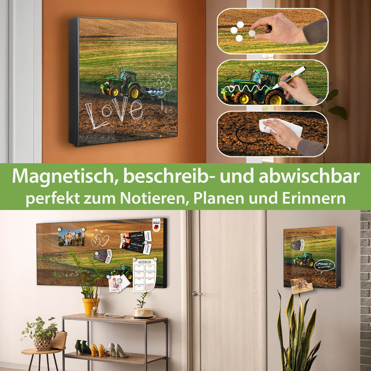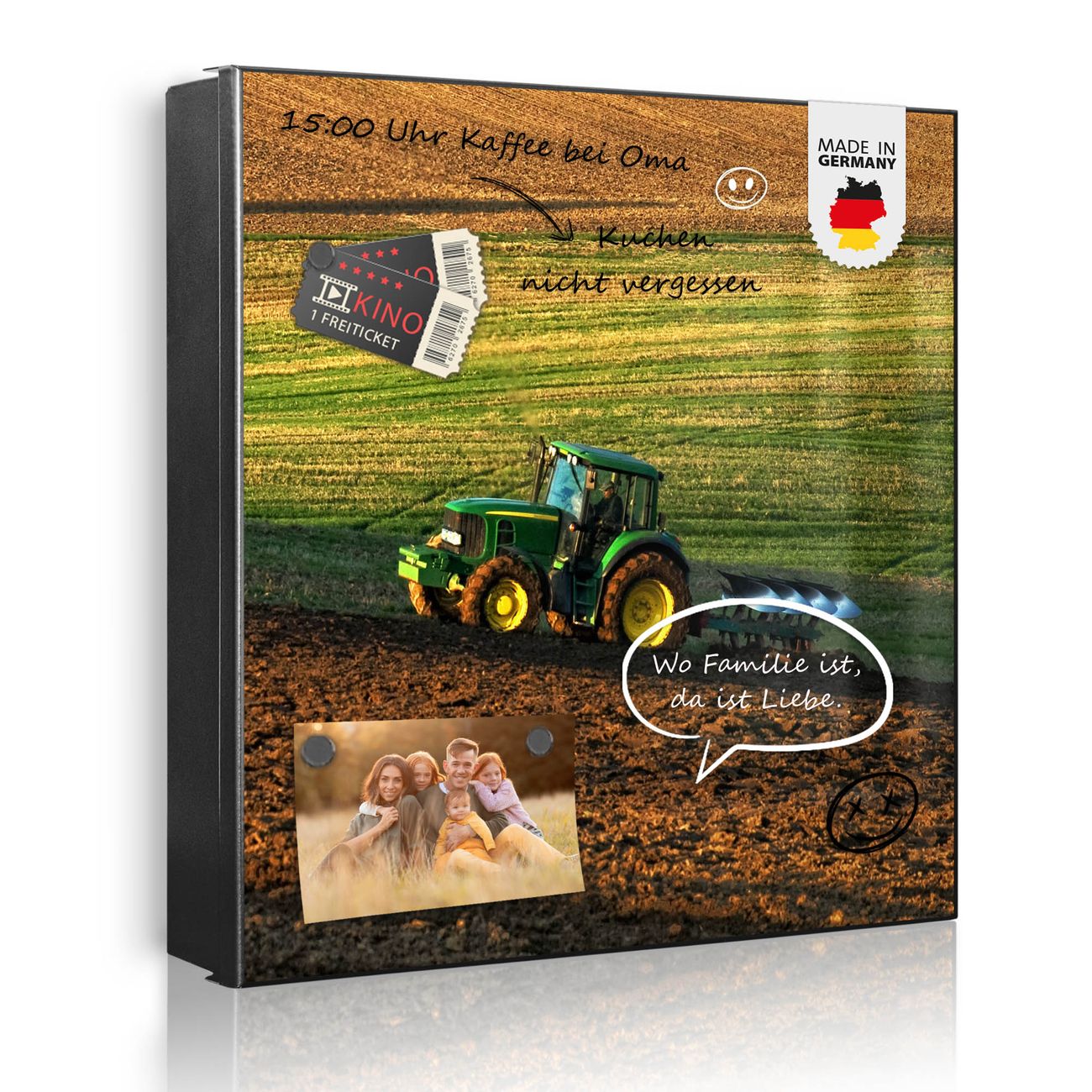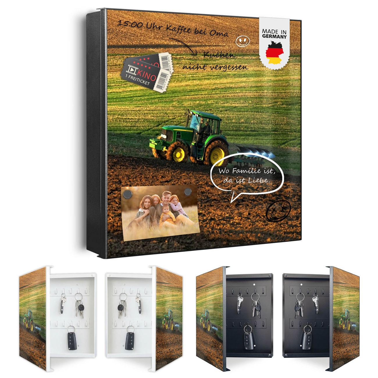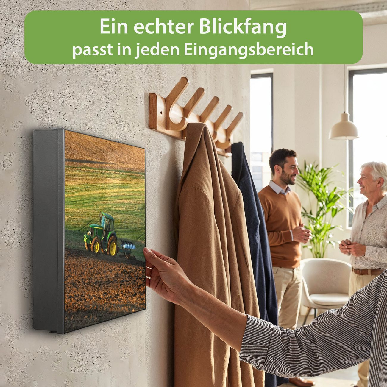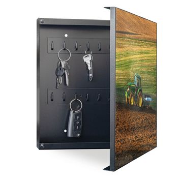 Bringe Ordnung und Eleganz in deinen Eingangsbereich mit dem banjado Schlüsselkasten Motiv Motiv Pflügen. Die moderne Schlüsselbox kombiniert funktionales Design mit hochwertiger Verarbeitung und wird so zu einem echten Hingucker in Flur, Büro oder Ferienwohnung. ✅ Stilvolle Schlüsselaufbewahrung mit Motiv Motiv Pflügen Der Design-Schlüsselkasten Motiv Motiv Pflügen bietet Platz für bis zu 32 Schlüssel, die auf 4 stabilen Reihen mit je 8 Haken übersichtlich verstaut werden. Mit seinen kompakten Maßen von 30 x 30 x 5 cm passt die Schlüsselbox perfekt auch in kleinere Räume. Der schwarz lackierte Stahlkorpus mit rechts angeschlagenem Türscharnier harmoniert mit gedruckten Folie auf der Front und fügt sich nahtlos in jedes Wohnambiente ein. Ob als Schlüsselorganizer für Zuhause oder als praktische Lösung für Büros, Praxen und Gewerbe, der banjado Schlüsselkasten sorgt für Ordnung und Übersicht. Dank der magnetischen, mit Kreidestiften beschreibbaren Folie auf der Front kannst du Notizen anheften oder Termine direkt auf der Oberfläche festhalten. Die Schlüsselbox Motiv Motiv Pflügen zur Wandmontage wird inklusive Befestigungsmaterial geliefert und ist schnell angebracht. So hast du deine Schlüssel jederzeit griffbereit und zugleich stilvoll verstaut. Mit diesem banjado Schlüsselkasten Motiv Motiv Pflügen kombinierst du praktische Aufbewahrung mit stilvollem Wohndesign. Ob privat oder geschäftlich, die Schlüsselbox sorgt für mehr Ordnung, Übersicht und ein wohnliches Ambiente.Vorteile im Überblick