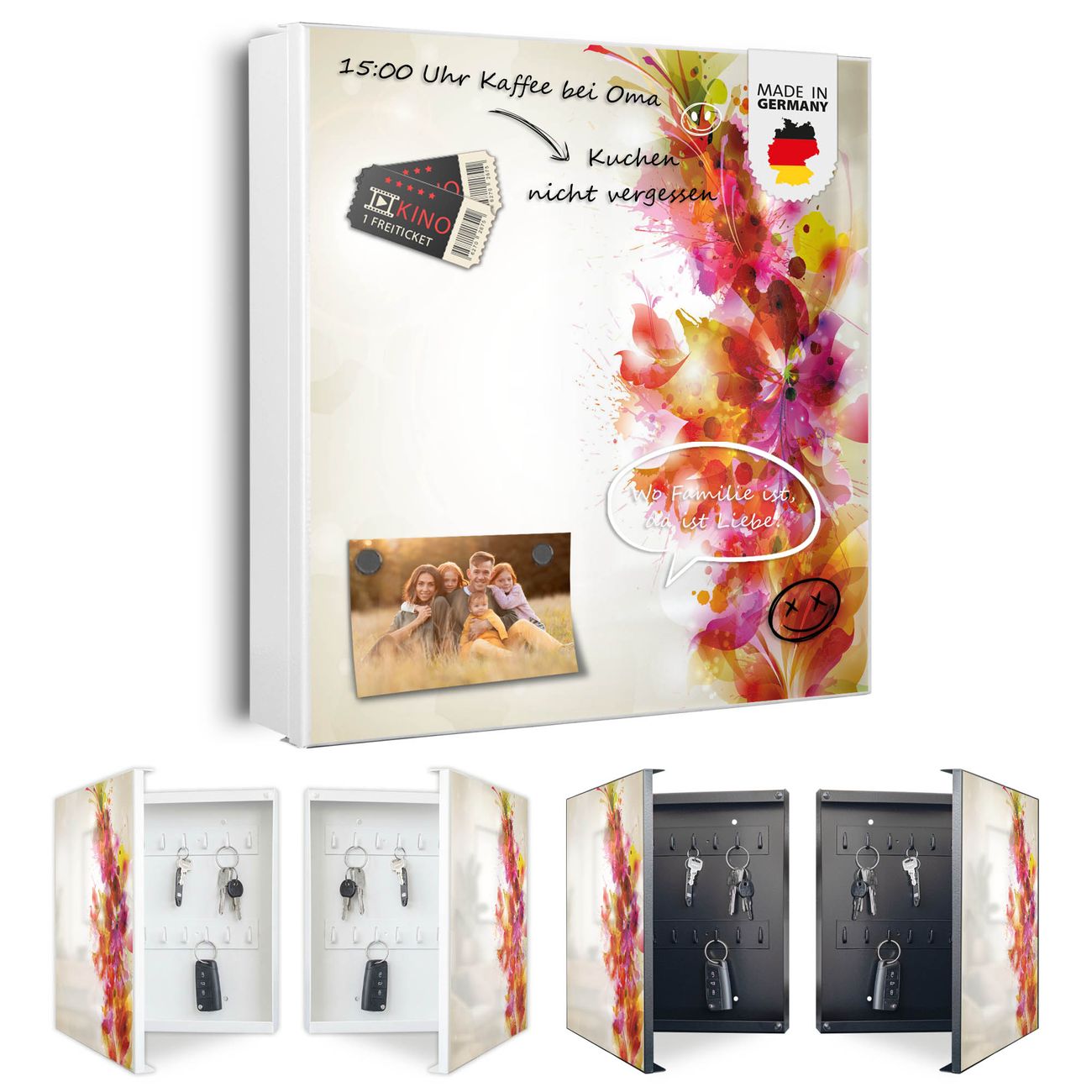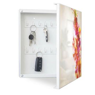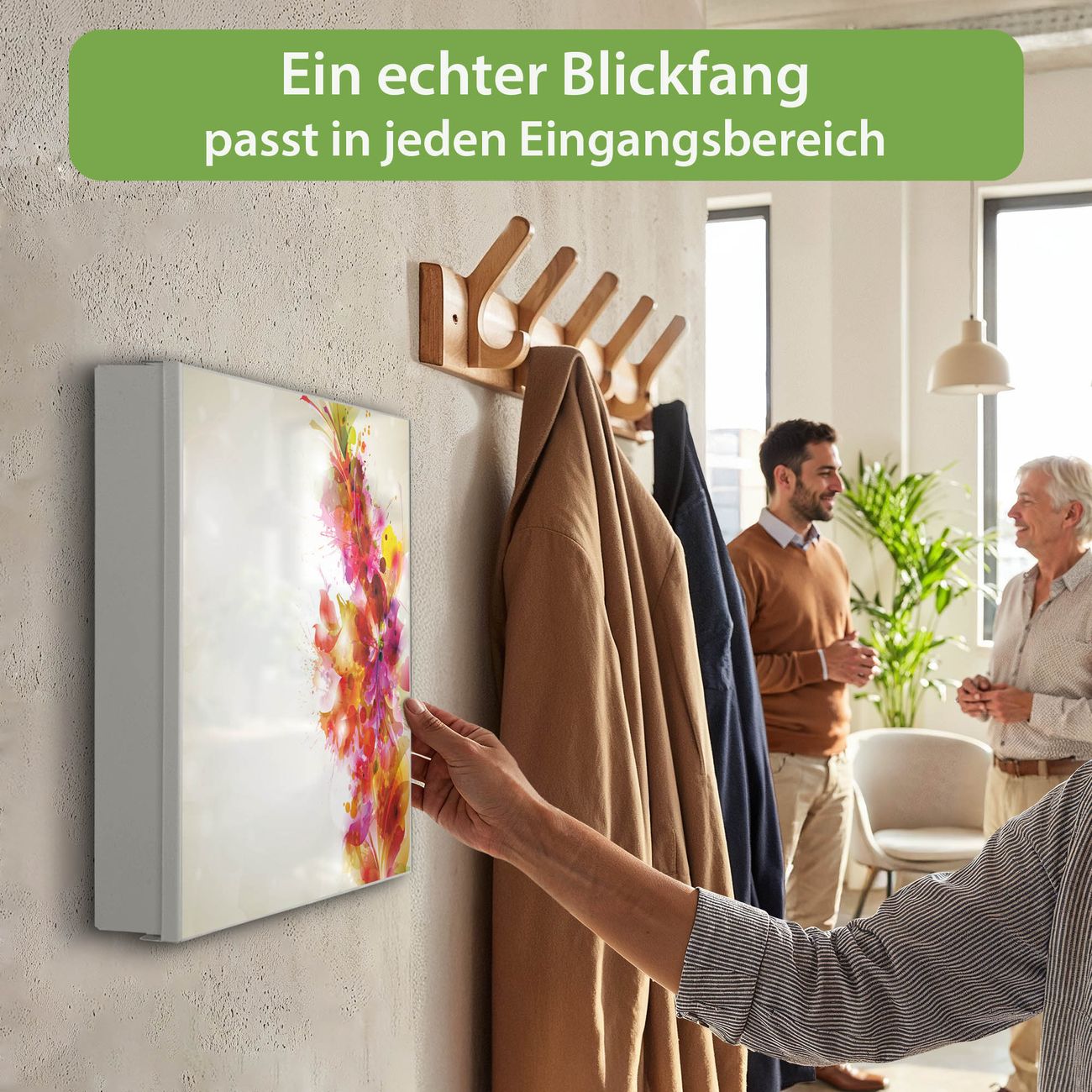 Bringe Ordnung und Eleganz in deinen Eingangsbereich mit dem banjado Schlüsselkasten Motiv Motiv Pink Explosion. Die moderne Schlüsselbox kombiniert funktionales Design mit hochwertiger Verarbeitung und wird so zu einem echten Hingucker in Flur, Büro oder Ferienwohnung. ✅ Stilvolle Schlüsselaufbewahrung mit Motiv Motiv Pink Explosion Der Design-Schlüsselkasten Motiv Motiv Pink Explosion bietet Platz für bis zu 32 Schlüssel, die auf 4 stabilen Reihen mit je 8 Haken übersichtlich verstaut werden. Mit seinen kompakten Maßen von 30 x 30 x 5 cm passt die Schlüsselbox perfekt auch in kleinere Räume. Der weiß lackierte Stahlkorpus mit rechts angeschlagenem Türscharnier harmoniert mit gedruckten Folie auf der Front und fügt sich nahtlos in jedes Wohnambiente ein. Ob als Schlüsselorganizer für Zuhause oder als praktische Lösung für Büros, Praxen und Gewerbe, der banjado Schlüsselkasten sorgt für Ordnung und Übersicht. Dank der magnetischen, mit Kreidestiften beschreibbaren Folie auf der Front kannst du Notizen anheften oder Termine direkt auf der Oberfläche festhalten. Die Schlüsselbox Motiv Motiv Pink Explosion zur Wandmontage wird inklusive Befestigungsmaterial geliefert und ist schnell angebracht. So hast du deine Schlüssel jederzeit griffbereit und zugleich stilvoll verstaut. Mit diesem banjado Schlüsselkasten Motiv Motiv Pink Explosion kombinierst du praktische Aufbewahrung mit stilvollem Wohndesign. Ob privat oder geschäftlich, die Schlüsselbox sorgt für mehr Ordnung, Übersicht und ein wohnliches Ambiente.Vorteile im Überblick