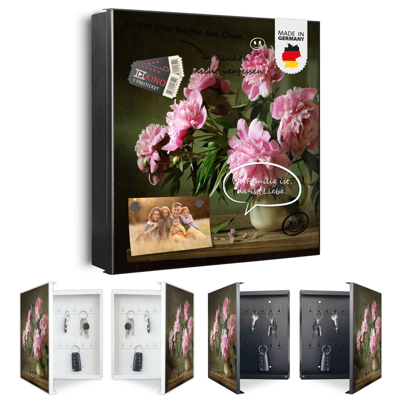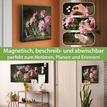 Bringe Ordnung und Eleganz in deinen Eingangsbereich mit dem banjado Schlüsselkasten Motiv Motiv Pinke Pfingstrosen. Die moderne Schlüsselbox kombiniert funktionales Design mit hochwertiger Verarbeitung und wird so zu einem echten Hingucker in Flur, Büro oder Ferienwohnung. ✅ Stilvolle Schlüsselaufbewahrung mit Motiv Motiv Pinke Pfingstrosen Der Design-Schlüsselkasten Motiv Motiv Pinke Pfingstrosen bietet Platz für bis zu 32 Schlüssel, die auf 4 stabilen Reihen mit je 8 Haken übersichtlich verstaut werden. Mit seinen kompakten Maßen von 30 x 30 x 5 cm passt die Schlüsselbox perfekt auch in kleinere Räume. Der schwarz lackierte Stahlkorpus mit rechts angeschlagenem Türscharnier harmoniert mit gedruckten Folie auf der Front und fügt sich nahtlos in jedes Wohnambiente ein. Ob als Schlüsselorganizer für Zuhause oder als praktische Lösung für Büros, Praxen und Gewerbe, der banjado Schlüsselkasten sorgt für Ordnung und Übersicht. Dank der magnetischen, mit Kreidestiften beschreibbaren Folie auf der Front kannst du Notizen anheften oder Termine direkt auf der Oberfläche festhalten. Die Schlüsselbox Motiv Motiv Pinke Pfingstrosen zur Wandmontage wird inklusive Befestigungsmaterial geliefert und ist schnell angebracht. So hast du deine Schlüssel jederzeit griffbereit und zugleich stilvoll verstaut. Mit diesem banjado Schlüsselkasten Motiv Motiv Pinke Pfingstrosen kombinierst du praktische Aufbewahrung mit stilvollem Wohndesign. Ob privat oder geschäftlich, die Schlüsselbox sorgt für mehr Ordnung, Übersicht und ein wohnliches Ambiente.Vorteile im Überblick
