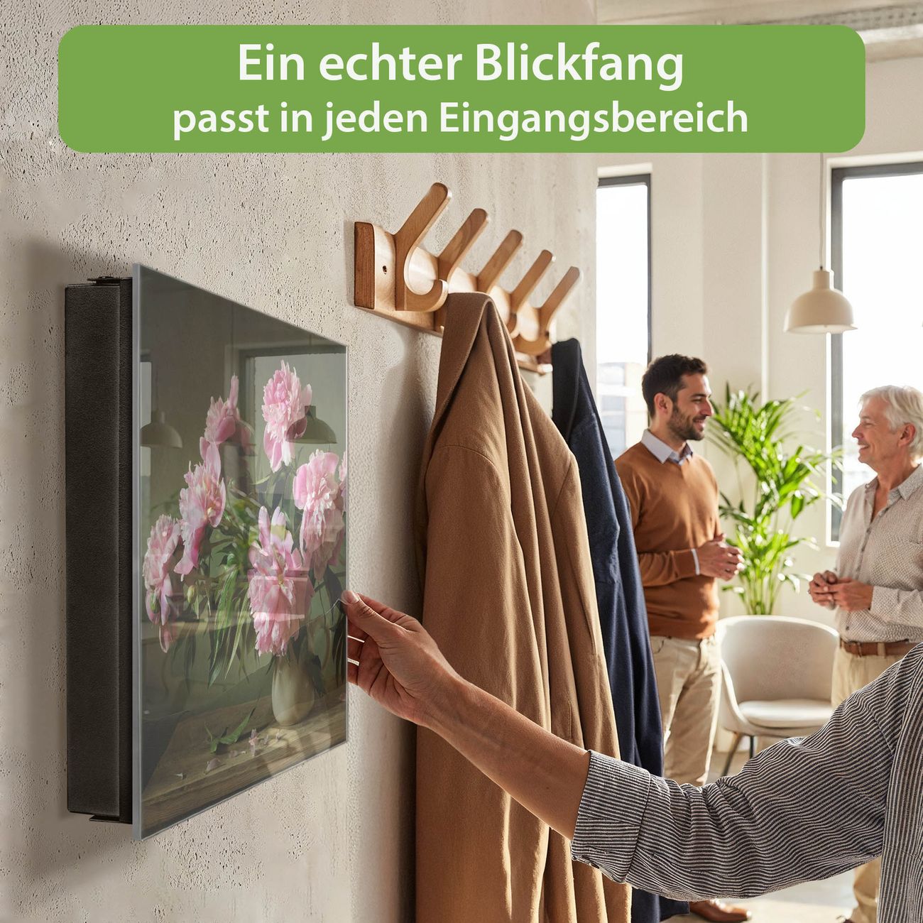 Bringe Ordnung und Eleganz in deinen Eingangsbereich mit dem banjado Schlüsselkasten Motiv Motiv Pinke Pfingstrosen. Die moderne Schlüsselbox kombiniert funktionales Design mit hochwertiger Verarbeitung und wird so zu einem echten Hingucker in Flur, Büro oder Ferienwohnung. ✅ Stilvolle Schlüsselaufbewahrung mit Glasfront im Motiv Motiv Pinke Pfingstrosen Der Design-Schlüsselkasten Motiv Motiv Pinke Pfingstrosen bietet Platz für bis zu 50 Schlüssel, die auf 5 stabilen Reihen mit je 10 Haken übersichtlich verstaut werden. Mit seinen kompakten Maßen von 30 x 30 x 5 cm passt die Schlüsselbox perfekt auch in kleinere Räume. Der schwarz lackierte Stahlkorpus mit rechts angeschlagenem Türscharnier harmoniert mit der Glasfront und fügt sich nahtlos in jedes Wohnambiente ein. Ob als Schlüsselorganizer für Zuhause oder als praktische Lösung für Büros, Praxen und Gewerbe, der banjado Schlüsselkasten sorgt für Ordnung und Übersicht. Dank der magnetischen, mit Kreidestiften beschreibbaren Glasfront kannst du Notizen anheften oder Termine direkt auf der Oberfläche festhalten. Die Schlüsselbox Motiv Motiv Pinke Pfingstrosen zur Wandmontage wird inklusive Befestigungsmaterial geliefert und ist schnell angebracht. So hast du deine Schlüssel jederzeit griffbereit und zugleich stilvoll verstaut. Mit diesem banjado Schlüsselkasten Motiv Motiv Pinke Pfingstrosen kombinierst du praktische Aufbewahrung mit stilvollem Wohndesign. Ob privat oder geschäftlich, die Schlüsselbox sorgt für mehr Ordnung, Übersicht und ein wohnliches Ambiente.Vorteile im Überblick