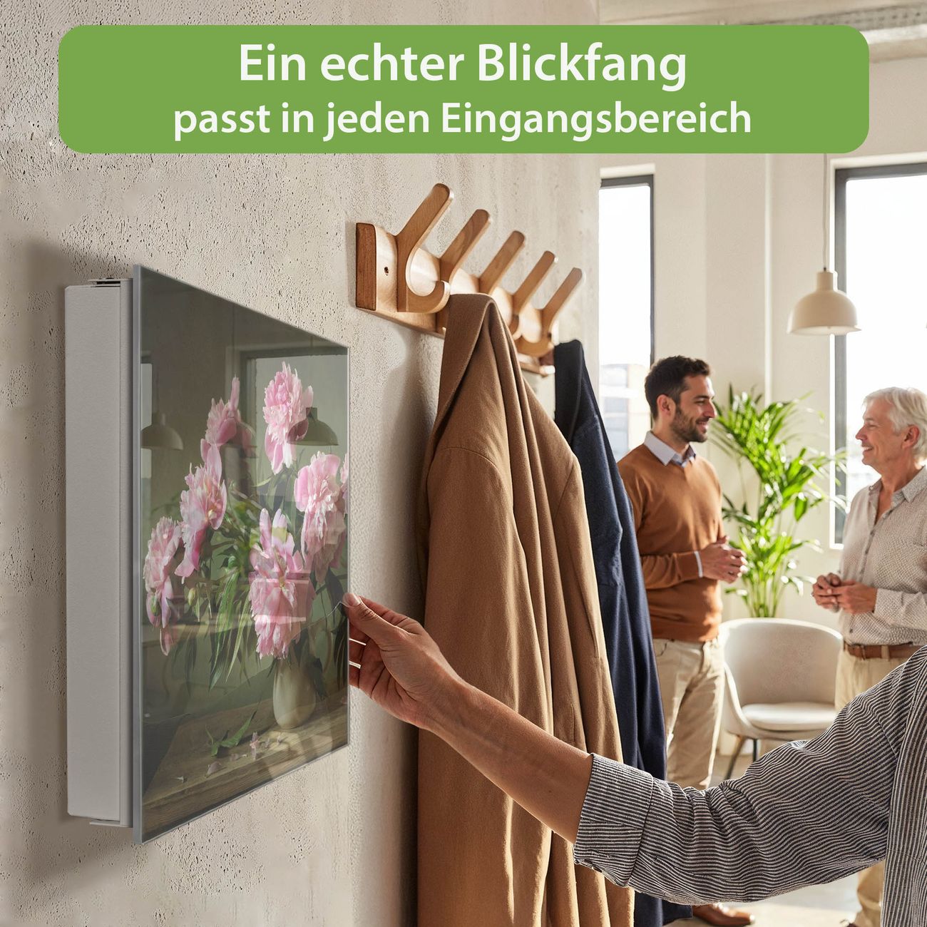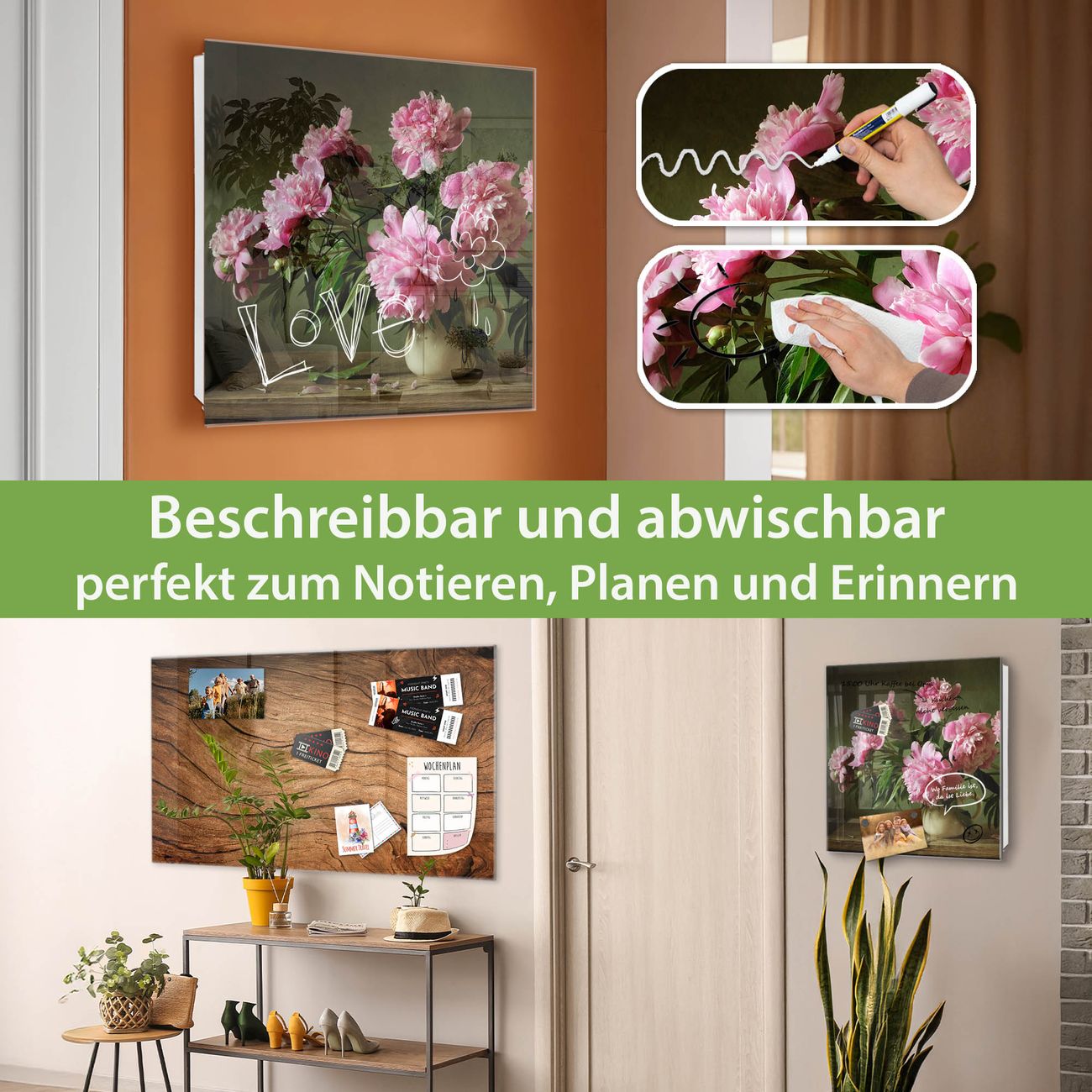 Bringe Ordnung und Eleganz in deinen Eingangsbereich mit dem banjado Schlüsselkasten Motiv Motiv Pinke Pfingstrosen. Die moderne Schlüsselbox kombiniert funktionales Design mit hochwertiger Verarbeitung und wird so zu einem echten Hingucker in Flur, Büro oder Ferienwohnung. ✅ Stilvolle Schlüsselaufbewahrung mit Glasfront im Motiv Motiv Pinke Pfingstrosen Der Design-Schlüsselkasten Motiv Motiv Pinke Pfingstrosen bietet Platz für bis zu 50 Schlüssel, die auf 5 stabilen Reihen mit je 10 Haken übersichtlich verstaut werden. Mit seinen kompakten Maßen von 30 x 30 x 5 cm passt die Schlüsselbox perfekt auch in kleinere Räume. Der weiß lackierte Stahlkorpus mit rechts angeschlagenem Türscharnier harmoniert mit der Glasfront und fügt sich nahtlos in jedes Wohnambiente ein. Ob als Schlüsselorganizer für Zuhause oder als praktische Lösung für Büros, Praxen und Gewerbe, der banjado Schlüsselkasten sorgt für Ordnung und Übersicht. Dank der magnetischen, mit Kreidestiften beschreibbaren Glasfront kannst du Notizen anheften oder Termine direkt auf der Oberfläche festhalten. Die Schlüsselbox Motiv Motiv Pinke Pfingstrosen zur Wandmontage wird inklusive Befestigungsmaterial geliefert und ist schnell angebracht. So hast du deine Schlüssel jederzeit griffbereit und zugleich stilvoll verstaut. Mit diesem banjado Schlüsselkasten Motiv Motiv Pinke Pfingstrosen kombinierst du praktische Aufbewahrung mit stilvollem Wohndesign. Ob privat oder geschäftlich, die Schlüsselbox sorgt für mehr Ordnung, Übersicht und ein wohnliches Ambiente.Vorteile im Überblick
