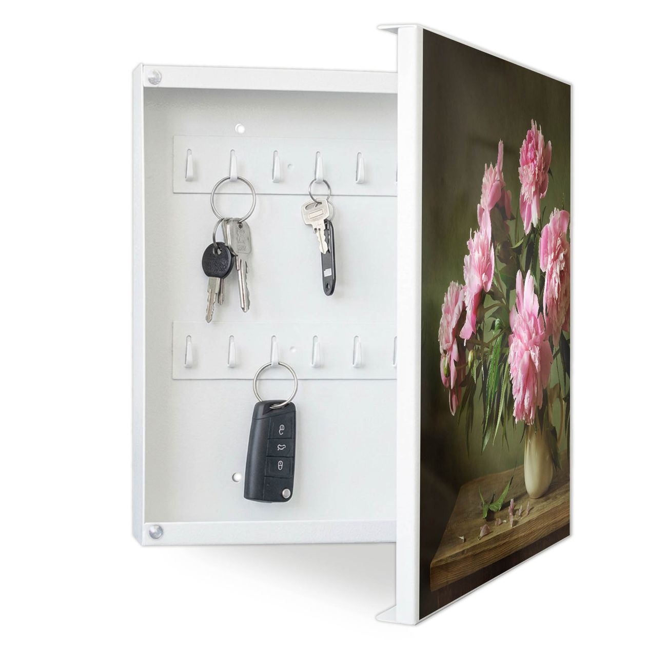 Bringe Ordnung und Eleganz in deinen Eingangsbereich mit dem banjado Schlüsselkasten Motiv Motiv Pinke Pfingstrosen. Die moderne Schlüsselbox kombiniert funktionales Design mit hochwertiger Verarbeitung und wird so zu einem echten Hingucker in Flur, Büro oder Ferienwohnung. ✅ Stilvolle Schlüsselaufbewahrung mit Motiv Motiv Pinke Pfingstrosen Der Design-Schlüsselkasten Motiv Motiv Pinke Pfingstrosen bietet Platz für bis zu 32 Schlüssel, die auf 4 stabilen Reihen mit je 8 Haken übersichtlich verstaut werden. Mit seinen kompakten Maßen von 30 x 30 x 5 cm passt die Schlüsselbox perfekt auch in kleinere Räume. Der weiß lackierte Stahlkorpus mit rechts angeschlagenem Türscharnier harmoniert mit gedruckten Folie auf der Front und fügt sich nahtlos in jedes Wohnambiente ein. Ob als Schlüsselorganizer für Zuhause oder als praktische Lösung für Büros, Praxen und Gewerbe, der banjado Schlüsselkasten sorgt für Ordnung und Übersicht. Dank der magnetischen, mit Kreidestiften beschreibbaren Folie auf der Front kannst du Notizen anheften oder Termine direkt auf der Oberfläche festhalten. Die Schlüsselbox Motiv Motiv Pinke Pfingstrosen zur Wandmontage wird inklusive Befestigungsmaterial geliefert und ist schnell angebracht. So hast du deine Schlüssel jederzeit griffbereit und zugleich stilvoll verstaut. Mit diesem banjado Schlüsselkasten Motiv Motiv Pinke Pfingstrosen kombinierst du praktische Aufbewahrung mit stilvollem Wohndesign. Ob privat oder geschäftlich, die Schlüsselbox sorgt für mehr Ordnung, Übersicht und ein wohnliches Ambiente.Vorteile im Überblick