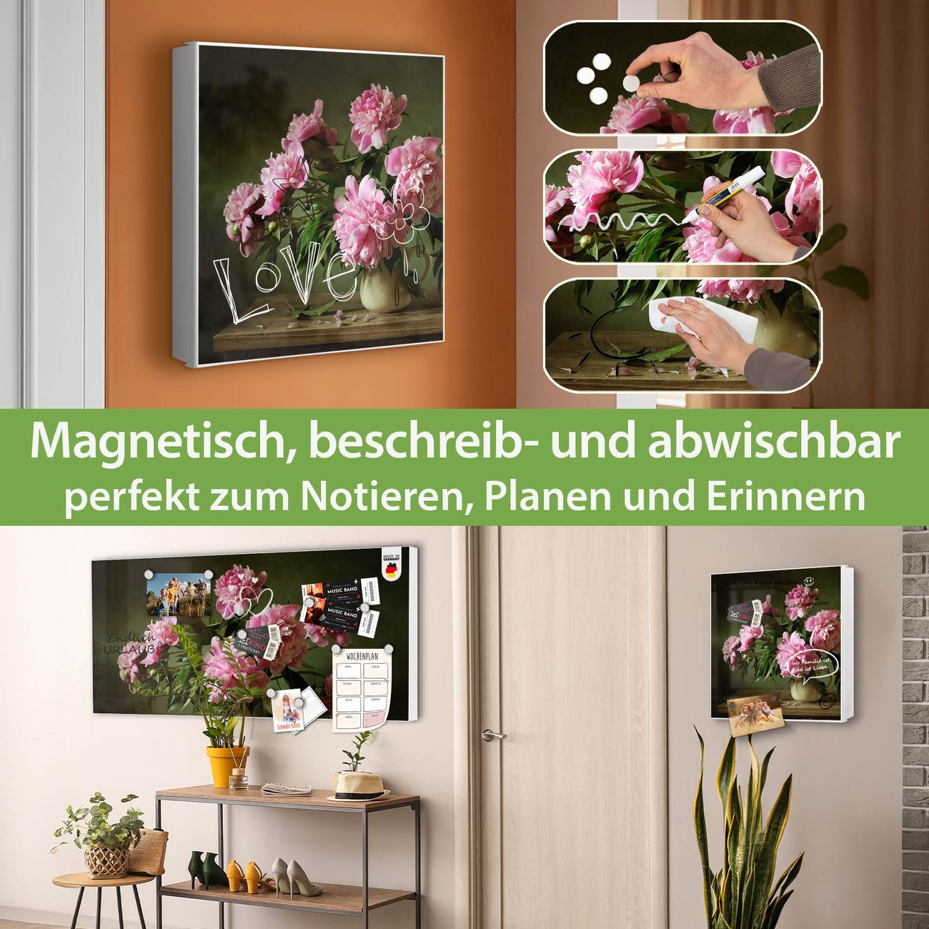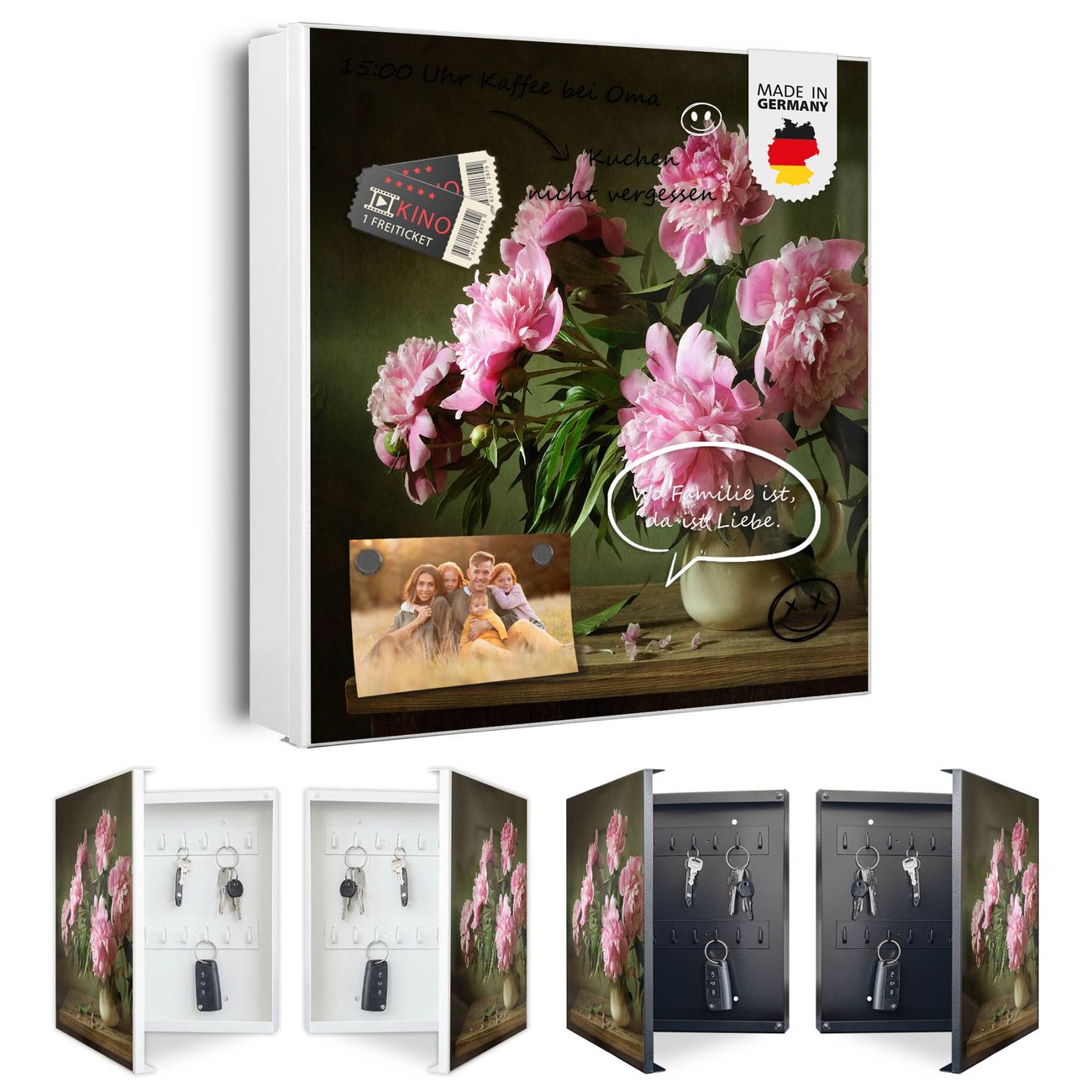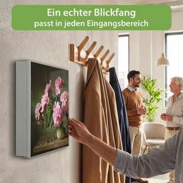 Bringe Ordnung und Eleganz in deinen Eingangsbereich mit dem banjado Schlüsselkasten Motiv Motiv Pinke Pfingstrosen. Die moderne Schlüsselbox kombiniert funktionales Design mit hochwertiger Verarbeitung und wird so zu einem echten Hingucker in Flur, Büro oder Ferienwohnung. ✅ Stilvolle Schlüsselaufbewahrung mit Motiv Motiv Pinke Pfingstrosen Der Design-Schlüsselkasten Motiv Motiv Pinke Pfingstrosen bietet Platz für bis zu 32 Schlüssel, die auf 4 stabilen Reihen mit je 8 Haken übersichtlich verstaut werden. Mit seinen kompakten Maßen von 30 x 30 x 5 cm passt die Schlüsselbox perfekt auch in kleinere Räume. Der weiß lackierte Stahlkorpus mit links angeschlagenem Türscharnier harmoniert mit gedruckten Folie auf der Front und fügt sich nahtlos in jedes Wohnambiente ein. Ob als Schlüsselorganizer für Zuhause oder als praktische Lösung für Büros, Praxen und Gewerbe, der banjado Schlüsselkasten sorgt für Ordnung und Übersicht. Dank der magnetischen, mit Kreidestiften beschreibbaren Folie auf der Front kannst du Notizen anheften oder Termine direkt auf der Oberfläche festhalten. Die Schlüsselbox Motiv Motiv Pinke Pfingstrosen zur Wandmontage wird inklusive Befestigungsmaterial geliefert und ist schnell angebracht. So hast du deine Schlüssel jederzeit griffbereit und zugleich stilvoll verstaut. Mit diesem banjado Schlüsselkasten Motiv Motiv Pinke Pfingstrosen kombinierst du praktische Aufbewahrung mit stilvollem Wohndesign. Ob privat oder geschäftlich, die Schlüsselbox sorgt für mehr Ordnung, Übersicht und ein wohnliches Ambiente.Vorteile im Überblick