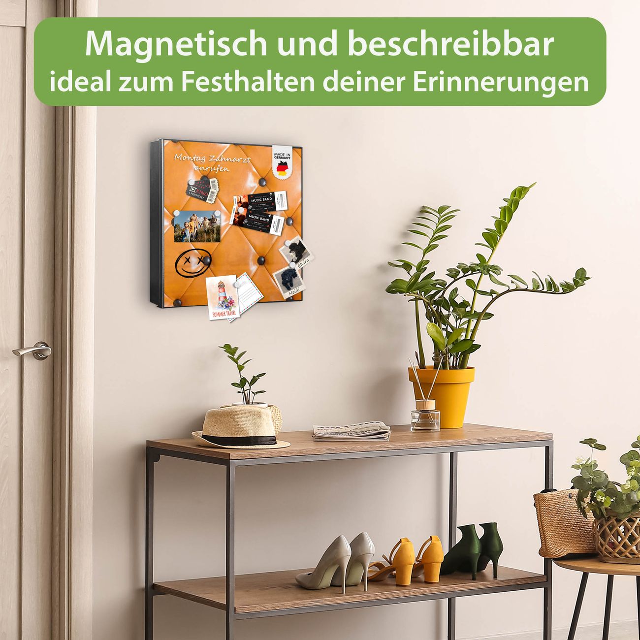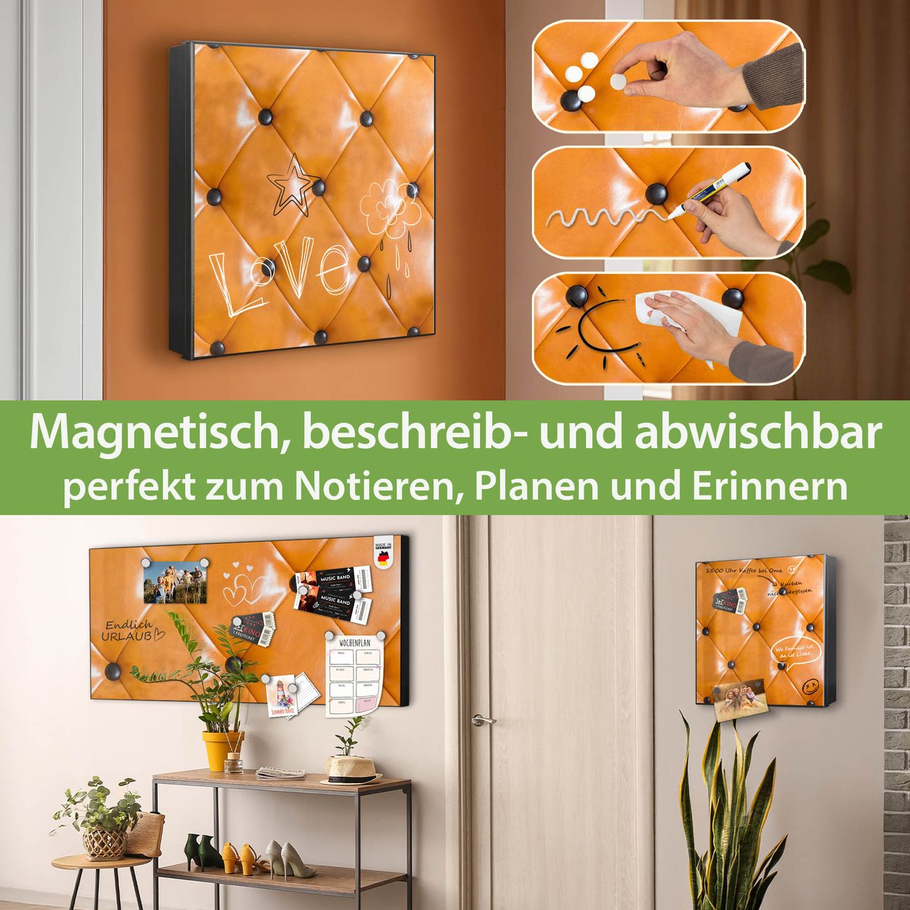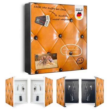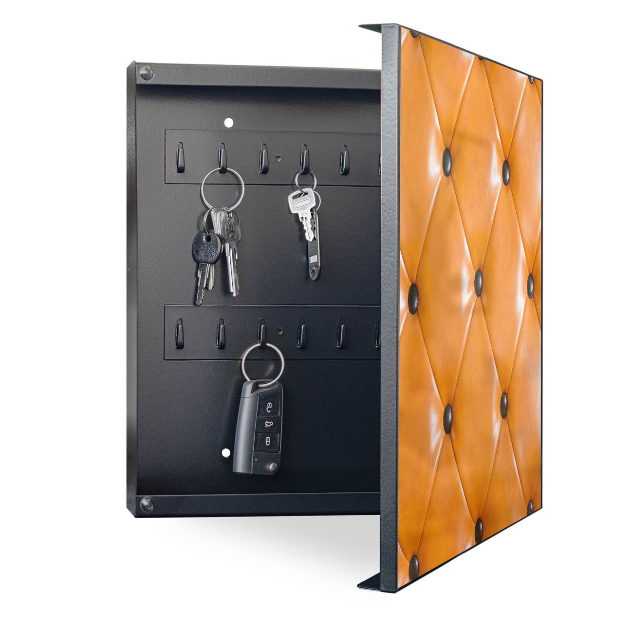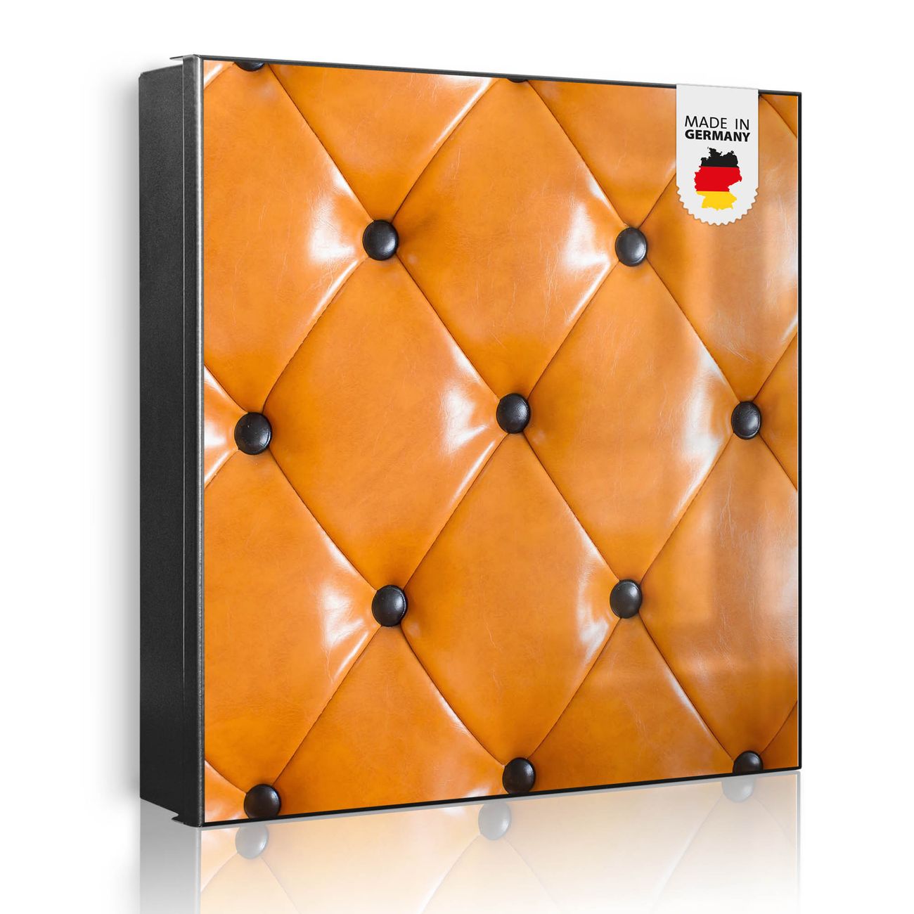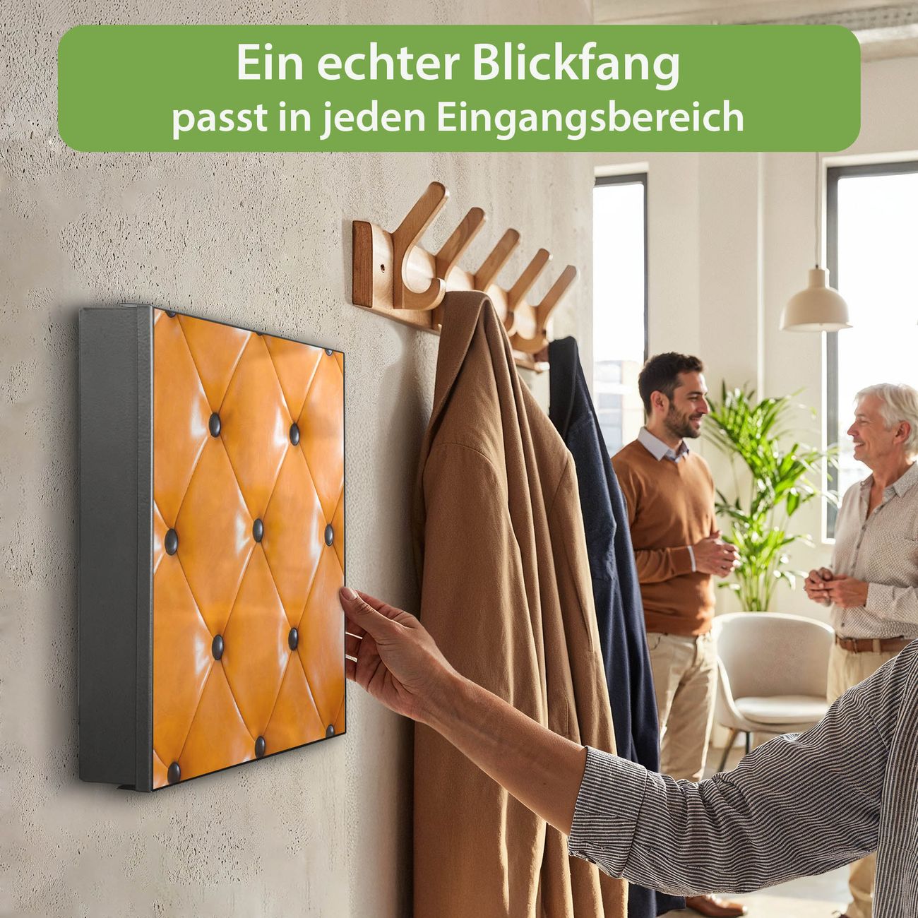 Bringe Ordnung und Eleganz in deinen Eingangsbereich mit dem banjado Schlüsselkasten Motiv Motiv Polster Orange. Die moderne Schlüsselbox kombiniert funktionales Design mit hochwertiger Verarbeitung und wird so zu einem echten Hingucker in Flur, Büro oder Ferienwohnung. ✅ Stilvolle Schlüsselaufbewahrung mit Motiv Motiv Polster Orange Der Design-Schlüsselkasten Motiv Motiv Polster Orange bietet Platz für bis zu 32 Schlüssel, die auf 4 stabilen Reihen mit je 8 Haken übersichtlich verstaut werden. Mit seinen kompakten Maßen von 30 x 30 x 5 cm passt die Schlüsselbox perfekt auch in kleinere Räume. Der schwarz lackierte Stahlkorpus mit rechts angeschlagenem Türscharnier harmoniert mit gedruckten Folie auf der Front und fügt sich nahtlos in jedes Wohnambiente ein. Ob als Schlüsselorganizer für Zuhause oder als praktische Lösung für Büros, Praxen und Gewerbe, der banjado Schlüsselkasten sorgt für Ordnung und Übersicht. Dank der magnetischen, mit Kreidestiften beschreibbaren Folie auf der Front kannst du Notizen anheften oder Termine direkt auf der Oberfläche festhalten. Die Schlüsselbox Motiv Motiv Polster Orange zur Wandmontage wird inklusive Befestigungsmaterial geliefert und ist schnell angebracht. So hast du deine Schlüssel jederzeit griffbereit und zugleich stilvoll verstaut. Mit diesem banjado Schlüsselkasten Motiv Motiv Polster Orange kombinierst du praktische Aufbewahrung mit stilvollem Wohndesign. Ob privat oder geschäftlich, die Schlüsselbox sorgt für mehr Ordnung, Übersicht und ein wohnliches Ambiente.Vorteile im Überblick