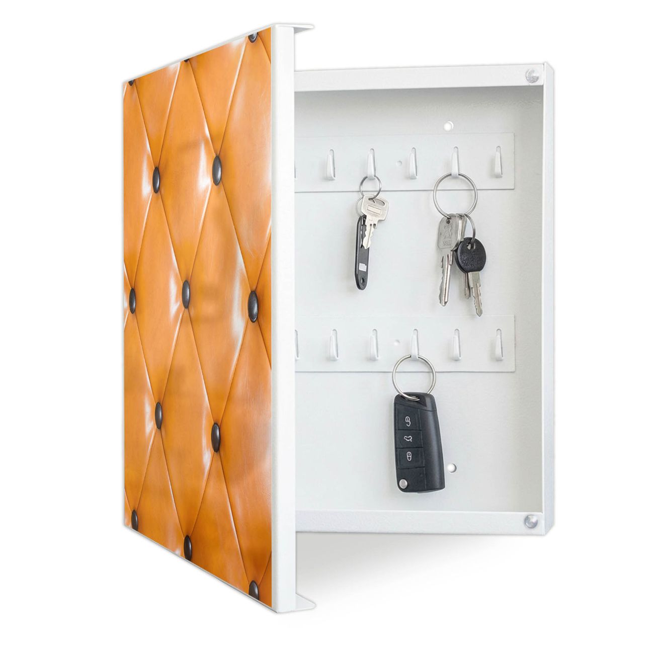 Bringe Ordnung und Eleganz in deinen Eingangsbereich mit dem banjado Schlüsselkasten Motiv Motiv Polster Orange. Die moderne Schlüsselbox kombiniert funktionales Design mit hochwertiger Verarbeitung und wird so zu einem echten Hingucker in Flur, Büro oder Ferienwohnung. ✅ Stilvolle Schlüsselaufbewahrung mit Motiv Motiv Polster Orange Der Design-Schlüsselkasten Motiv Motiv Polster Orange bietet Platz für bis zu 32 Schlüssel, die auf 4 stabilen Reihen mit je 8 Haken übersichtlich verstaut werden. Mit seinen kompakten Maßen von 30 x 30 x 5 cm passt die Schlüsselbox perfekt auch in kleinere Räume. Der weiß lackierte Stahlkorpus mit links angeschlagenem Türscharnier harmoniert mit gedruckten Folie auf der Front und fügt sich nahtlos in jedes Wohnambiente ein. Ob als Schlüsselorganizer für Zuhause oder als praktische Lösung für Büros, Praxen und Gewerbe, der banjado Schlüsselkasten sorgt für Ordnung und Übersicht. Dank der magnetischen, mit Kreidestiften beschreibbaren Folie auf der Front kannst du Notizen anheften oder Termine direkt auf der Oberfläche festhalten. Die Schlüsselbox Motiv Motiv Polster Orange zur Wandmontage wird inklusive Befestigungsmaterial geliefert und ist schnell angebracht. So hast du deine Schlüssel jederzeit griffbereit und zugleich stilvoll verstaut. Mit diesem banjado Schlüsselkasten Motiv Motiv Polster Orange kombinierst du praktische Aufbewahrung mit stilvollem Wohndesign. Ob privat oder geschäftlich, die Schlüsselbox sorgt für mehr Ordnung, Übersicht und ein wohnliches Ambiente.Vorteile im Überblick