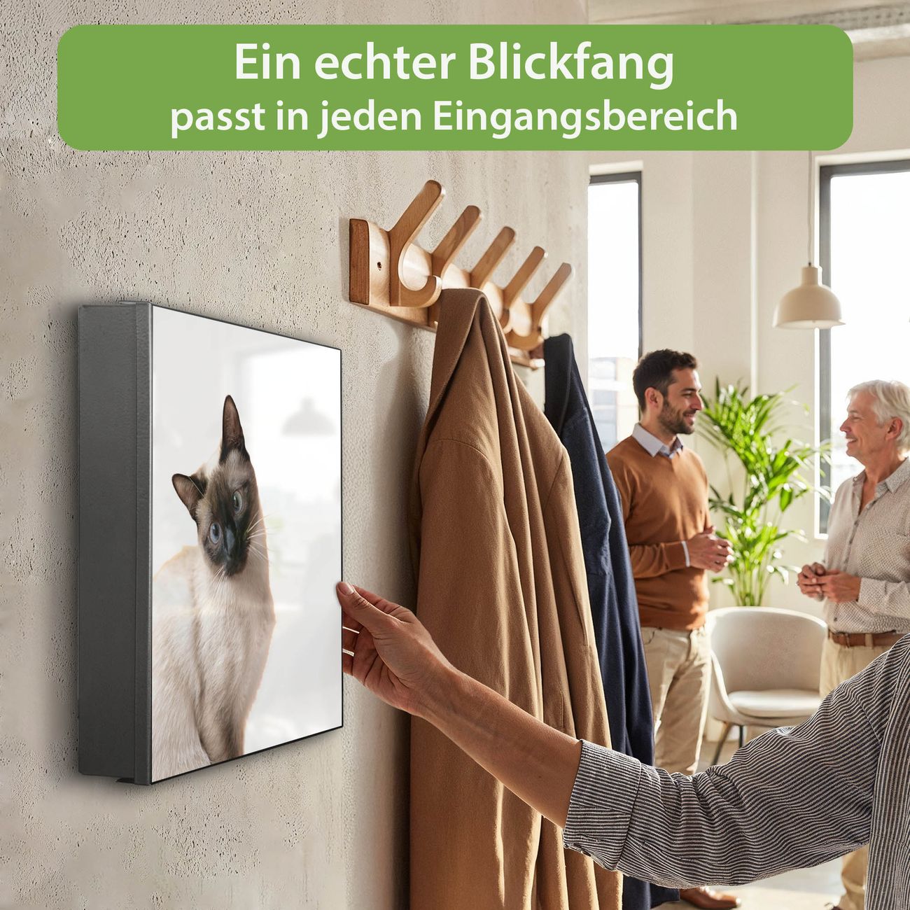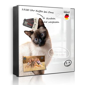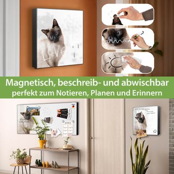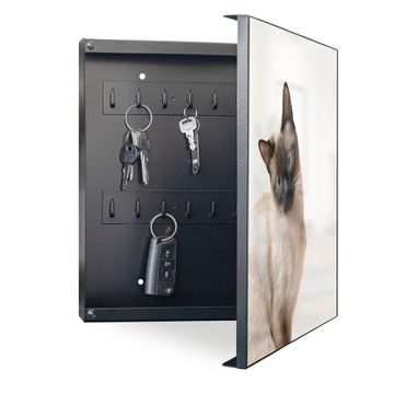 Bringe Ordnung und Eleganz in deinen Eingangsbereich mit dem banjado Schlüsselkasten Motiv Motiv Porträt einer Siamkatze. Die moderne Schlüsselbox kombiniert funktionales Design mit hochwertiger Verarbeitung und wird so zu einem echten Hingucker in Flur, Büro oder Ferienwohnung. ✅ Stilvolle Schlüsselaufbewahrung mit Motiv Motiv Porträt einer Siamkatze Der Design-Schlüsselkasten Motiv Motiv Porträt einer Siamkatze bietet Platz für bis zu 32 Schlüssel, die auf 4 stabilen Reihen mit je 8 Haken übersichtlich verstaut werden. Mit seinen kompakten Maßen von 30 x 30 x 5 cm passt die Schlüsselbox perfekt auch in kleinere Räume. Der schwarz lackierte Stahlkorpus mit rechts angeschlagenem Türscharnier harmoniert mit gedruckten Folie auf der Front und fügt sich nahtlos in jedes Wohnambiente ein. Ob als Schlüsselorganizer für Zuhause oder als praktische Lösung für Büros, Praxen und Gewerbe, der banjado Schlüsselkasten sorgt für Ordnung und Übersicht. Dank der magnetischen, mit Kreidestiften beschreibbaren Folie auf der Front kannst du Notizen anheften oder Termine direkt auf der Oberfläche festhalten. Die Schlüsselbox Motiv Motiv Porträt einer Siamkatze zur Wandmontage wird inklusive Befestigungsmaterial geliefert und ist schnell angebracht. So hast du deine Schlüssel jederzeit griffbereit und zugleich stilvoll verstaut. Mit diesem banjado Schlüsselkasten Motiv Motiv Porträt einer Siamkatze kombinierst du praktische Aufbewahrung mit stilvollem Wohndesign. Ob privat oder geschäftlich, die Schlüsselbox sorgt für mehr Ordnung, Übersicht und ein wohnliches Ambiente.Vorteile im Überblick