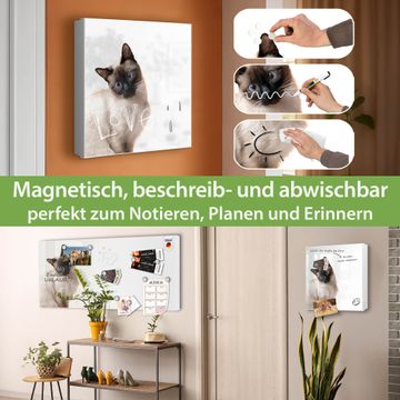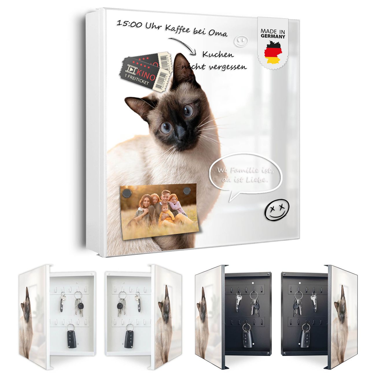 Bringe Ordnung und Eleganz in deinen Eingangsbereich mit dem banjado Schlüsselkasten Motiv Motiv Porträt einer Siamkatze. Die moderne Schlüsselbox kombiniert funktionales Design mit hochwertiger Verarbeitung und wird so zu einem echten Hingucker in Flur, Büro oder Ferienwohnung. ✅ Stilvolle Schlüsselaufbewahrung mit Motiv Motiv Porträt einer Siamkatze Der Design-Schlüsselkasten Motiv Motiv Porträt einer Siamkatze bietet Platz für bis zu 32 Schlüssel, die auf 4 stabilen Reihen mit je 8 Haken übersichtlich verstaut werden. Mit seinen kompakten Maßen von 30 x 30 x 5 cm passt die Schlüsselbox perfekt auch in kleinere Räume. Der weiß lackierte Stahlkorpus mit rechts angeschlagenem Türscharnier harmoniert mit gedruckten Folie auf der Front und fügt sich nahtlos in jedes Wohnambiente ein. Ob als Schlüsselorganizer für Zuhause oder als praktische Lösung für Büros, Praxen und Gewerbe, der banjado Schlüsselkasten sorgt für Ordnung und Übersicht. Dank der magnetischen, mit Kreidestiften beschreibbaren Folie auf der Front kannst du Notizen anheften oder Termine direkt auf der Oberfläche festhalten. Die Schlüsselbox Motiv Motiv Porträt einer Siamkatze zur Wandmontage wird inklusive Befestigungsmaterial geliefert und ist schnell angebracht. So hast du deine Schlüssel jederzeit griffbereit und zugleich stilvoll verstaut. Mit diesem banjado Schlüsselkasten Motiv Motiv Porträt einer Siamkatze kombinierst du praktische Aufbewahrung mit stilvollem Wohndesign. Ob privat oder geschäftlich, die Schlüsselbox sorgt für mehr Ordnung, Übersicht und ein wohnliches Ambiente.Vorteile im Überblick