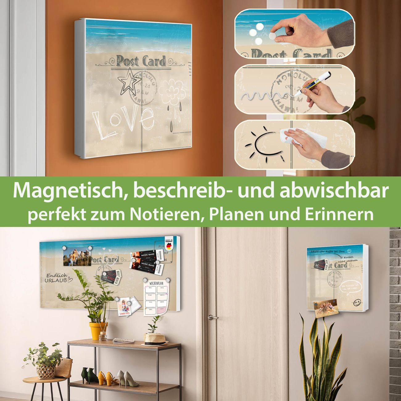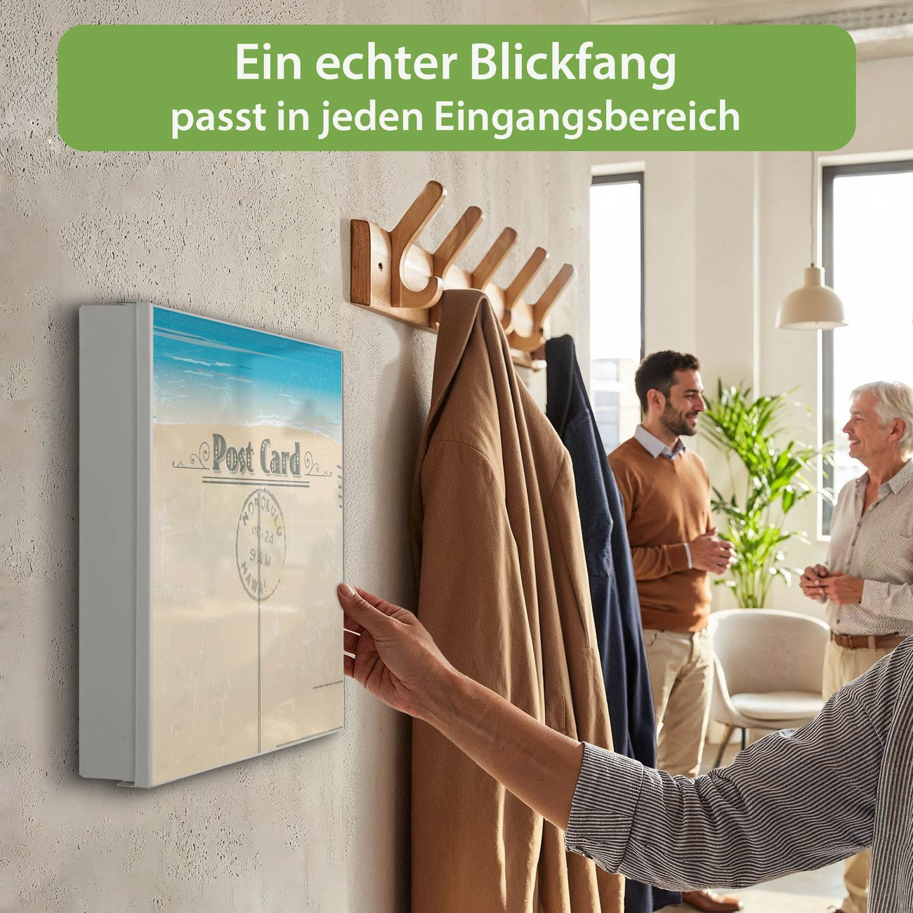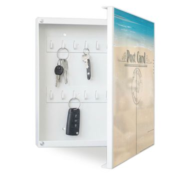 Bringe Ordnung und Eleganz in deinen Eingangsbereich mit dem banjado Schlüsselkasten Motiv Motiv Postkarte. Die moderne Schlüsselbox kombiniert funktionales Design mit hochwertiger Verarbeitung und wird so zu einem echten Hingucker in Flur, Büro oder Ferienwohnung. ✅ Stilvolle Schlüsselaufbewahrung mit Motiv Motiv Postkarte Der Design-Schlüsselkasten Motiv Motiv Postkarte bietet Platz für bis zu 32 Schlüssel, die auf 4 stabilen Reihen mit je 8 Haken übersichtlich verstaut werden. Mit seinen kompakten Maßen von 30 x 30 x 5 cm passt die Schlüsselbox perfekt auch in kleinere Räume. Der weiß lackierte Stahlkorpus mit rechts angeschlagenem Türscharnier harmoniert mit gedruckten Folie auf der Front und fügt sich nahtlos in jedes Wohnambiente ein. Ob als Schlüsselorganizer für Zuhause oder als praktische Lösung für Büros, Praxen und Gewerbe, der banjado Schlüsselkasten sorgt für Ordnung und Übersicht. Dank der magnetischen, mit Kreidestiften beschreibbaren Folie auf der Front kannst du Notizen anheften oder Termine direkt auf der Oberfläche festhalten. Die Schlüsselbox Motiv Motiv Postkarte zur Wandmontage wird inklusive Befestigungsmaterial geliefert und ist schnell angebracht. So hast du deine Schlüssel jederzeit griffbereit und zugleich stilvoll verstaut. Mit diesem banjado Schlüsselkasten Motiv Motiv Postkarte kombinierst du praktische Aufbewahrung mit stilvollem Wohndesign. Ob privat oder geschäftlich, die Schlüsselbox sorgt für mehr Ordnung, Übersicht und ein wohnliches Ambiente.Vorteile im Überblick