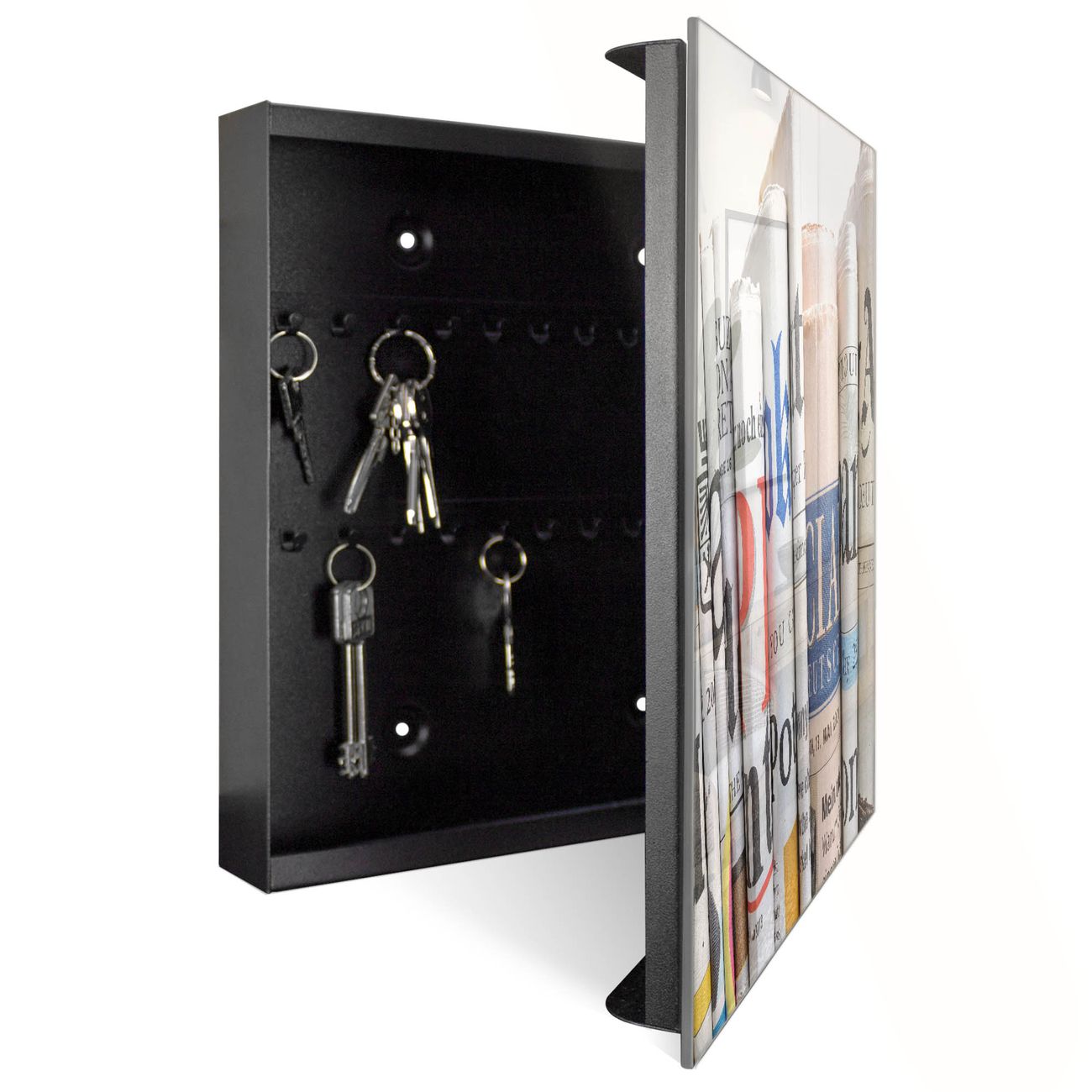 Bringe Ordnung und Eleganz in deinen Eingangsbereich mit dem banjado Schlüsselkasten Motiv Motiv Presse. Die moderne Schlüsselbox kombiniert funktionales Design mit hochwertiger Verarbeitung und wird so zu einem echten Hingucker in Flur, Büro oder Ferienwohnung. ✅ Stilvolle Schlüsselaufbewahrung mit Glasfront im Motiv Motiv Presse Der Design-Schlüsselkasten Motiv Motiv Presse bietet Platz für bis zu 50 Schlüssel, die auf 5 stabilen Reihen mit je 10 Haken übersichtlich verstaut werden. Mit seinen kompakten Maßen von 30 x 30 x 5 cm passt die Schlüsselbox perfekt auch in kleinere Räume. Der schwarz lackierte Stahlkorpus mit rechts angeschlagenem Türscharnier harmoniert mit der Glasfront und fügt sich nahtlos in jedes Wohnambiente ein. Ob als Schlüsselorganizer für Zuhause oder als praktische Lösung für Büros, Praxen und Gewerbe, der banjado Schlüsselkasten sorgt für Ordnung und Übersicht. Dank der magnetischen, mit Kreidestiften beschreibbaren Glasfront kannst du Notizen anheften oder Termine direkt auf der Oberfläche festhalten. Die Schlüsselbox Motiv Motiv Presse zur Wandmontage wird inklusive Befestigungsmaterial geliefert und ist schnell angebracht. So hast du deine Schlüssel jederzeit griffbereit und zugleich stilvoll verstaut. Mit diesem banjado Schlüsselkasten Motiv Motiv Presse kombinierst du praktische Aufbewahrung mit stilvollem Wohndesign. Ob privat oder geschäftlich, die Schlüsselbox sorgt für mehr Ordnung, Übersicht und ein wohnliches Ambiente.Vorteile im Überblick
