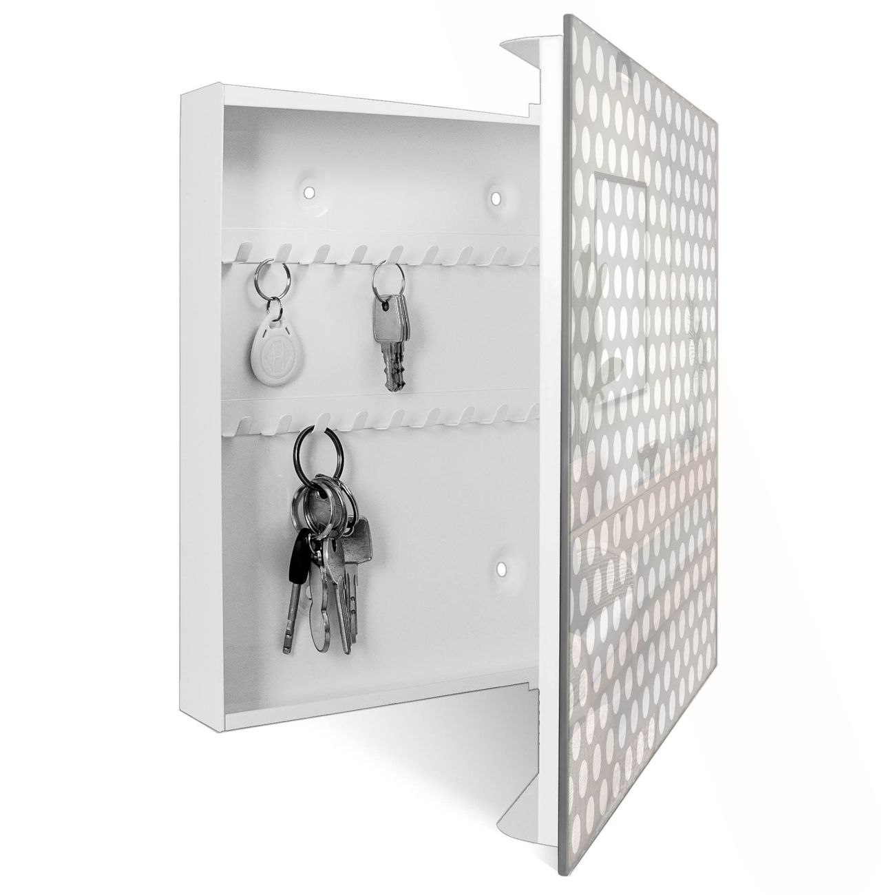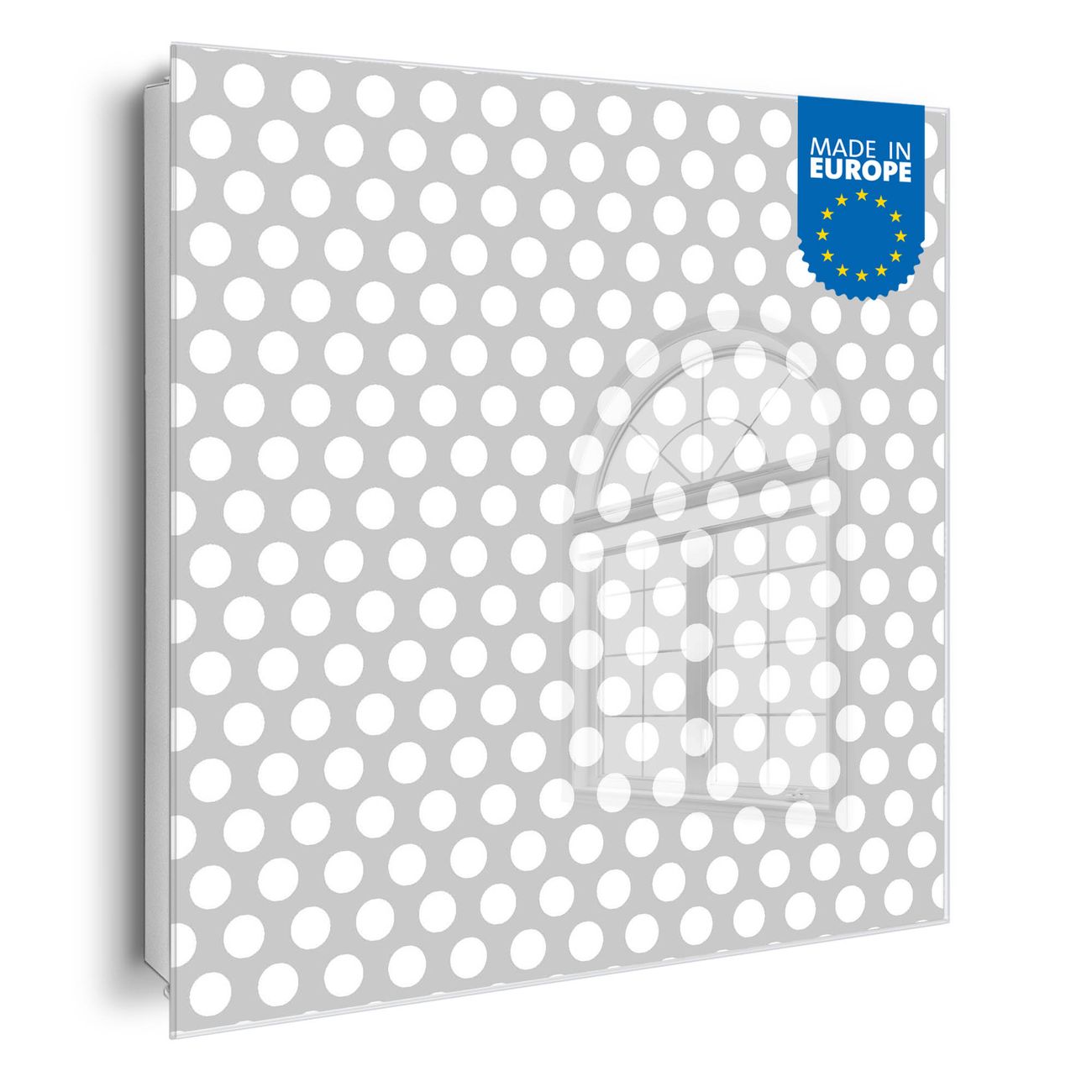 Bringe Ordnung und Eleganz in deinen Eingangsbereich mit dem banjado Schlüsselkasten Motiv Motiv Punkte Grau. Die moderne Schlüsselbox kombiniert funktionales Design mit hochwertiger Verarbeitung und wird so zu einem echten Hingucker in Flur, Büro oder Ferienwohnung. ✅ Stilvolle Schlüsselaufbewahrung mit Glasfront im Motiv Motiv Punkte Grau Der Design-Schlüsselkasten Motiv Motiv Punkte Grau bietet Platz für bis zu 50 Schlüssel, die auf 5 stabilen Reihen mit je 10 Haken übersichtlich verstaut werden. Mit seinen kompakten Maßen von 30 x 30 x 5 cm passt die Schlüsselbox perfekt auch in kleinere Räume. Der weiß lackierte Stahlkorpus mit rechts angeschlagenem Türscharnier harmoniert mit der Glasfront und fügt sich nahtlos in jedes Wohnambiente ein. Ob als Schlüsselorganizer für Zuhause oder als praktische Lösung für Büros, Praxen und Gewerbe, der banjado Schlüsselkasten sorgt für Ordnung und Übersicht. Dank der magnetischen, mit Kreidestiften beschreibbaren Glasfront kannst du Notizen anheften oder Termine direkt auf der Oberfläche festhalten. Die Schlüsselbox Motiv Motiv Punkte Grau zur Wandmontage wird inklusive Befestigungsmaterial geliefert und ist schnell angebracht. So hast du deine Schlüssel jederzeit griffbereit und zugleich stilvoll verstaut. Mit diesem banjado Schlüsselkasten Motiv Motiv Punkte Grau kombinierst du praktische Aufbewahrung mit stilvollem Wohndesign. Ob privat oder geschäftlich, die Schlüsselbox sorgt für mehr Ordnung, Übersicht und ein wohnliches Ambiente.Vorteile im Überblick