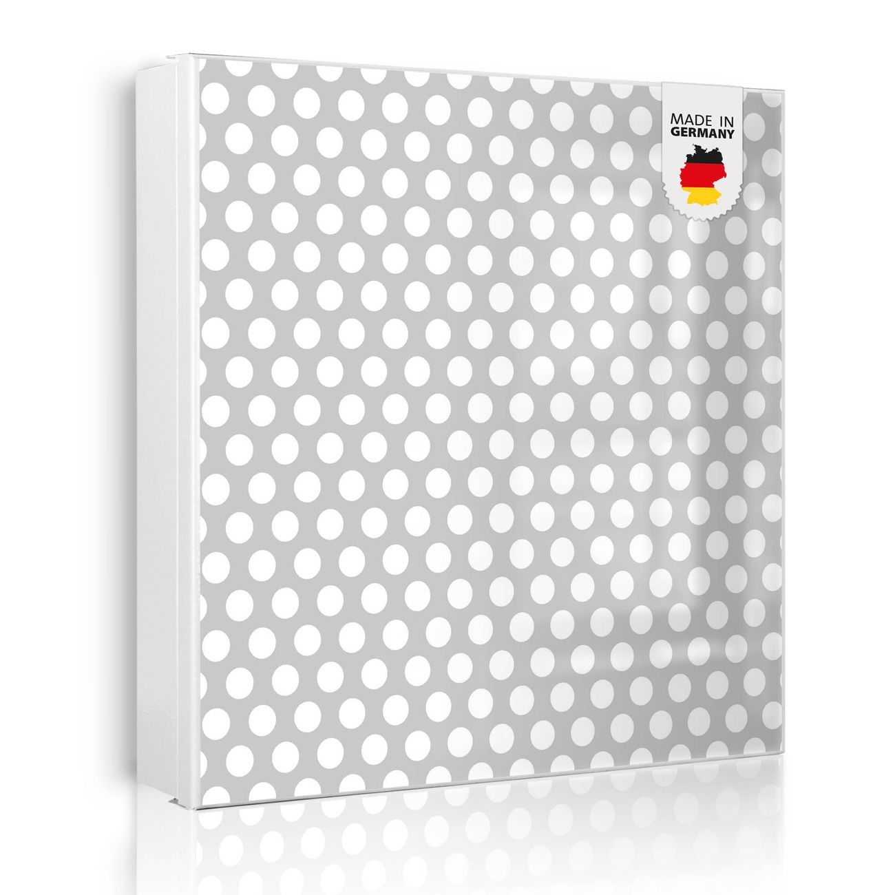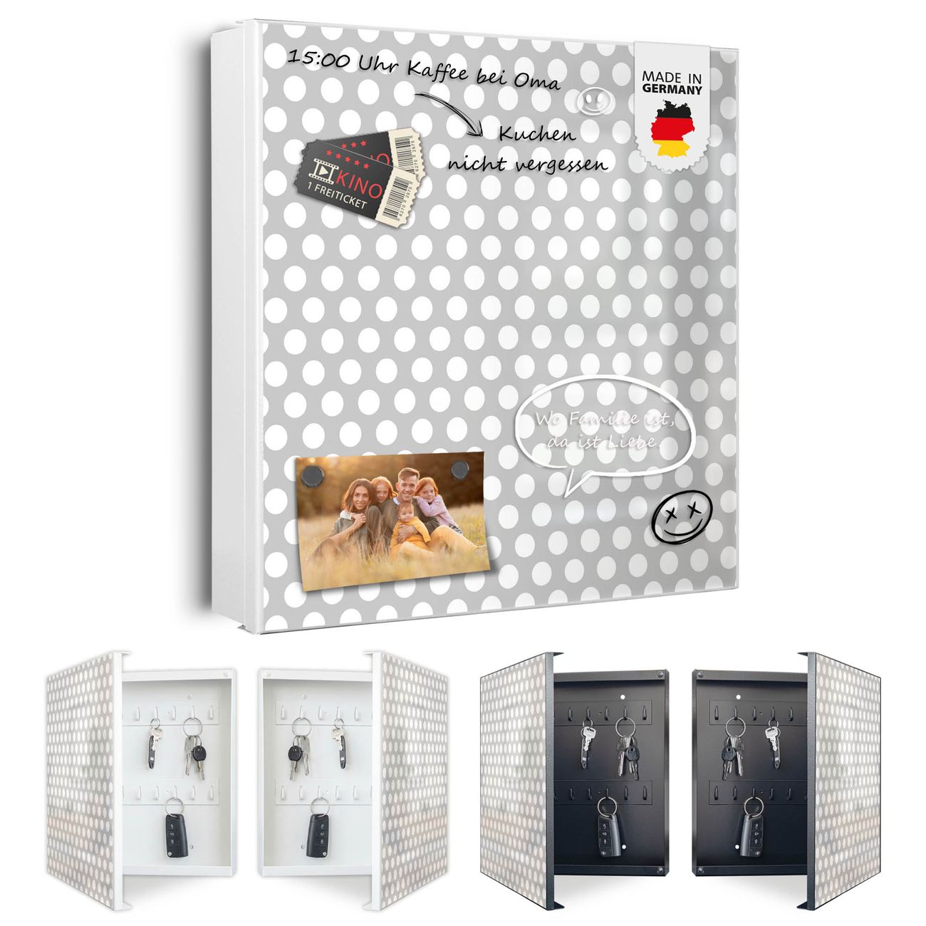 Bringe Ordnung und Eleganz in deinen Eingangsbereich mit dem banjado Schlüsselkasten Motiv Motiv Punkte Grau. Die moderne Schlüsselbox kombiniert funktionales Design mit hochwertiger Verarbeitung und wird so zu einem echten Hingucker in Flur, Büro oder Ferienwohnung. ✅ Stilvolle Schlüsselaufbewahrung mit Motiv Motiv Punkte Grau Der Design-Schlüsselkasten Motiv Motiv Punkte Grau bietet Platz für bis zu 32 Schlüssel, die auf 4 stabilen Reihen mit je 8 Haken übersichtlich verstaut werden. Mit seinen kompakten Maßen von 30 x 30 x 5 cm passt die Schlüsselbox perfekt auch in kleinere Räume. Der weiß lackierte Stahlkorpus mit rechts angeschlagenem Türscharnier harmoniert mit gedruckten Folie auf der Front und fügt sich nahtlos in jedes Wohnambiente ein. Ob als Schlüsselorganizer für Zuhause oder als praktische Lösung für Büros, Praxen und Gewerbe, der banjado Schlüsselkasten sorgt für Ordnung und Übersicht. Dank der magnetischen, mit Kreidestiften beschreibbaren Folie auf der Front kannst du Notizen anheften oder Termine direkt auf der Oberfläche festhalten. Die Schlüsselbox Motiv Motiv Punkte Grau zur Wandmontage wird inklusive Befestigungsmaterial geliefert und ist schnell angebracht. So hast du deine Schlüssel jederzeit griffbereit und zugleich stilvoll verstaut. Mit diesem banjado Schlüsselkasten Motiv Motiv Punkte Grau kombinierst du praktische Aufbewahrung mit stilvollem Wohndesign. Ob privat oder geschäftlich, die Schlüsselbox sorgt für mehr Ordnung, Übersicht und ein wohnliches Ambiente.Vorteile im Überblick