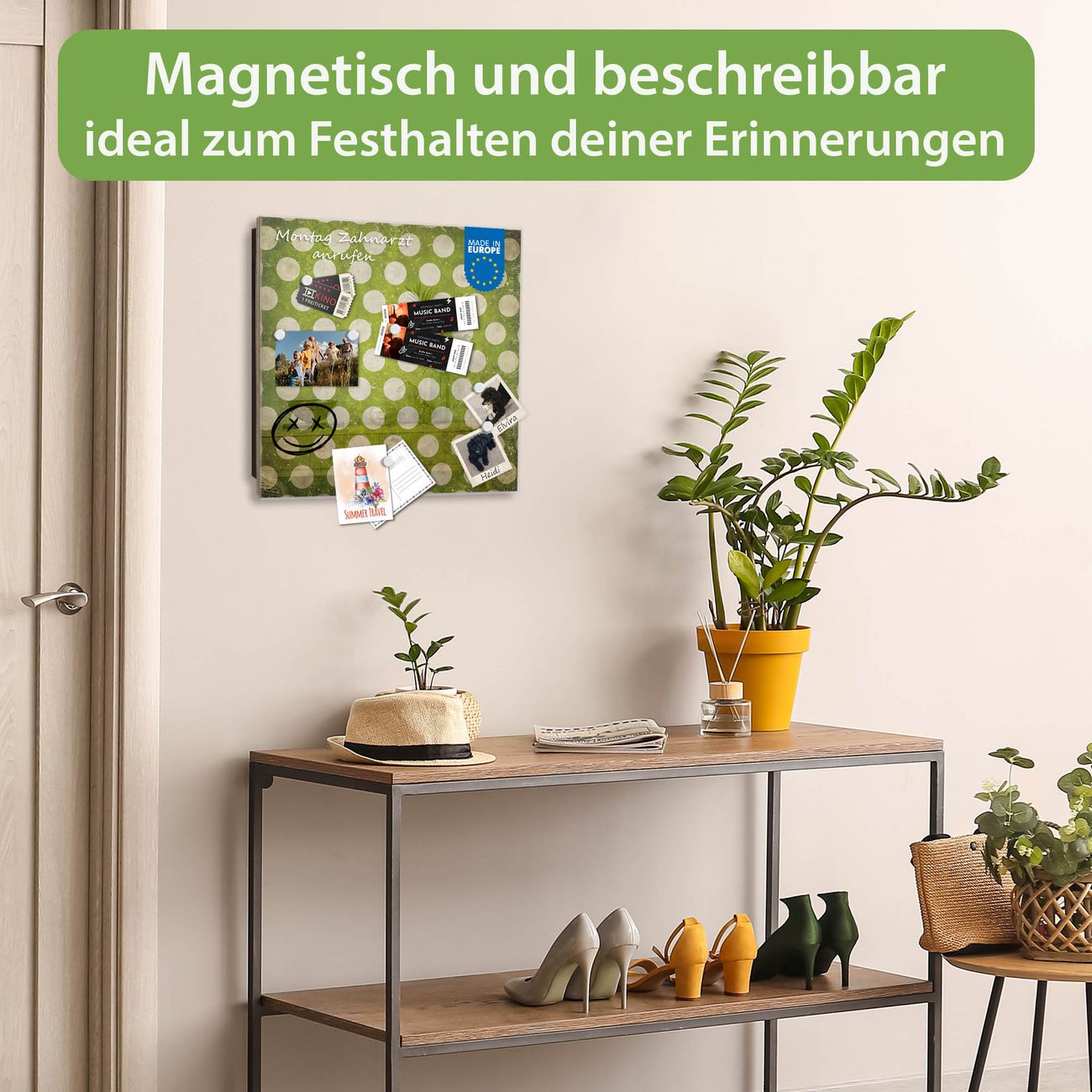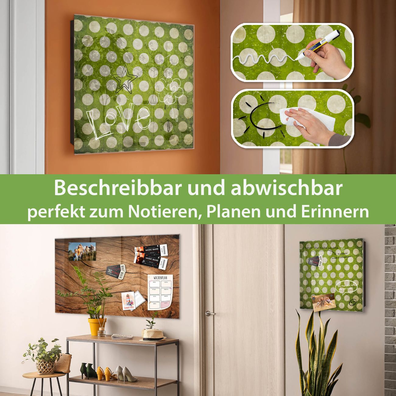 Bringe Ordnung und Eleganz in deinen Eingangsbereich mit dem banjado Schlüsselkasten Motiv Motiv Punkte Grün Vintage. Die moderne Schlüsselbox kombiniert funktionales Design mit hochwertiger Verarbeitung und wird so zu einem echten Hingucker in Flur, Büro oder Ferienwohnung. ✅ Stilvolle Schlüsselaufbewahrung mit Glasfront im Motiv Motiv Punkte Grün Vintage Der Design-Schlüsselkasten Motiv Motiv Punkte Grün Vintage bietet Platz für bis zu 50 Schlüssel, die auf 5 stabilen Reihen mit je 10 Haken übersichtlich verstaut werden. Mit seinen kompakten Maßen von 30 x 30 x 5 cm passt die Schlüsselbox perfekt auch in kleinere Räume. Der schwarz lackierte Stahlkorpus mit rechts angeschlagenem Türscharnier harmoniert mit der Glasfront und fügt sich nahtlos in jedes Wohnambiente ein. Ob als Schlüsselorganizer für Zuhause oder als praktische Lösung für Büros, Praxen und Gewerbe, der banjado Schlüsselkasten sorgt für Ordnung und Übersicht. Dank der magnetischen, mit Kreidestiften beschreibbaren Glasfront kannst du Notizen anheften oder Termine direkt auf der Oberfläche festhalten. Die Schlüsselbox Motiv Motiv Punkte Grün Vintage zur Wandmontage wird inklusive Befestigungsmaterial geliefert und ist schnell angebracht. So hast du deine Schlüssel jederzeit griffbereit und zugleich stilvoll verstaut. Mit diesem banjado Schlüsselkasten Motiv Motiv Punkte Grün Vintage kombinierst du praktische Aufbewahrung mit stilvollem Wohndesign. Ob privat oder geschäftlich, die Schlüsselbox sorgt für mehr Ordnung, Übersicht und ein wohnliches Ambiente.Vorteile im Überblick