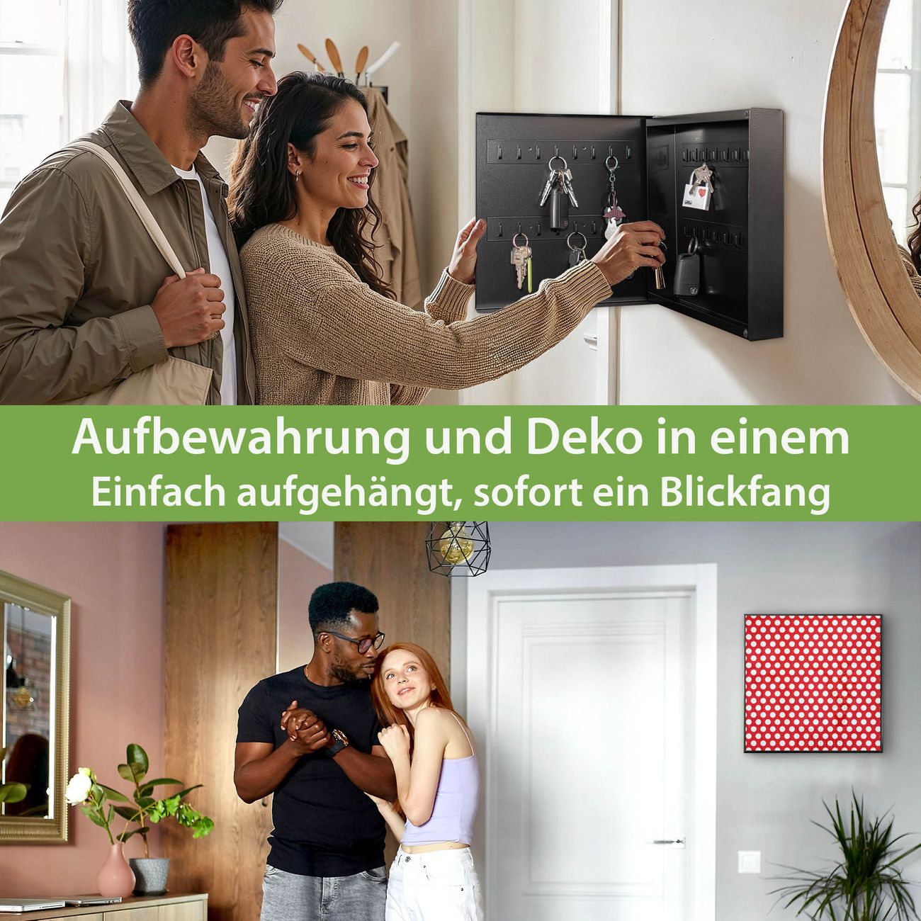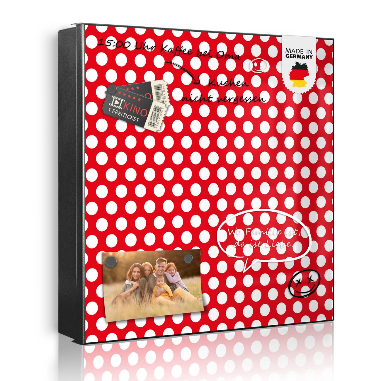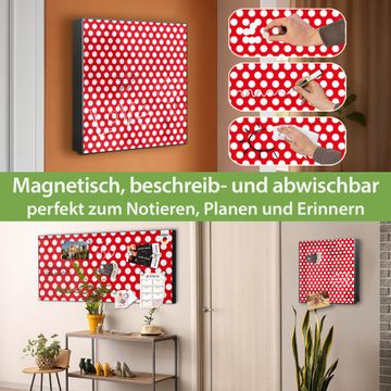 Bringe Ordnung und Eleganz in deinen Eingangsbereich mit dem banjado Schlüsselkasten Motiv Motiv Punkte Rot. Die moderne Schlüsselbox kombiniert funktionales Design mit hochwertiger Verarbeitung und wird so zu einem echten Hingucker in Flur, Büro oder Ferienwohnung. ✅ Stilvolle Schlüsselaufbewahrung mit Motiv Motiv Punkte Rot Der Design-Schlüsselkasten Motiv Motiv Punkte Rot bietet Platz für bis zu 32 Schlüssel, die auf 4 stabilen Reihen mit je 8 Haken übersichtlich verstaut werden. Mit seinen kompakten Maßen von 30 x 30 x 5 cm passt die Schlüsselbox perfekt auch in kleinere Räume. Der schwarz lackierte Stahlkorpus mit rechts angeschlagenem Türscharnier harmoniert mit gedruckten Folie auf der Front und fügt sich nahtlos in jedes Wohnambiente ein. Ob als Schlüsselorganizer für Zuhause oder als praktische Lösung für Büros, Praxen und Gewerbe, der banjado Schlüsselkasten sorgt für Ordnung und Übersicht. Dank der magnetischen, mit Kreidestiften beschreibbaren Folie auf der Front kannst du Notizen anheften oder Termine direkt auf der Oberfläche festhalten. Die Schlüsselbox Motiv Motiv Punkte Rot zur Wandmontage wird inklusive Befestigungsmaterial geliefert und ist schnell angebracht. So hast du deine Schlüssel jederzeit griffbereit und zugleich stilvoll verstaut. Mit diesem banjado Schlüsselkasten Motiv Motiv Punkte Rot kombinierst du praktische Aufbewahrung mit stilvollem Wohndesign. Ob privat oder geschäftlich, die Schlüsselbox sorgt für mehr Ordnung, Übersicht und ein wohnliches Ambiente.Vorteile im Überblick