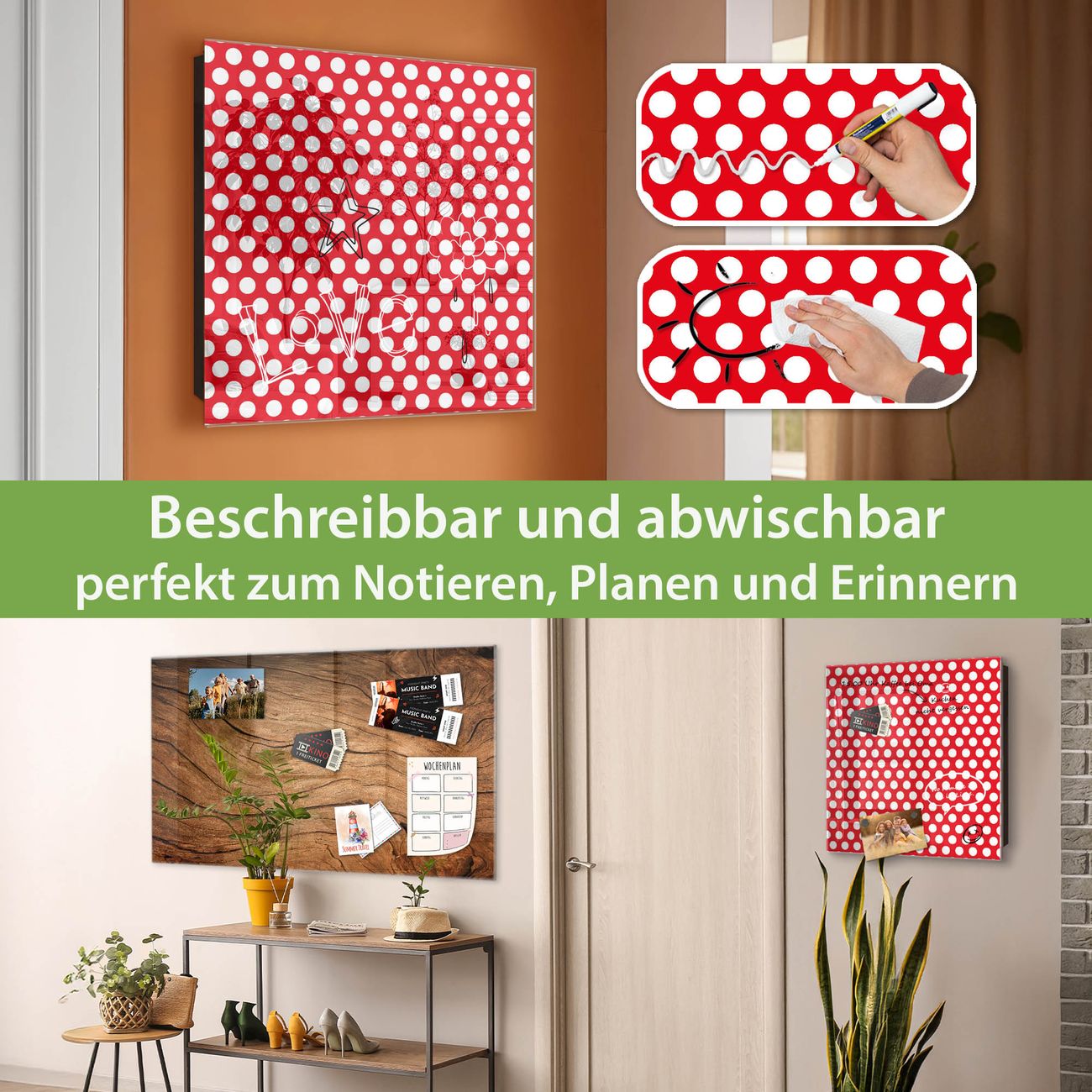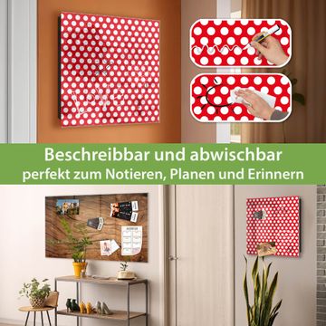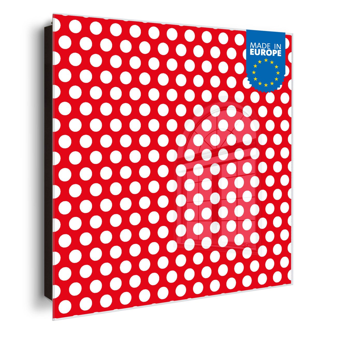 Bringe Ordnung und Eleganz in deinen Eingangsbereich mit dem banjado Schlüsselkasten Motiv Motiv Punkte Rot. Die moderne Schlüsselbox kombiniert funktionales Design mit hochwertiger Verarbeitung und wird so zu einem echten Hingucker in Flur, Büro oder Ferienwohnung. ✅ Stilvolle Schlüsselaufbewahrung mit Glasfront im Motiv Motiv Punkte Rot Der Design-Schlüsselkasten Motiv Motiv Punkte Rot bietet Platz für bis zu 50 Schlüssel, die auf 5 stabilen Reihen mit je 10 Haken übersichtlich verstaut werden. Mit seinen kompakten Maßen von 30 x 30 x 5 cm passt die Schlüsselbox perfekt auch in kleinere Räume. Der schwarz lackierte Stahlkorpus mit rechts angeschlagenem Türscharnier harmoniert mit der Glasfront und fügt sich nahtlos in jedes Wohnambiente ein. Ob als Schlüsselorganizer für Zuhause oder als praktische Lösung für Büros, Praxen und Gewerbe, der banjado Schlüsselkasten sorgt für Ordnung und Übersicht. Dank der magnetischen, mit Kreidestiften beschreibbaren Glasfront kannst du Notizen anheften oder Termine direkt auf der Oberfläche festhalten. Die Schlüsselbox Motiv Motiv Punkte Rot zur Wandmontage wird inklusive Befestigungsmaterial geliefert und ist schnell angebracht. So hast du deine Schlüssel jederzeit griffbereit und zugleich stilvoll verstaut. Mit diesem banjado Schlüsselkasten Motiv Motiv Punkte Rot kombinierst du praktische Aufbewahrung mit stilvollem Wohndesign. Ob privat oder geschäftlich, die Schlüsselbox sorgt für mehr Ordnung, Übersicht und ein wohnliches Ambiente.Vorteile im Überblick