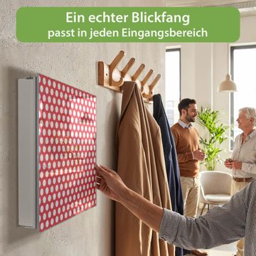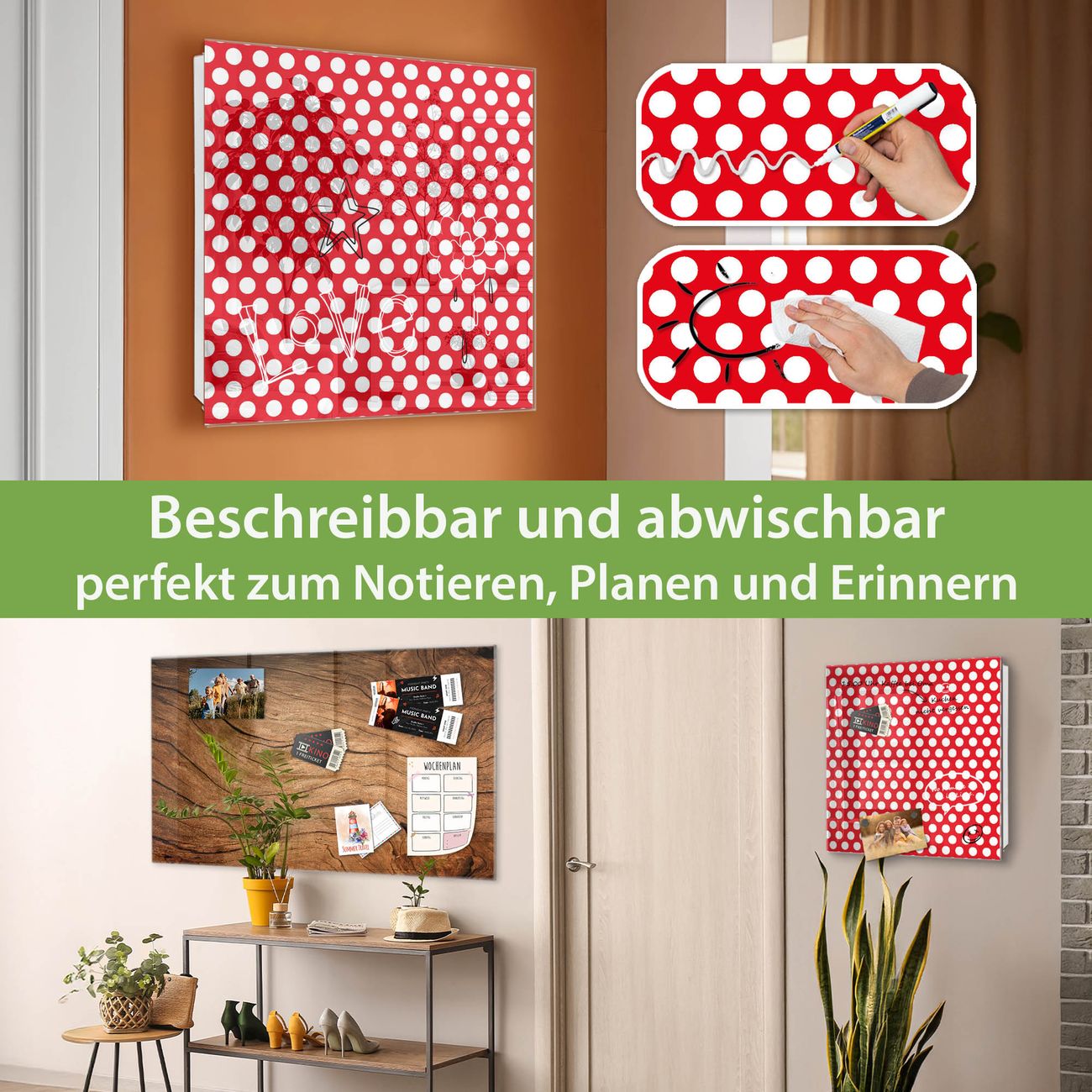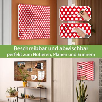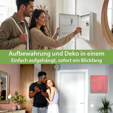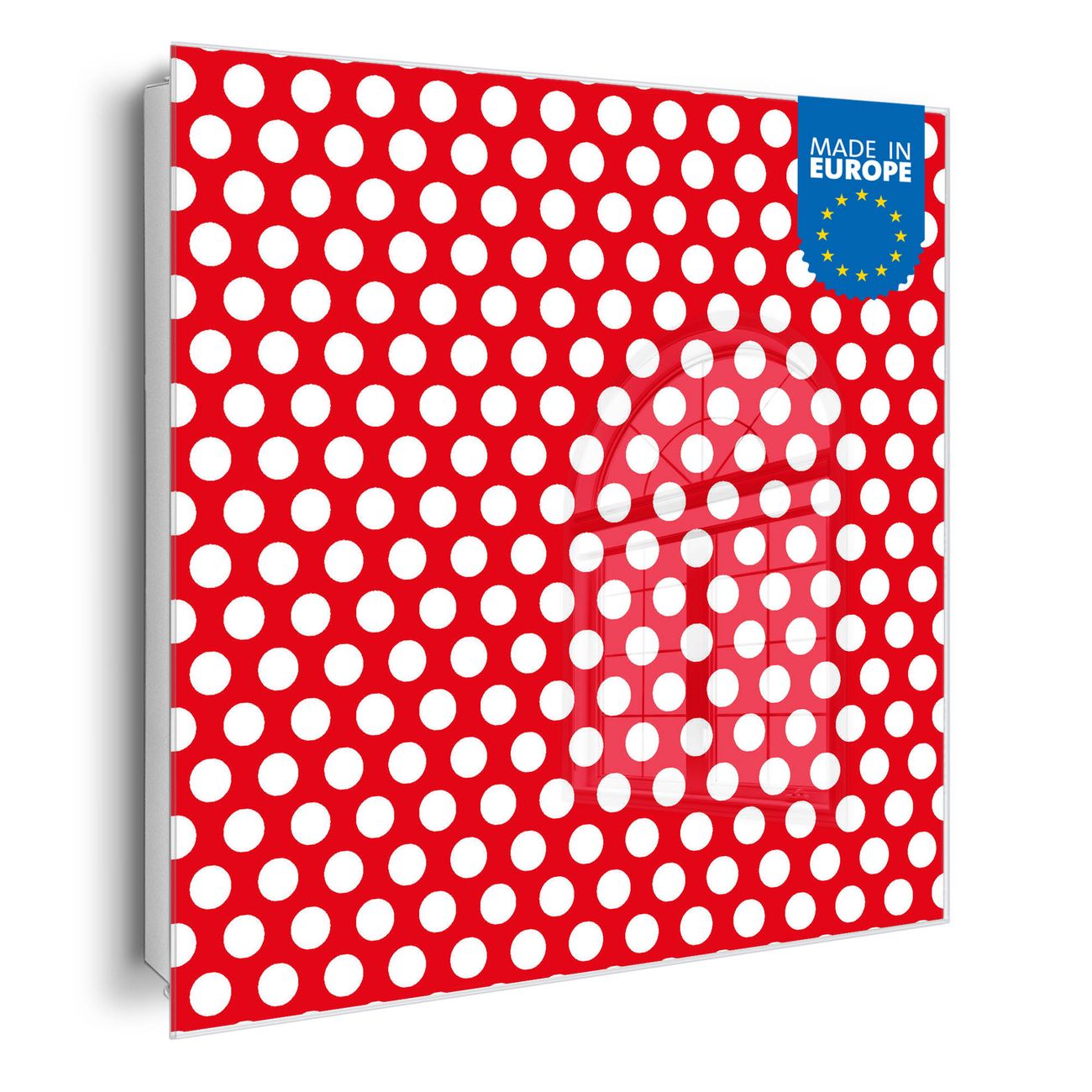 Bringe Ordnung und Eleganz in deinen Eingangsbereich mit dem banjado Schlüsselkasten Motiv Motiv Punkte Rot. Die moderne Schlüsselbox kombiniert funktionales Design mit hochwertiger Verarbeitung und wird so zu einem echten Hingucker in Flur, Büro oder Ferienwohnung. ✅ Stilvolle Schlüsselaufbewahrung mit Glasfront im Motiv Motiv Punkte Rot Der Design-Schlüsselkasten Motiv Motiv Punkte Rot bietet Platz für bis zu 50 Schlüssel, die auf 5 stabilen Reihen mit je 10 Haken übersichtlich verstaut werden. Mit seinen kompakten Maßen von 30 x 30 x 5 cm passt die Schlüsselbox perfekt auch in kleinere Räume. Der weiß lackierte Stahlkorpus mit rechts angeschlagenem Türscharnier harmoniert mit der Glasfront und fügt sich nahtlos in jedes Wohnambiente ein. Ob als Schlüsselorganizer für Zuhause oder als praktische Lösung für Büros, Praxen und Gewerbe, der banjado Schlüsselkasten sorgt für Ordnung und Übersicht. Dank der magnetischen, mit Kreidestiften beschreibbaren Glasfront kannst du Notizen anheften oder Termine direkt auf der Oberfläche festhalten. Die Schlüsselbox Motiv Motiv Punkte Rot zur Wandmontage wird inklusive Befestigungsmaterial geliefert und ist schnell angebracht. So hast du deine Schlüssel jederzeit griffbereit und zugleich stilvoll verstaut. Mit diesem banjado Schlüsselkasten Motiv Motiv Punkte Rot kombinierst du praktische Aufbewahrung mit stilvollem Wohndesign. Ob privat oder geschäftlich, die Schlüsselbox sorgt für mehr Ordnung, Übersicht und ein wohnliches Ambiente.Vorteile im Überblick