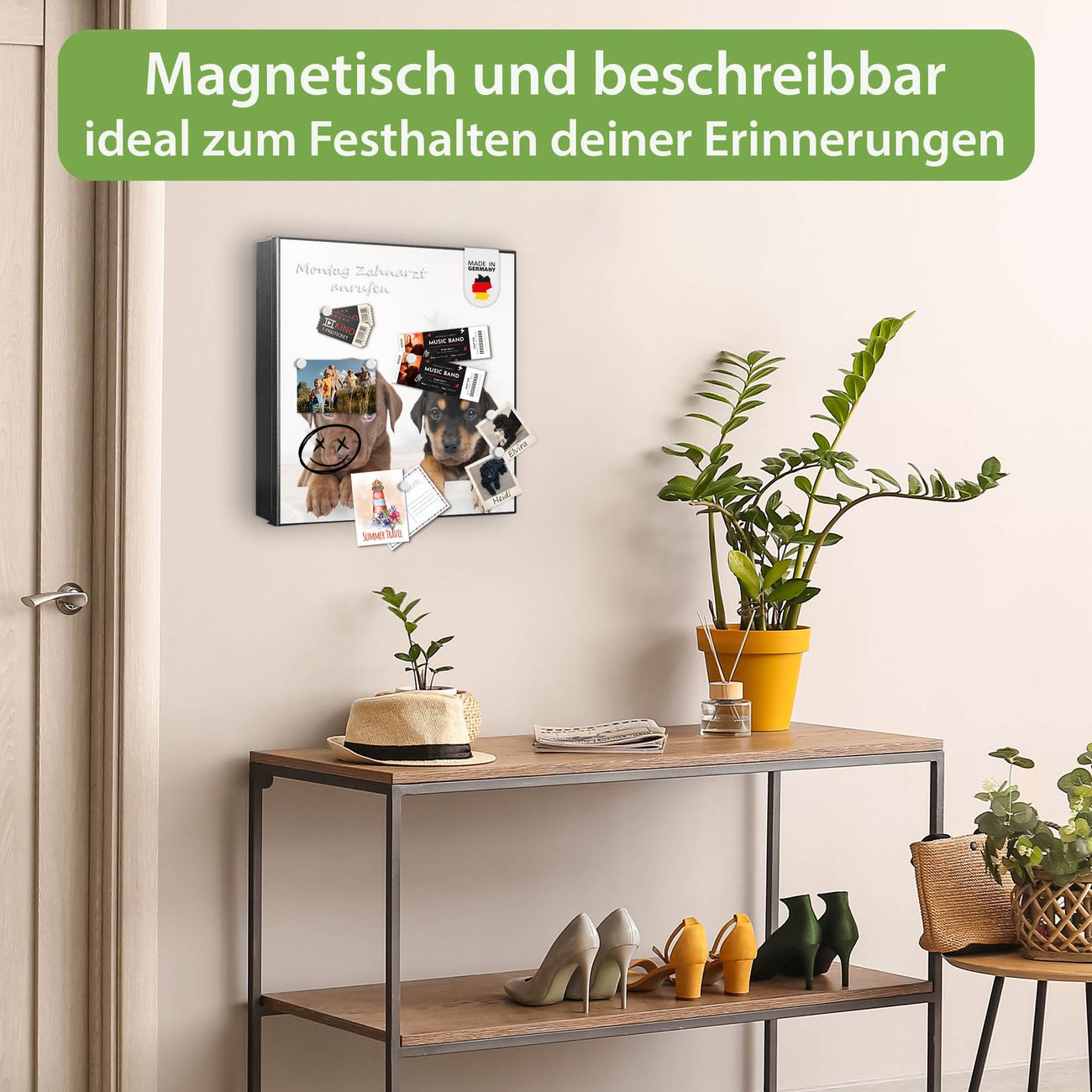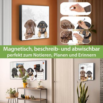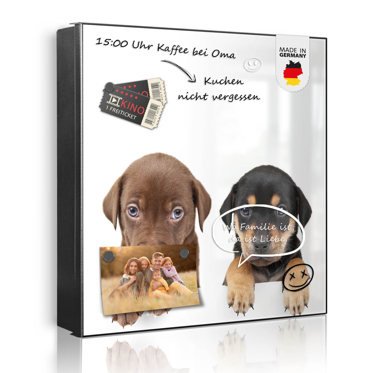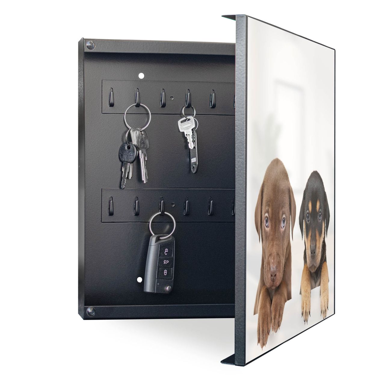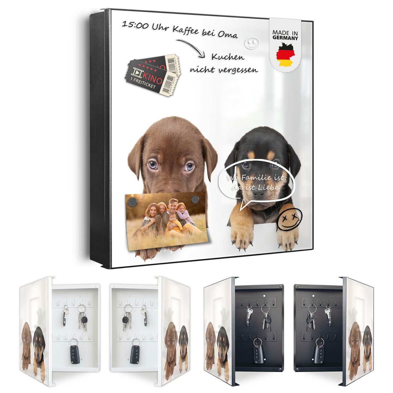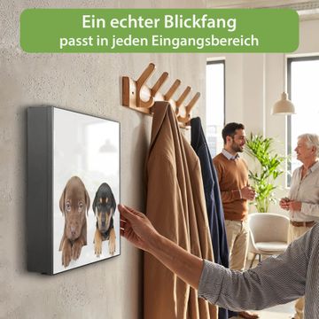 Bringe Ordnung und Eleganz in deinen Eingangsbereich mit dem banjado Schlüsselkasten Motiv Motiv Puppies. Die moderne Schlüsselbox kombiniert funktionales Design mit hochwertiger Verarbeitung und wird so zu einem echten Hingucker in Flur, Büro oder Ferienwohnung. ✅ Stilvolle Schlüsselaufbewahrung mit Motiv Motiv Puppies Der Design-Schlüsselkasten Motiv Motiv Puppies bietet Platz für bis zu 32 Schlüssel, die auf 4 stabilen Reihen mit je 8 Haken übersichtlich verstaut werden. Mit seinen kompakten Maßen von 30 x 30 x 5 cm passt die Schlüsselbox perfekt auch in kleinere Räume. Der schwarz lackierte Stahlkorpus mit rechts angeschlagenem Türscharnier harmoniert mit gedruckten Folie auf der Front und fügt sich nahtlos in jedes Wohnambiente ein. Ob als Schlüsselorganizer für Zuhause oder als praktische Lösung für Büros, Praxen und Gewerbe, der banjado Schlüsselkasten sorgt für Ordnung und Übersicht. Dank der magnetischen, mit Kreidestiften beschreibbaren Folie auf der Front kannst du Notizen anheften oder Termine direkt auf der Oberfläche festhalten. Die Schlüsselbox Motiv Motiv Puppies zur Wandmontage wird inklusive Befestigungsmaterial geliefert und ist schnell angebracht. So hast du deine Schlüssel jederzeit griffbereit und zugleich stilvoll verstaut. Mit diesem banjado Schlüsselkasten Motiv Motiv Puppies kombinierst du praktische Aufbewahrung mit stilvollem Wohndesign. Ob privat oder geschäftlich, die Schlüsselbox sorgt für mehr Ordnung, Übersicht und ein wohnliches Ambiente.Vorteile im Überblick